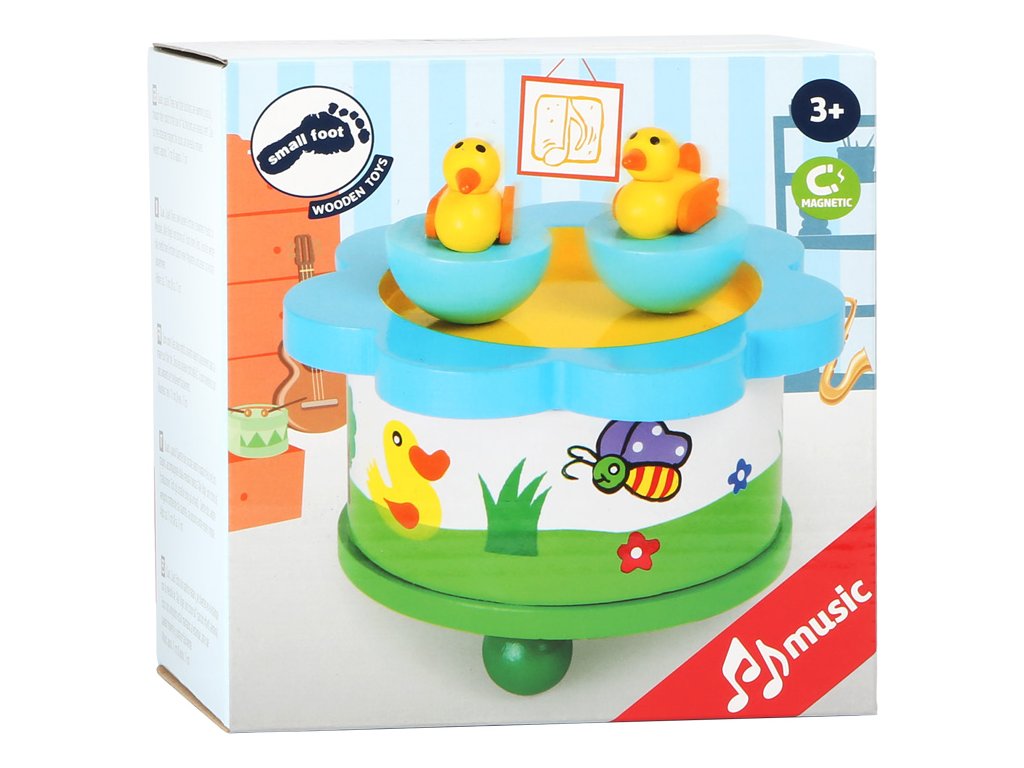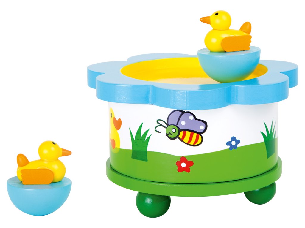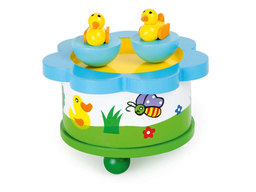 Kvák, kvák! Dvě malá káčátka rozzáří dětské oči radostí, když tančí po rybníce na libozvučnou melodii. Malé kachničky bezpečně drží na vrcholu dřevěné natahovací hrací skříňky pomocí magnetů. Lze je jednoduše oddělit a děti si s nimi mohou hrát na zemi či na stole. Díky snadnému ovládání mohou tuto hrací skříňku samostatně obsluhovat i děti. Hlavní vlastnosti: snadné ovládánípodporuje představivost