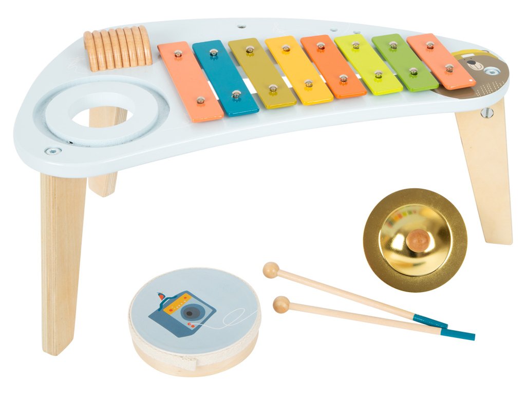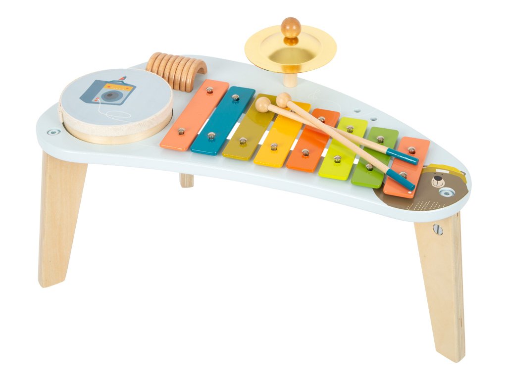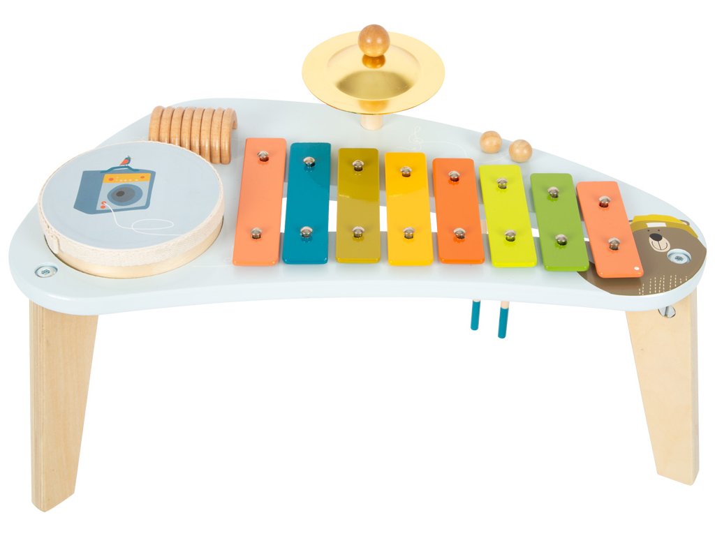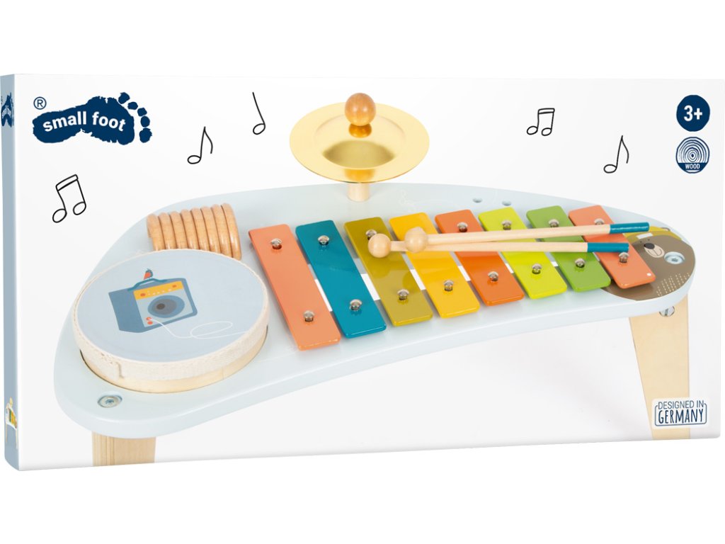 Medvěd Bruno vytváří hudbu! Tento robustně zkonstruovaný hudební stoleček stojí na třech nohách a povzbuzuje děti, aby hrály na různé nástroje a objevovaly nové zvuky s činely, xylofonem, chrastítkem a odnímatelným bubnem. Klapky xylofonu jsou barevně odlišeny, takže první písničky jsou pro děti snadné! Dodává se s robustními paličkami z masivního dřeva a notami. Je to spousta motivující hudby a zábavné učení! Vizuálně tento hudební a zvukový stoleček vyniká svým veselým designem a harmonickou kombinací přírodního dřeva a moderních modrých barev! Kromě nácviku akustického vnímání tento nástroj hravě trénuje i smysl pro rytmus, rytmiku a první porozumění hudebním tónům. Hlavní vlastnosti: Rozvíjí jemnou motoriku a kreativituHravý úvod do světa zvuku a rytmuKlapky xylofonu vydávají odlišné tónyStoleček vše v jednom