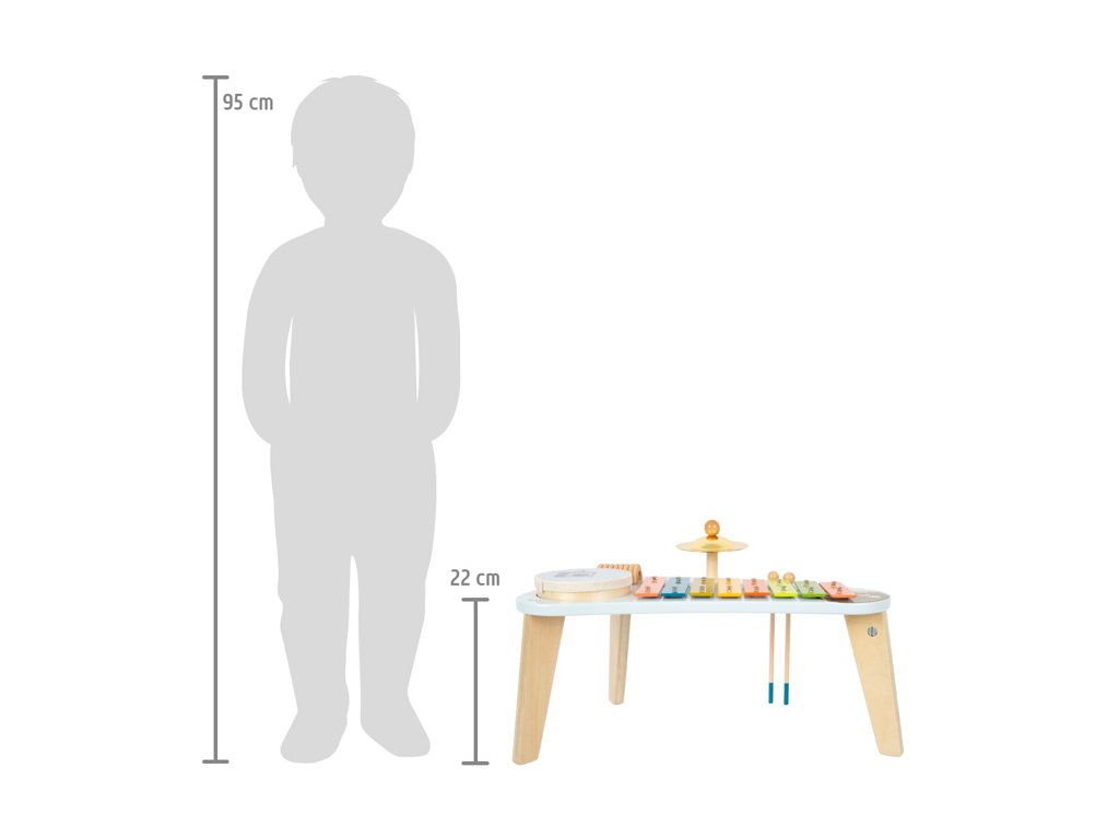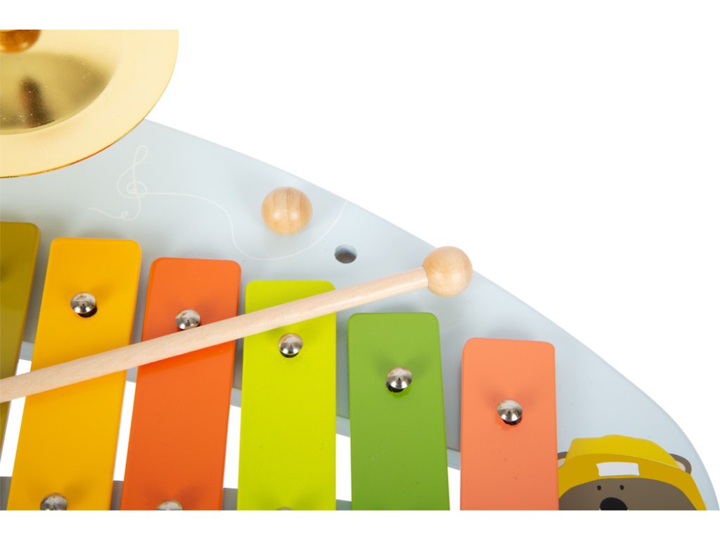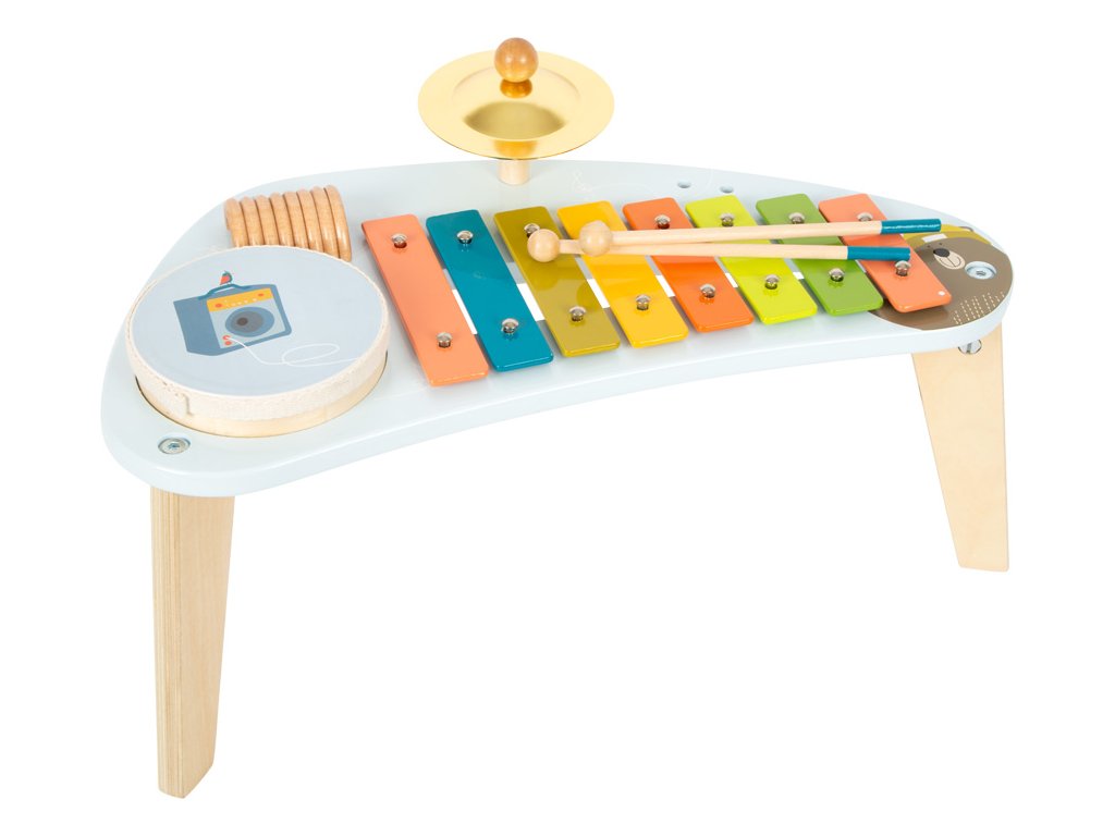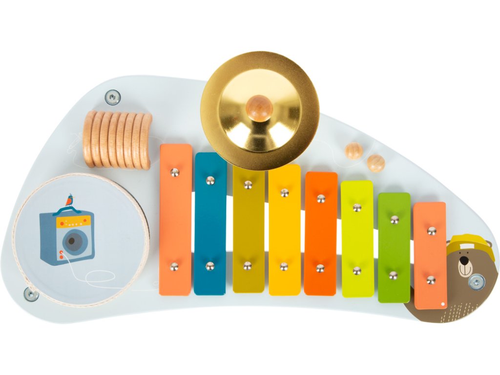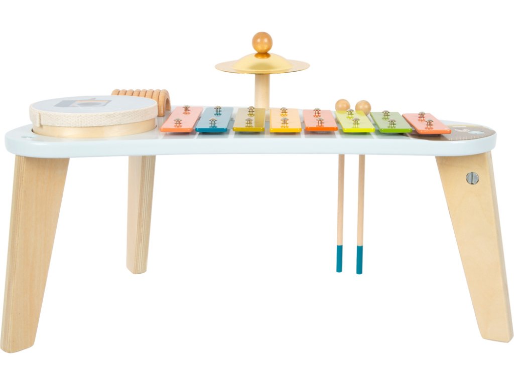 Medvěd Bruno vytváří hudbu! Tento robustně zkonstruovaný hudební stoleček stojí na třech nohách a povzbuzuje děti, aby hrály na různé nástroje a objevovaly nové zvuky s činely, xylofonem, chrastítkem a odnímatelným bubnem. Klapky xylofonu jsou barevně odlišeny, takže první písničky jsou pro děti snadné! Dodává se s robustními paličkami z masivního dřeva a notami. Je to spousta motivující hudby a zábavné učení! Vizuálně tento hudební a zvukový stoleček vyniká svým veselým designem a harmonickou kombinací přírodního dřeva a moderních modrých barev! Kromě nácviku akustického vnímání tento nástroj hravě trénuje i smysl pro rytmus, rytmiku a první porozumění hudebním tónům. Hlavní vlastnosti: Rozvíjí jemnou motoriku a kreativituHravý úvod do světa zvuku a rytmuKlapky xylofonu vydávají odlišné tónyStoleček vše v jednom