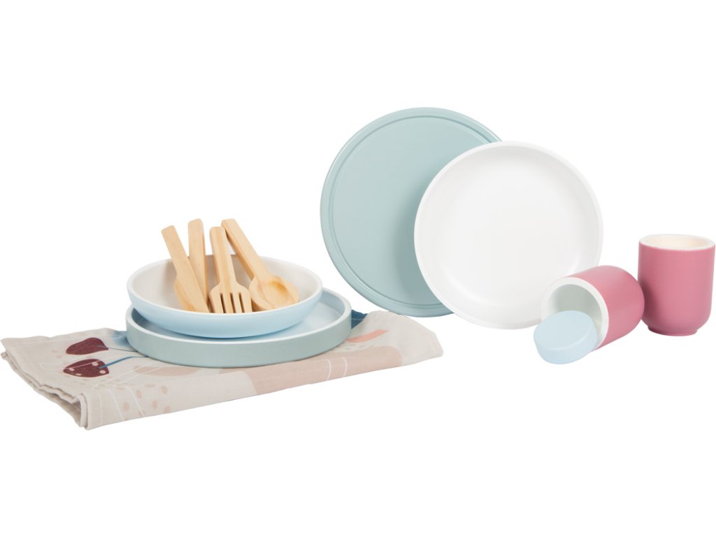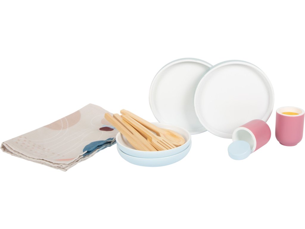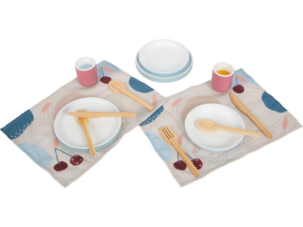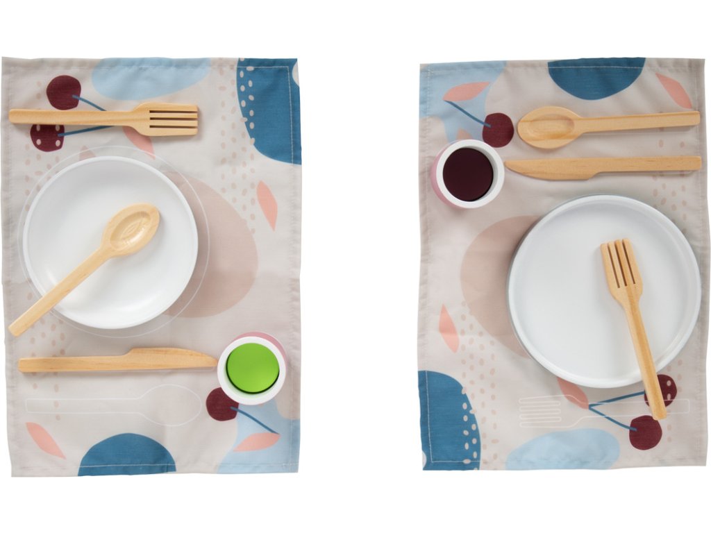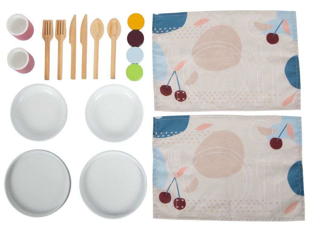 Moderní sada nádobí včetně talířů, šálků, příborů a prostírání pro dvě osoby. Vysoce kvalitní zpracování z robustního a odolného dřeva, které je vyrobeno tak, aby vám vydrželo. Nabízí další učební efekty s tištěným prostíráním, které ukazují, jak správně prostřít stůl. Moderní vzhled s lineárními tvary a kombinací přírodního dřeva s trendy barvami kouřově modré a bobulově červené. Dokonalá harmonie barvy a designu s kolekcí Tasty kde naleznete dětskou kuchyňku a další kuchyňské produkty. Pro obzvláště realistickou zábavu při hraní na role v dětské kuchyňce. Podporuje rozvoj jemné motoriky, sociálních dovedností a dalších každodenních dovedností. Díky vyváženému designu a modernímu barevnému schématu se obzvláště dobře hodí do moderního prostředí dětského i obývacího pokoje. Hlavní vlastnosti: Podporuje rozvoj jemné motoriky a sociálních dovedností Obsahuje 12 dílů