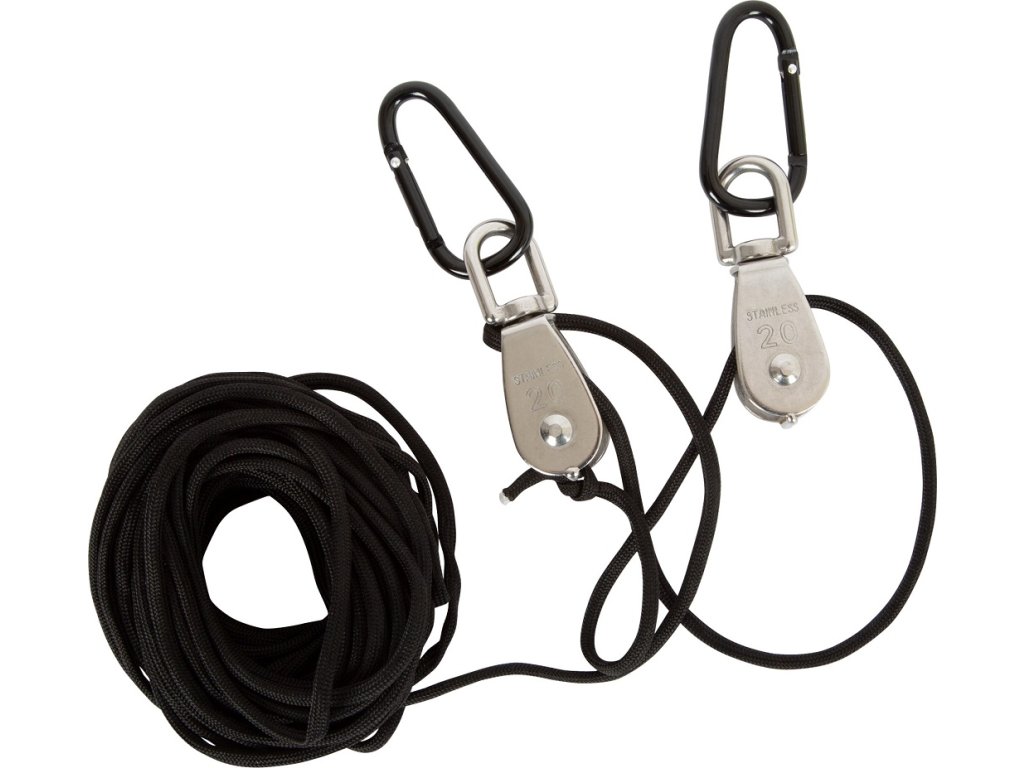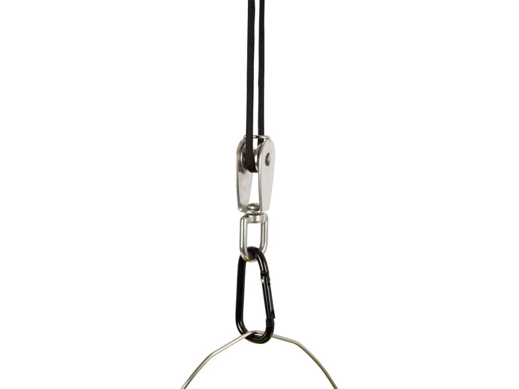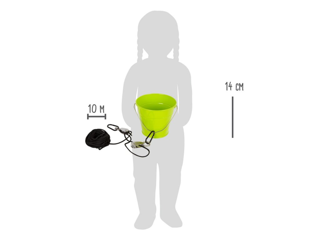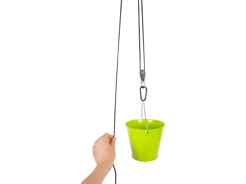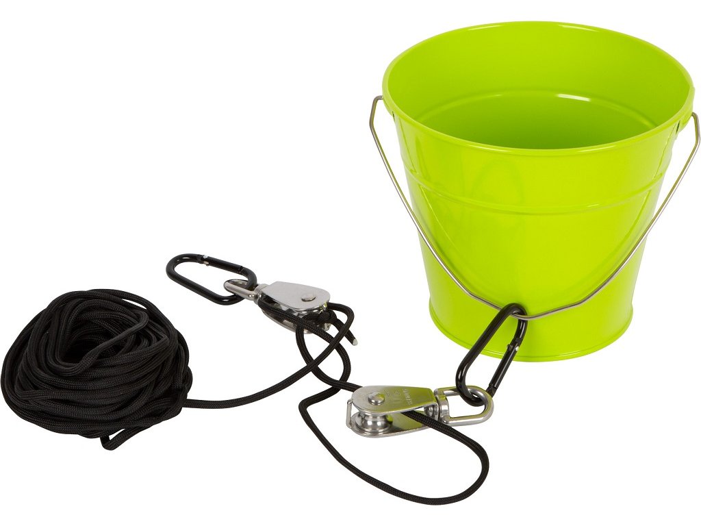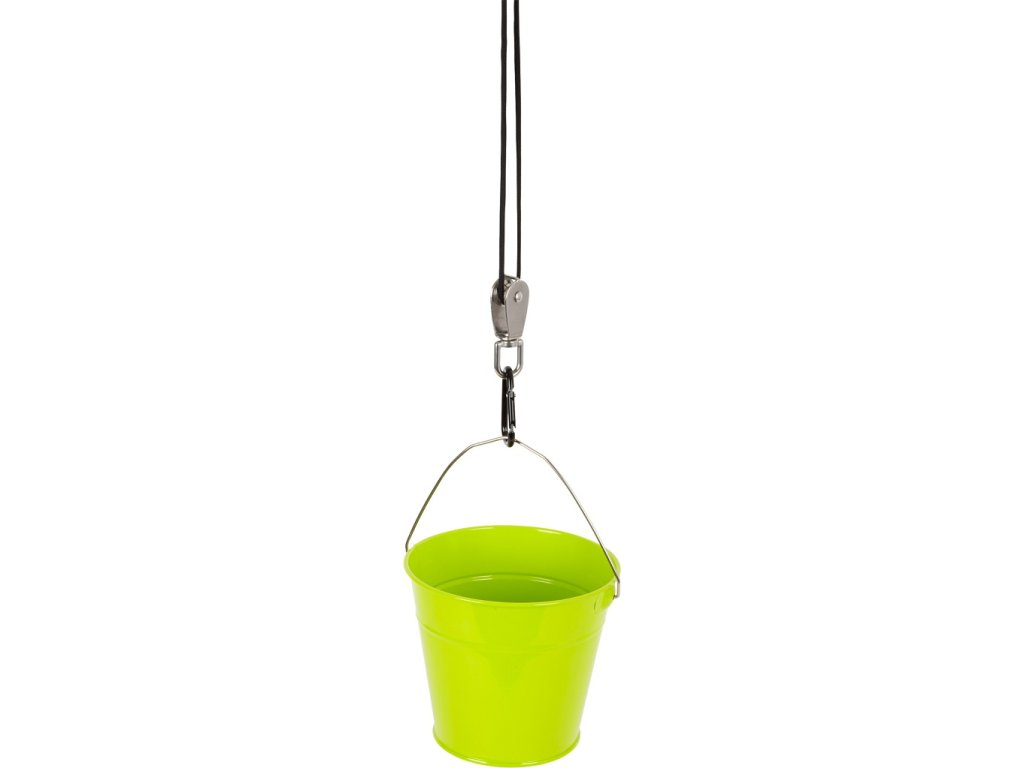 Do zahradního domečku, domu na stromě, na prolézačky nebo kamkoliv jinam! S tímto kladkostrojem se silným lanem a kovovým kyblíkem si mohou mladí dobrodruhové dopravit jakýkoliv náklad na tato zmíněná vyvýšená místa a zase zpět dolů. Děti tak nemusí opakovaně lézt nahoru a dolů. Je to zábavná hračka, která trénuje zručnost. Kovové ucho je navrženo tak, aby se karabina s lanem neposouvala. Děti se naučí, jak funguje kladkostroj a budou moci jednoduše hýbat těžkými náklady. Perfektní hračka na zahradu.