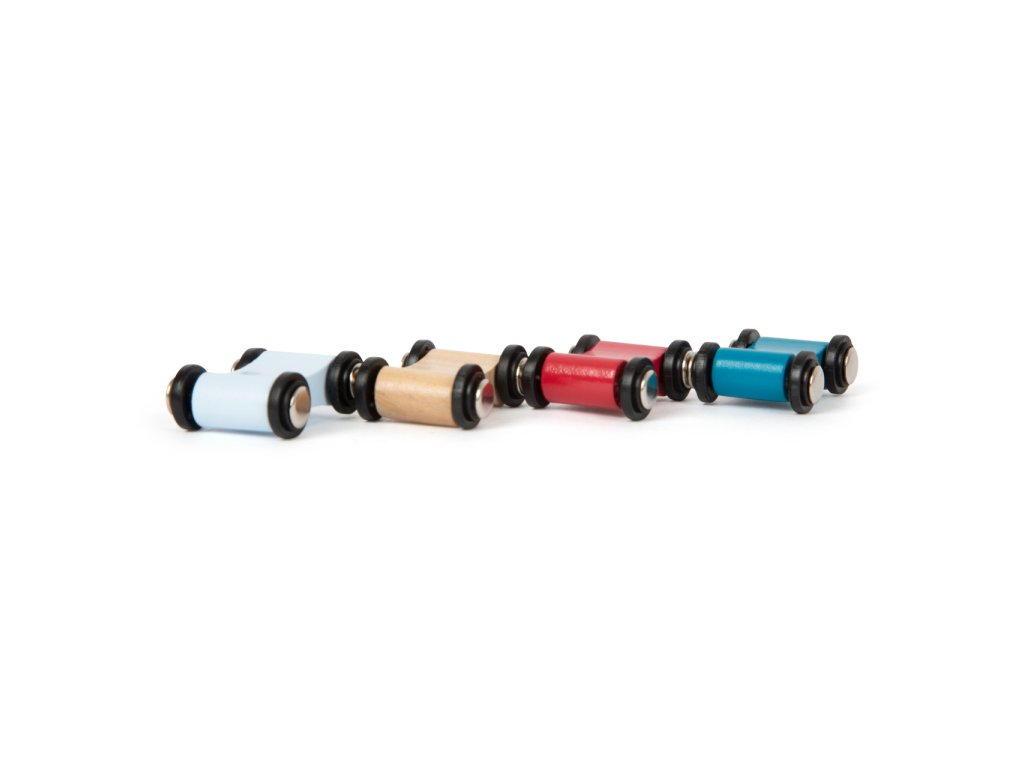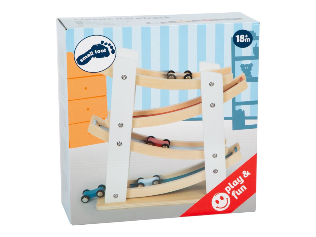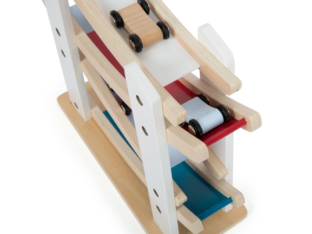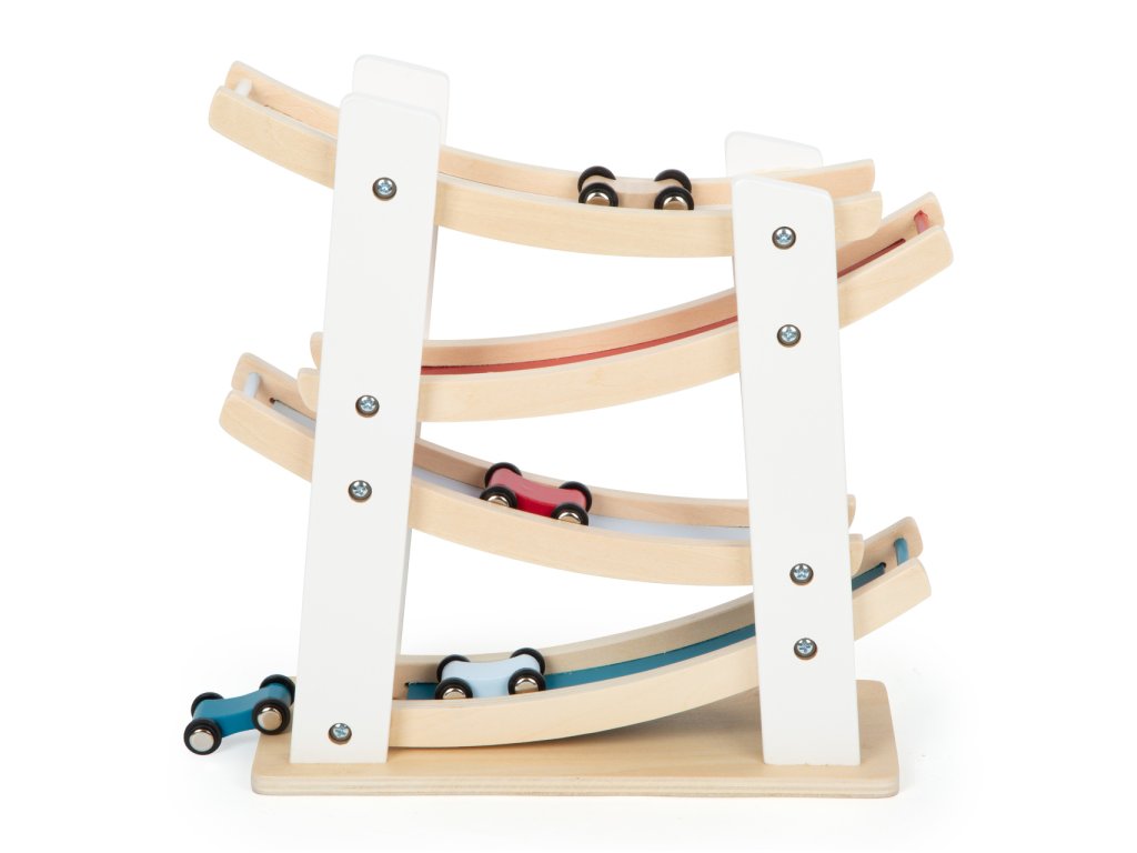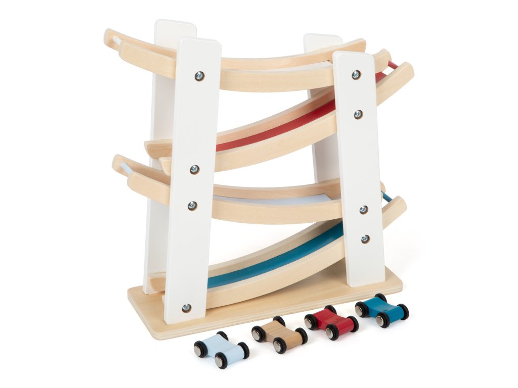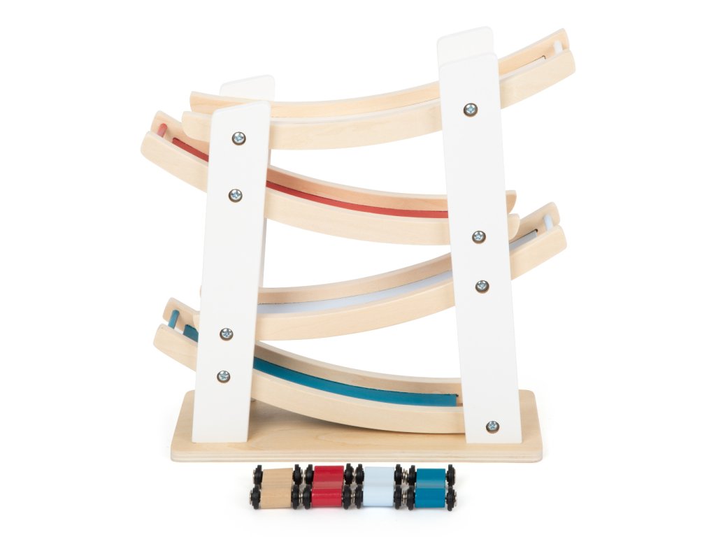 Na značky, připravit, start! Tato dřevěná kaskádová závodní dráha nabízí prostor pro změření rychlosti 4 autíček. Z jednoho patra na druhé, autíčka dělají přemety a jen koukat na ně je zábavné. Dráha je vyrobena z přírodního a bílého dřeva, jedno autíčko je přírodní, zbylé 3 jsou barevné. Hračka rozvíjí motoriku dětí, také koordinaci ruka-oko. Hlavní vlastnosti Přírodní dřevo s barevnými detailyOboustranná autíčka s pogumovanými kolyRozvíjí motoriku a koordinaci ruka-oko