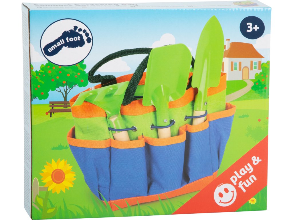 Přenosný set malých zahradníků. Tento velmi kvalitní zahradnický set obsahuje lopatku, motyku a rýč. Taška se dá jednoduše vyprat, nářadí omýt vodou. Nářadí je vyrobeno z masivního dřeva a kovu, velikostně tak akorát pro dětské ruce. Pojďme na zahradu! Taška s nářadím má 16cm na výšku. Hlavní vlastnosti: Ideální velikost pro děti Rozvíjí motoriku a vztah k přírodě Vyrobeno z kovu, dřevěná násada