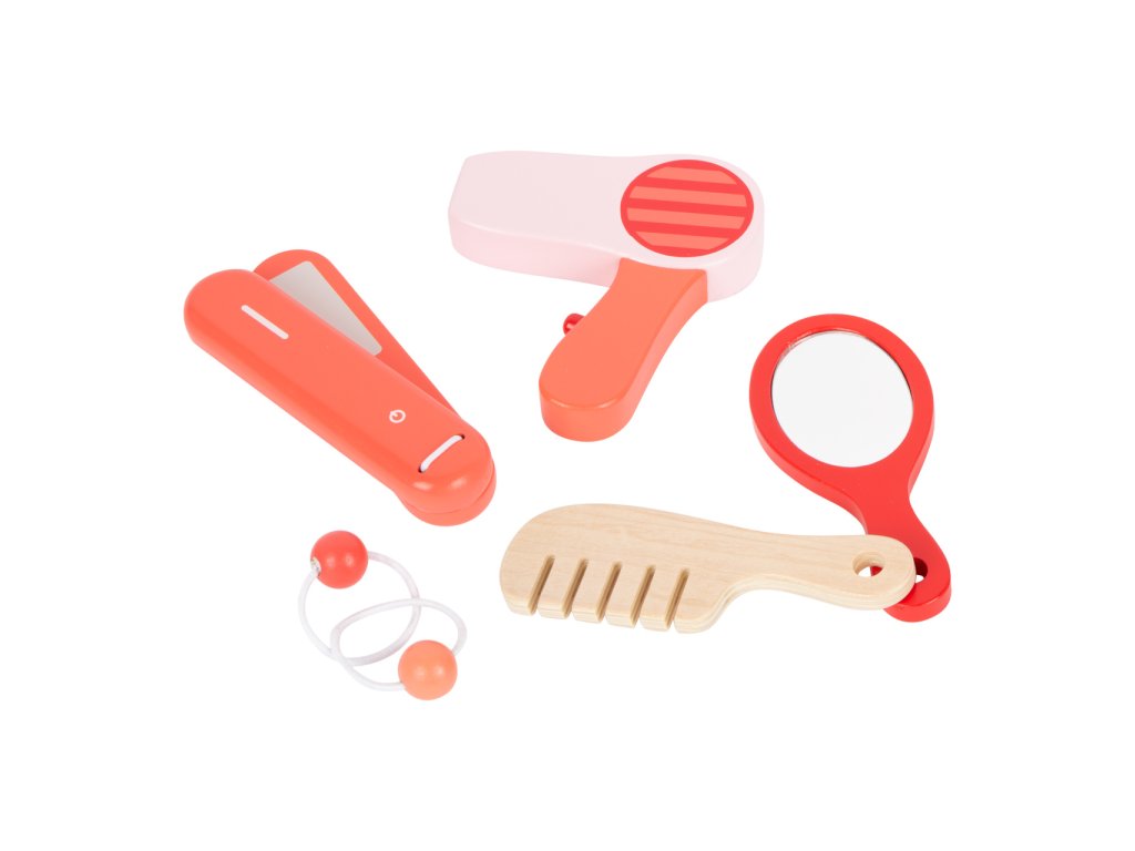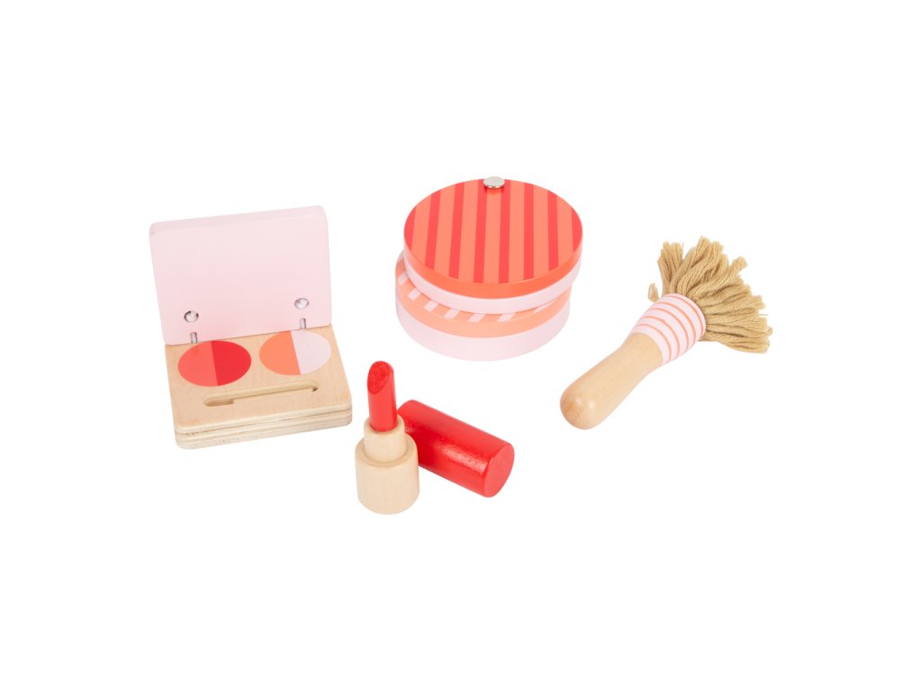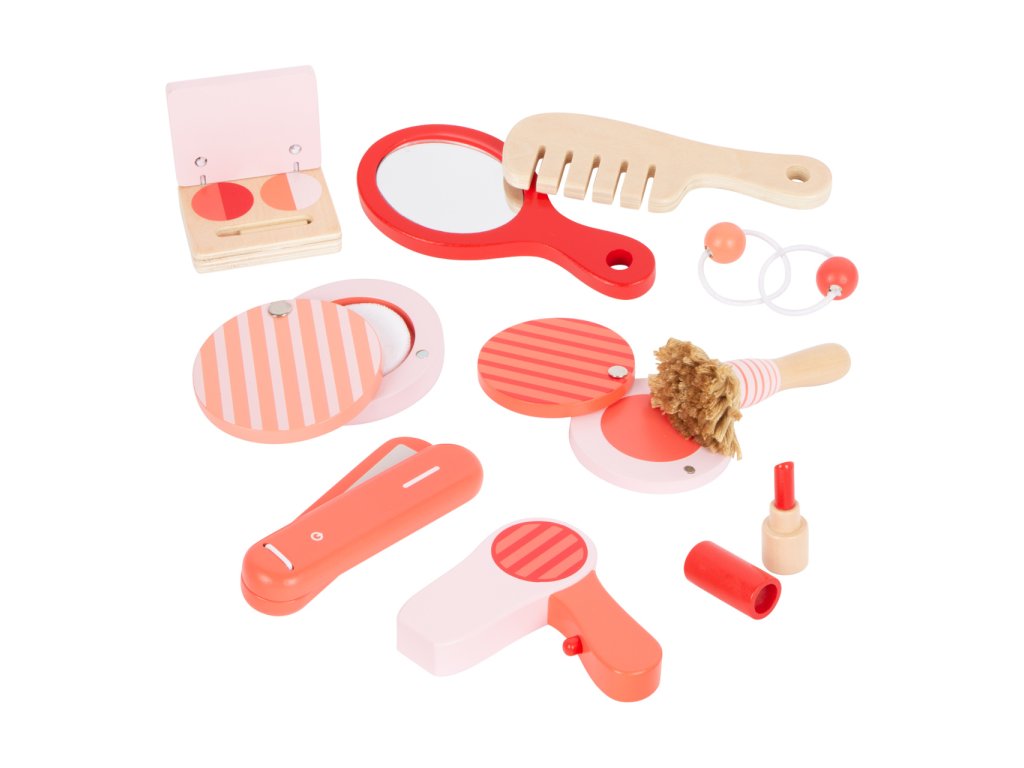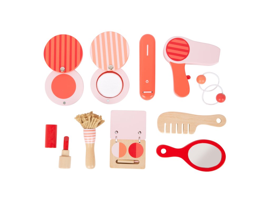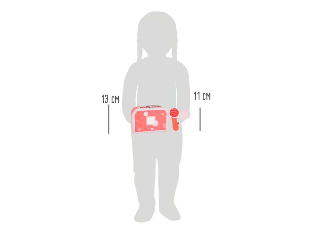 Make-up umělci a umělkyně, toto je pro vás! Kosmetický kufřík vyrobený ze dřeva je perfektní pro hraní na role. Obsáhlý set se skládá z hřebenu, zrcátka, fénu, rtěnky, pudru, očních stínů, žehličky na vlasy a také gumiček. Konečně se můžete namalovat jako maminka! Kufřík má zámek, všechny doplňky se do něj vejdou pohodlně. Kdo si nechá upravit vlasy jako první? Hlavní vlastnosti: 10 různých kosmetických pomůcekpraktické balení