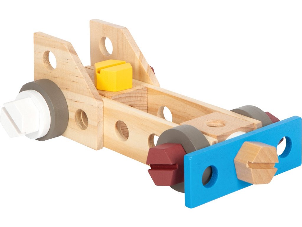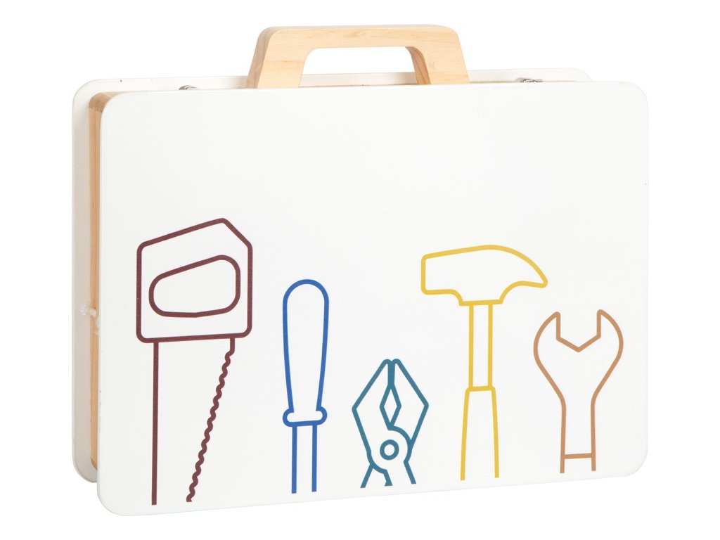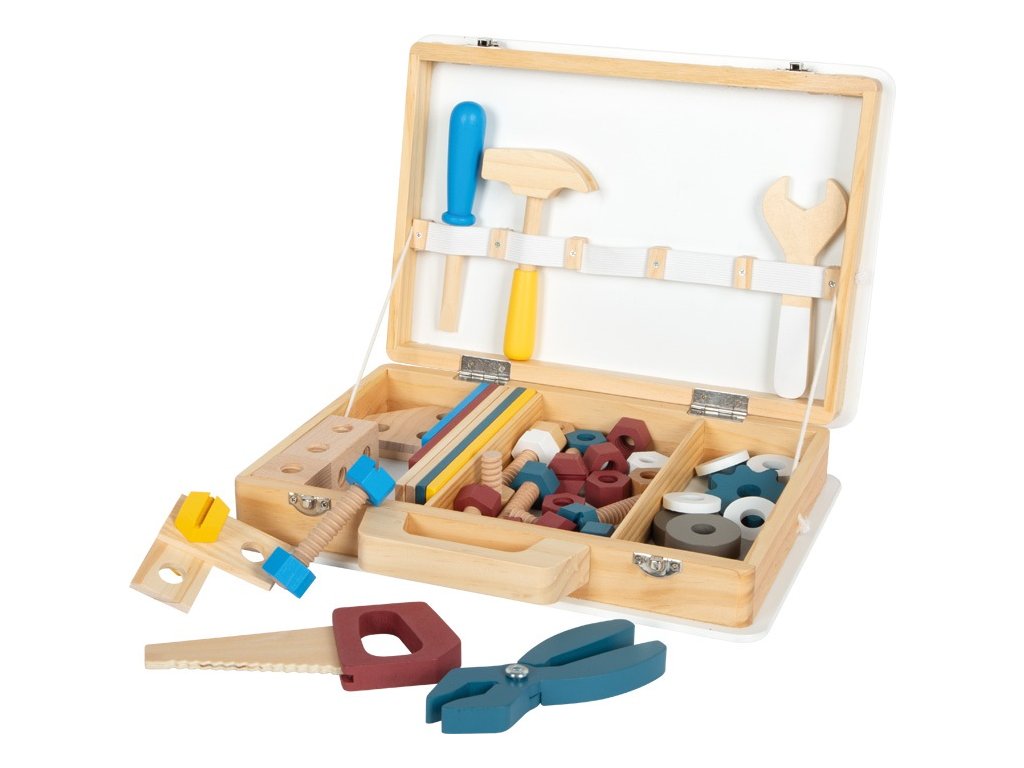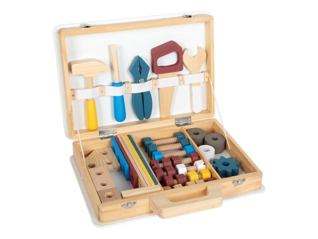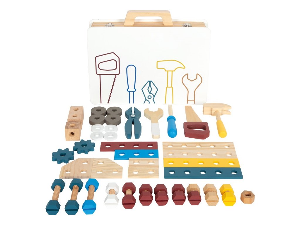 Pozor všichni malí řemeslníci i řemeselnice! S tímto dřevěným kufříkem si děti mohou hrát na kutily. Realistické nářadí a doplňky vybízejí ke kreativní hře a rozvojí fantazii. Pomocí jednotlivých stavebnicových dílků mohou děti poskládat rozmanité konstrukce (např. závodní auto, vrtulník, větrný mlýn nebo letadlo) a rozvíjet tak svou zručnost. Pevný a odolný kufřík je uvnitř vybaven gumovými popruhy, díky nimž jsou jednotlivé kousky nářadí na svém místě přehledně uspořádány. Také je kufřík opatřen kovovým zavíráním, které udrží vše bezpečně uložené a dřevěnou rukojetí přizpůsobenou ručkám malých kutilů. Sada obsahuje: kufřík, kladivo, klíč, šroubovák, kleště, pilu, 11 šroubů, 12 matic, 2 obdélníkové perforované destičky, 2 malé perforované destičky, 4 středně velké perforované destičky, 2 perforované destičky ve tvaru kosočtverce, 4 silné podložky, 4 tenké podložky, 2 ozubená kola. Hlavní vlastnosti: robustní a odolné provedení5 dřevěných nástrojů (kladivo, klíč, šroubovák, kleště a pila)komplexní příslušenství včetně šroubů, matic, ozubených kol, sady podložek a perforovaných dílů v různých tvarech a velikostechgumové popruhy v kufříku drží nářadí během přepravy pohromaděkovové zavírání zajišťuje, že se četné příslušenství neztratímnožství herních možností na cestáchtrénuje jemnou motoriku a soustředěnírozvíji fantaziipraktické a atraktivní balenískvěle se hodí k ostatním produktům řady Workshopkompatibilní s produkty řady Nordic, Miniwob