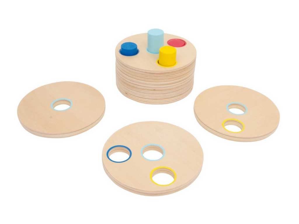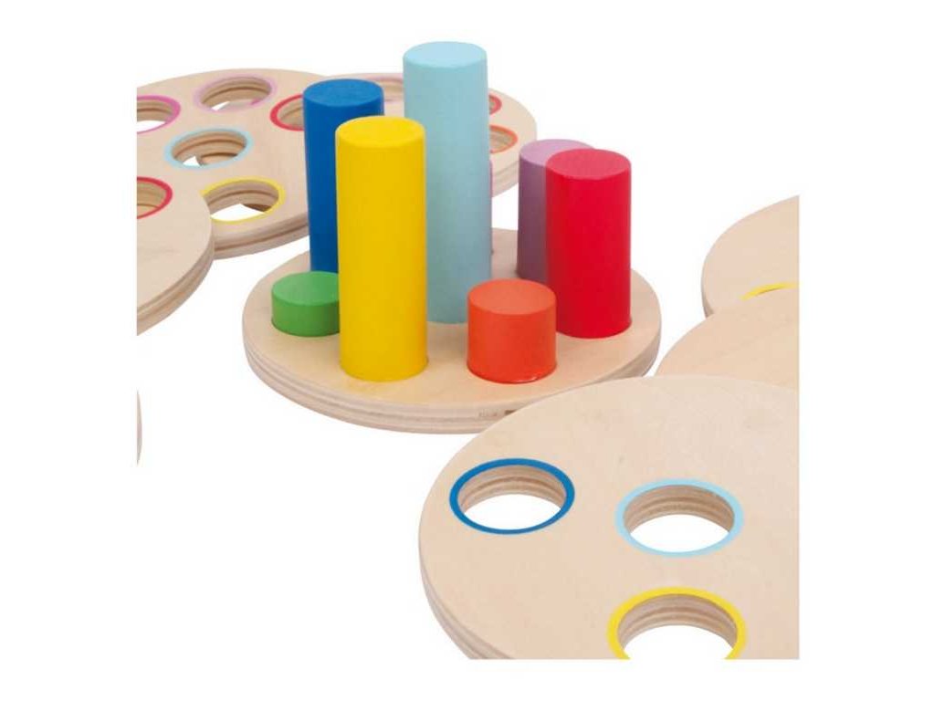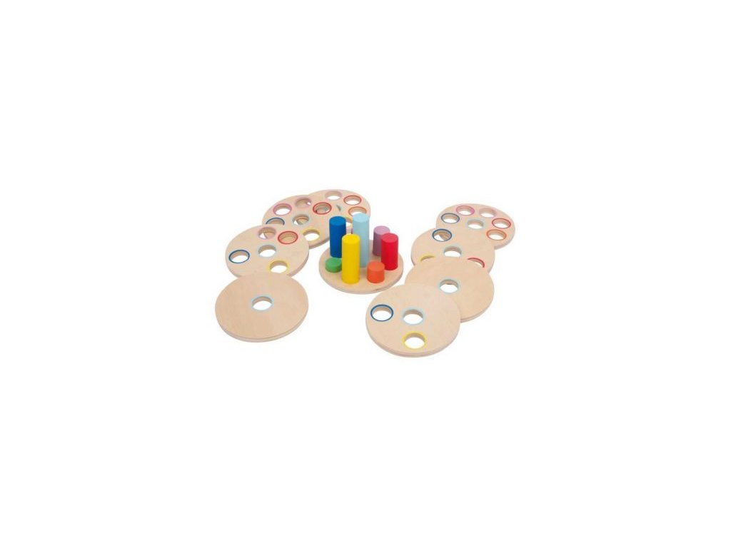 Dobře si prohlédni, přemýšlej, zkoušej a vhodně nasaď – skvělá nasouvací hra pro trénování motoriky, koordinace ruky a oka. Pevné kotouče (tloušťka 1 cm) z jemně broušené překližky mají být nasunuty na barevné tyče. Tyče jsou různých délek a každý disk má vždy o jeden otvor méně než předchozí, skládání přirozeně vede k jedinému řešení. Barevné kruhy na discích usnadňují hraní, můžou se však otočit tak, aby barvy nebyly viditelné a hra se stává náročnější. Hlavní vlastnosti: obsahuje 9 dílů (8 kotoučů a stojan)kvalitní provedenípodporuje rozvoj logického myšlení