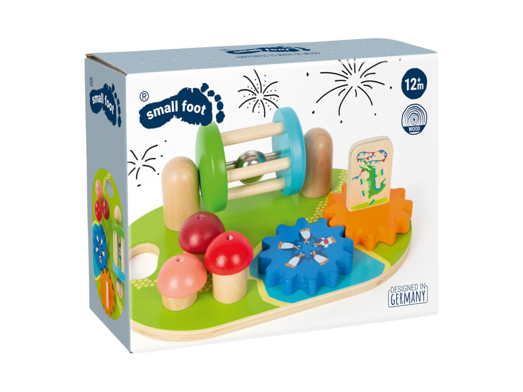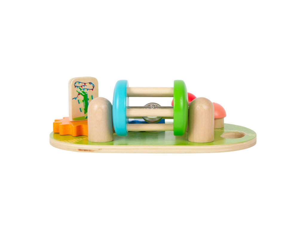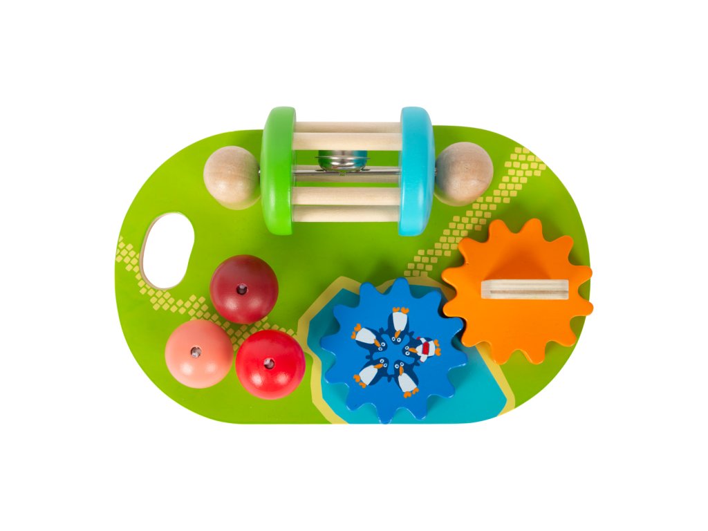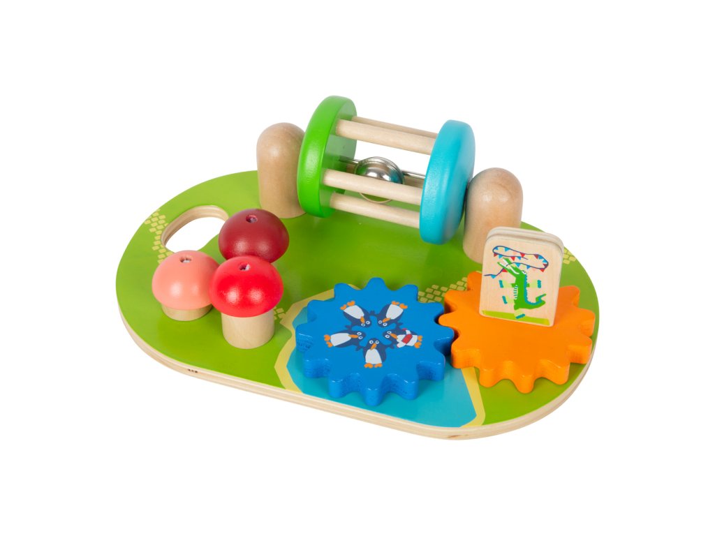 Prozkoumejte zábavní park plný atrakcí, tvarů, barev a zvuků, které podněcují zvědavost nejmenších. Otáčejte ozubenými kolečky, tahejte za kloboučky roztomilé houbičky, nebo rozehrajte rolničku. Rozmanitými herními prvky mohou děti rozvíjet orientaci v prostoru, úchopové dovednosti i koordinaci rukou a zraku. Hračka je velmi robustní, kombinuje prvky z odolné překližky a masivního dřeva. Hlavní vlastnosti:3 druhy aktivitodolné dřevěné provedenísnadná manipulace a přenášení