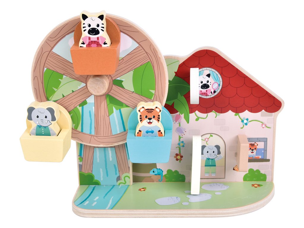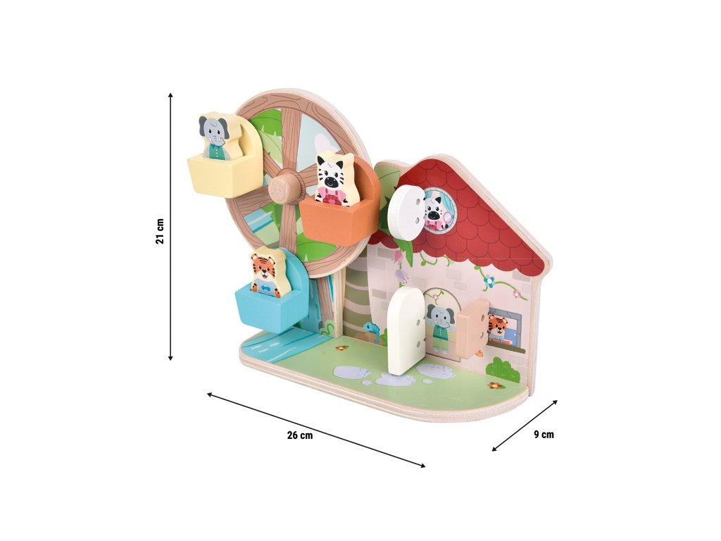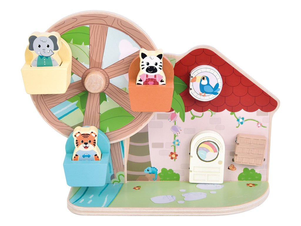 Toto krásně navržené dřevěné ruské kolo z 100% FSC® certifikovaného dřeva přináší do dětského pokoje zábavu, pohyb i učení v jednom! Tři roztomilé dřevěné postavičky – tygr, zebra a slon se vydávají na veselou jízdu na kolotoči, zatímco stejné zvířecí motivy děti objevují za třemi barevnými dvířky na přilehlém domečku.Pomocí kolečka na zadní straně se ruské kolo snadno otáčí, a děti si při hře přirozeně rozvíjejí jemnou motoriku, koordinaci ruka-oko a přesné uchopování. Tato třírozměrná motorická hra s roztomilými zvířátky a veselými barvami podporuje dětskou představivost a motivuje k aktivní hře.Motorické ruské kolo „Přátelé z džungle“ spojuje několik druhů dovedností v jedné odolné dřevěné hračce. Děti mohou umisťovat postavičky do kabinek kola, otvírat dvířka na domečku a objevovat obrázky, a díky plynule se točícím kolečku mohou kolo znovu a znovu roztočit. Hračka přináší hodiny zábavy, rozvíjí logické myšlení a podporuje samostatné objevování – ideální volba pro malé průzkumníky džungle! Hlavní vlastnosti: vyrobeno z FSC® 100% certifikovaného dřevarozvíjí jemnou motoriku, koordinaci pohybu a soustředěnípodporuje fantazii a radosti z objevování Značka a certifikát FSC® (Forest Stewardship Council) zaručuje, že dřevo, ze kterého byl produkt vyroben, nebylo vytěženo nelegálně a pochází z lesů obhospodařovaných šetrným či přírodě blízkým způsobem, ve kterém jsou dodržovány přísné environmentální a sociální požadavky. Značka FSC® na výrobku znamená, že svým nákupem pomáháte chránit lesy a podporujete šetrné, odpovědné či přírodě blízké hospodaření, díky kterému jsou naše lesy stabilnější, zdravější, mají přirozenou druhovou skladbu a lépe odolávají negativním následkům klimatických změn.