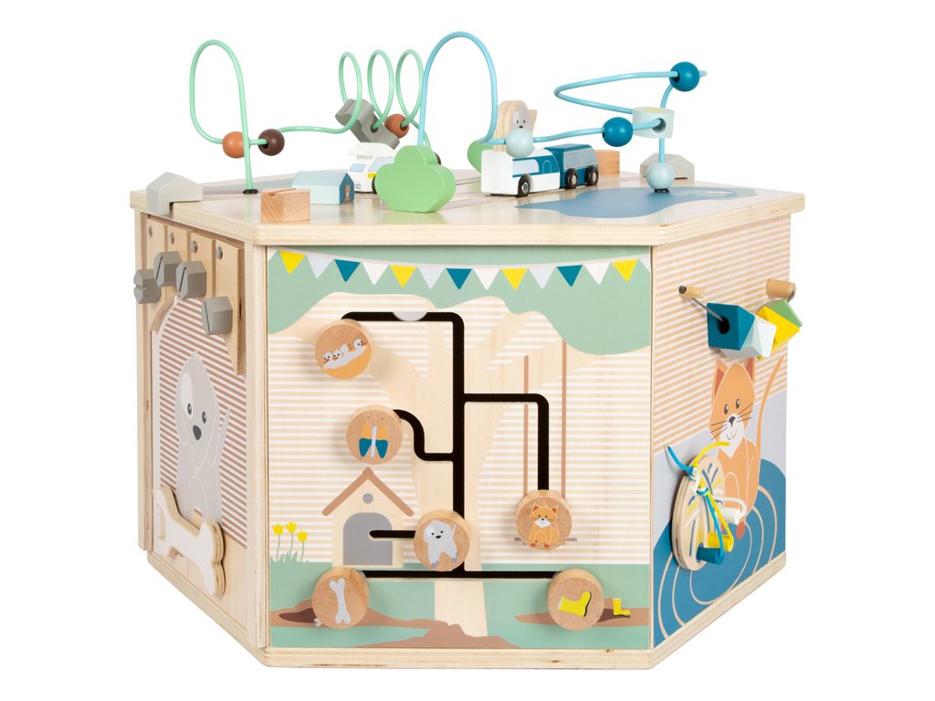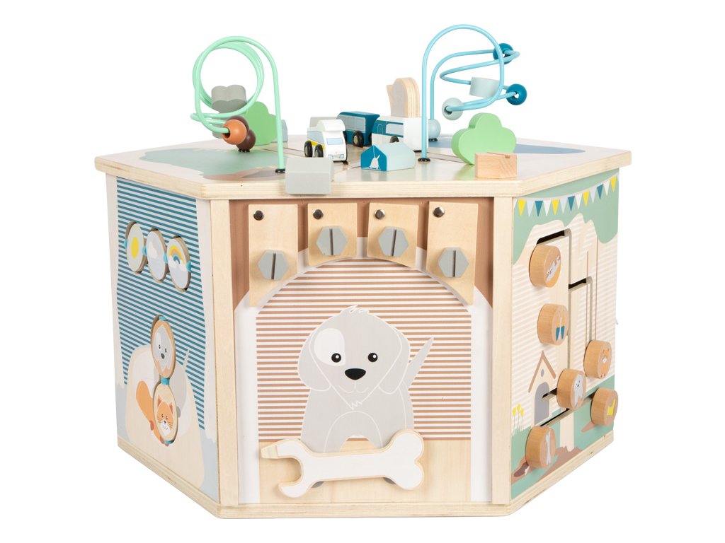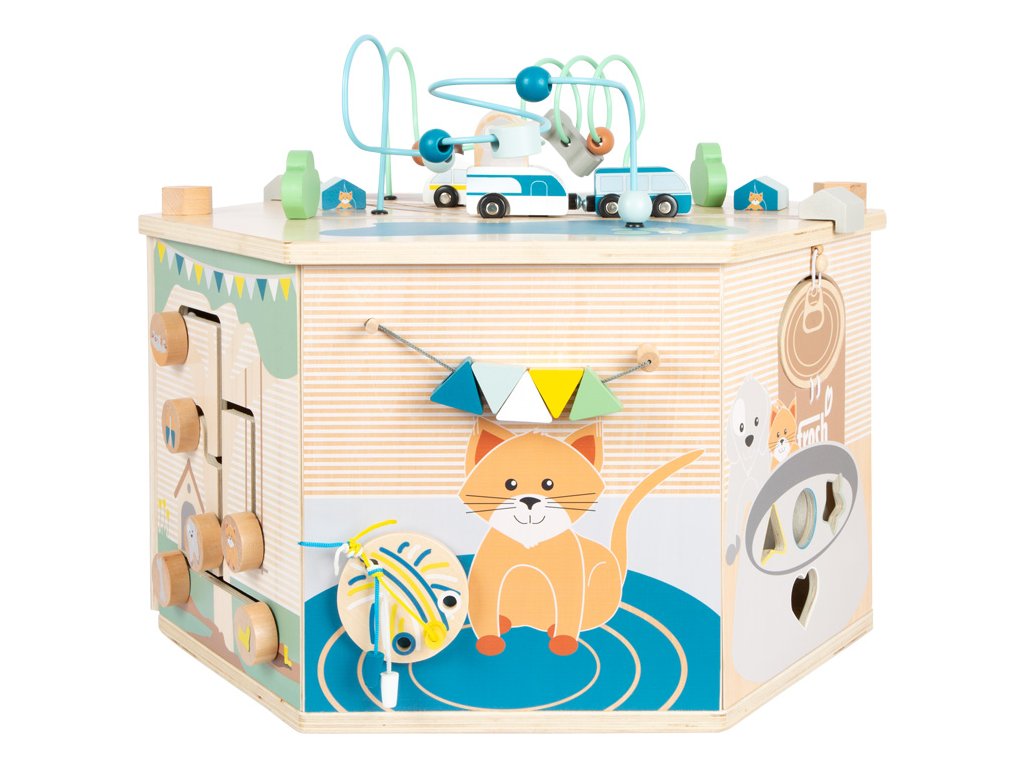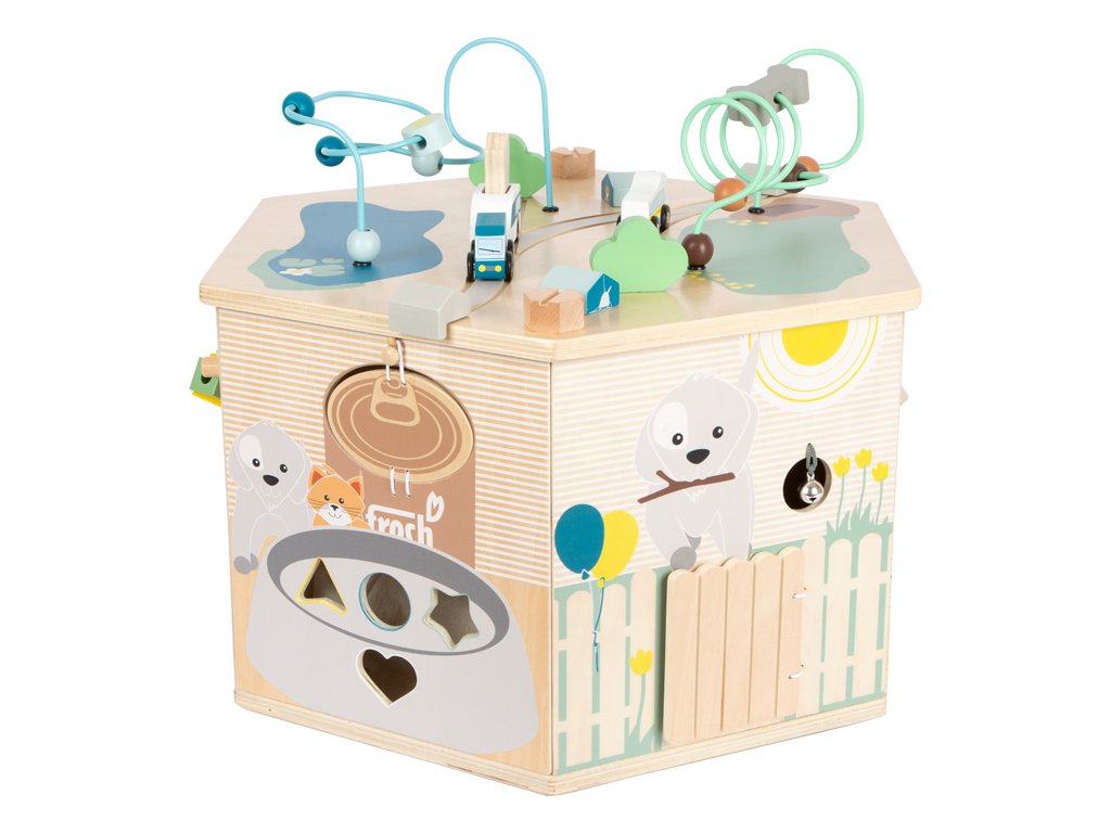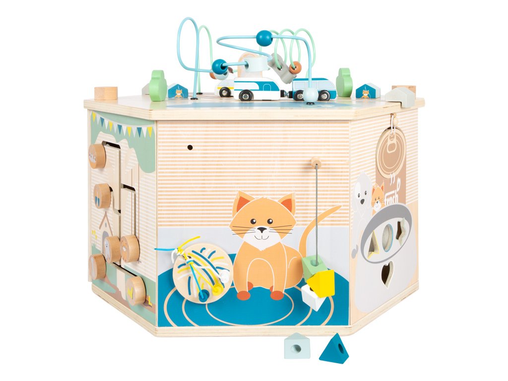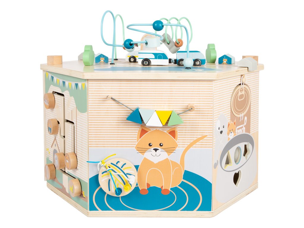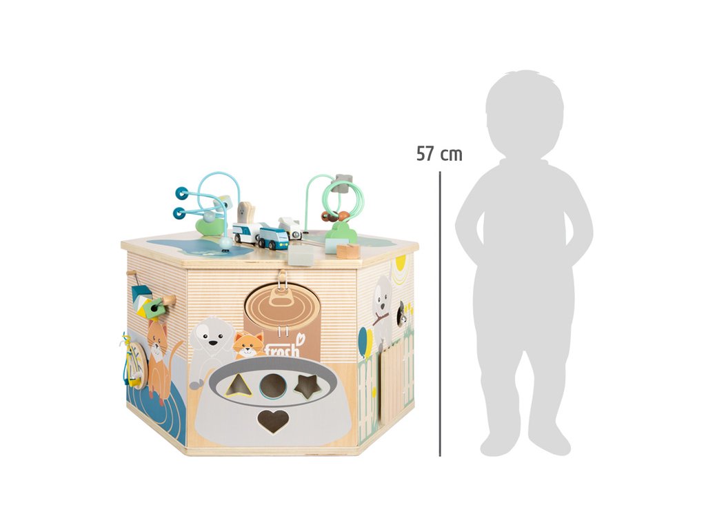 XXL motorická interaktivní kostka ve tvaru hexagonu je vyrobená z pevného dřeva a má různé aktivity na 8 stranách. Najdete zde například korálkový labyrint, vkládačku, otočné destičky, provlékačku/třídení barev a skládačku. Rolnička stimuluje sluch a trénuje sluchové vnímání. Detailní ilustrace dětem odhalí každodenní život zvířat. Oddělitelné a oboustranné víko můžete připevnit bez pomocí nářadí, na jedné straně korálkový labyrint a vláčkodráha, na druhé straně křídová tabule a ilustrace kempování. Víko také můžete použít jako podložku pro kreslení nebo při hře na zemi. Motorická kostka nabízí mnoho úložného prostoru pro vlastní doplňky - navlékací prvky, kosti pro psy, které slouží jako nářadí; velké dřevěné šrouby, vkládací prvky, dřevěné stavební kostky a figurky (křoví, psi, kočky, silniční zátarasy, rampy). V balení 3 vozidla: minibus, karavan a přívěs. Kostka má pogumované nohy, chrání tak podlahy. Jemné barvy, jasně viditelné dřevo, bude se hodit do každého interiéru. Hlavní vlastnosti: Osm stran plných aktivitTrénuje jemnou motoriku, sluch, hmatV balení 3 autíčka