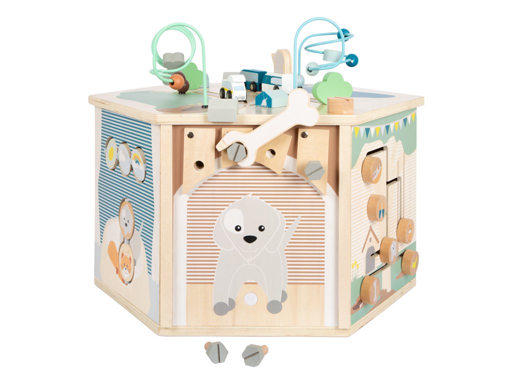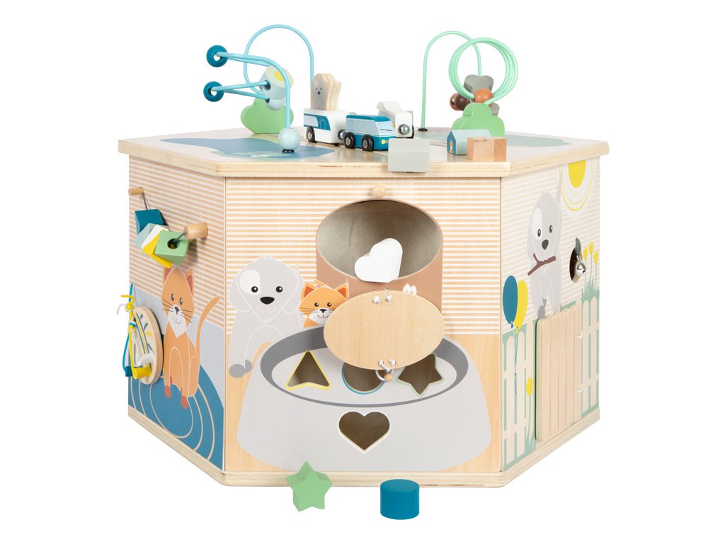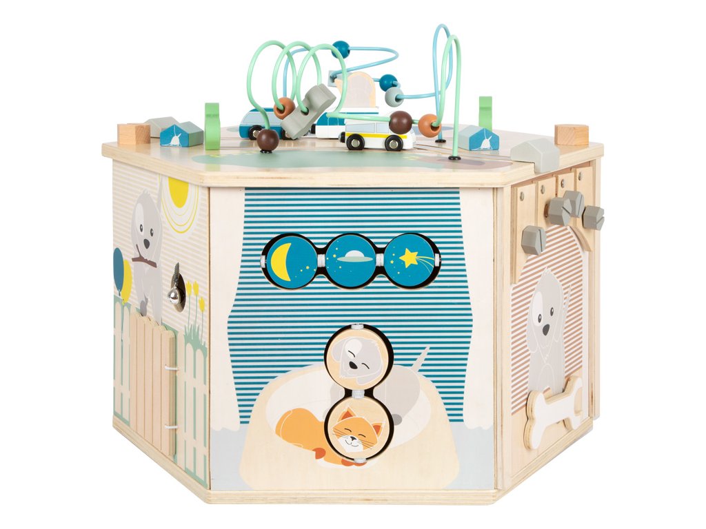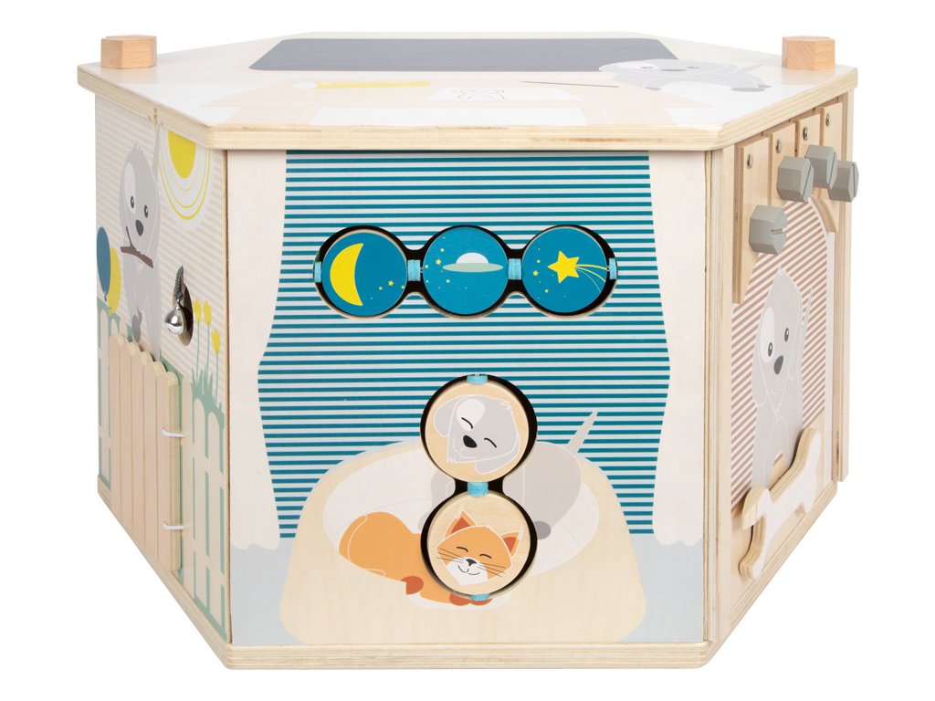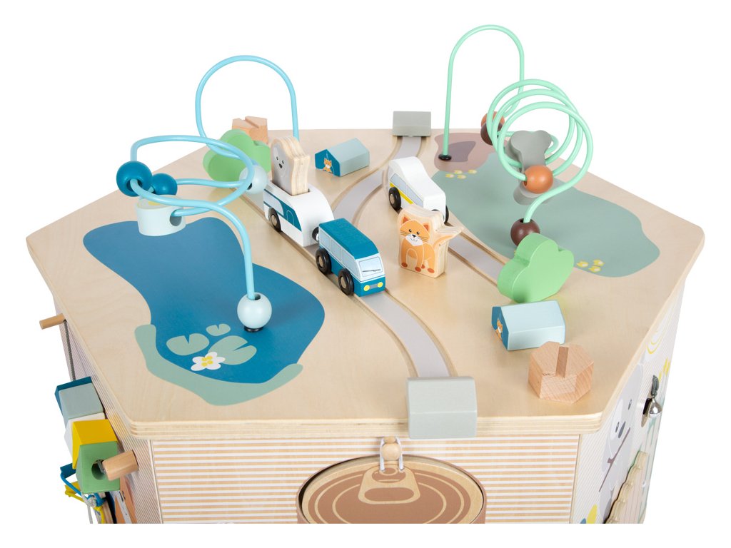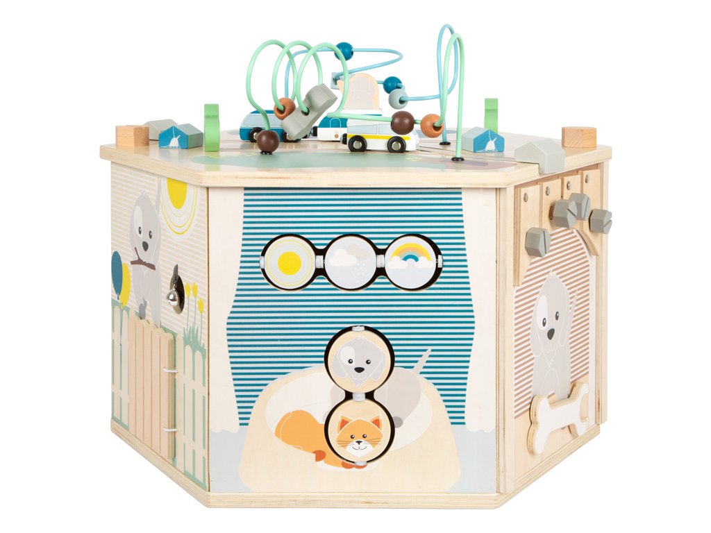 XXL motorická interaktivní kostka ve tvaru hexagonu je vyrobená z pevného dřeva a má různé aktivity na 8 stranách. Najdete zde například korálkový labyrint, vkládačku, otočné destičky, provlékačku/třídení barev a skládačku. Rolnička stimuluje sluch a trénuje sluchové vnímání. Detailní ilustrace dětem odhalí každodenní život zvířat. Oddělitelné a oboustranné víko můžete připevnit bez pomocí nářadí, na jedné straně korálkový labyrint a vláčkodráha, na druhé straně křídová tabule a ilustrace kempování. Víko také můžete použít jako podložku pro kreslení nebo při hře na zemi. Motorická kostka nabízí mnoho úložného prostoru pro vlastní doplňky - navlékací prvky, kosti pro psy, které slouží jako nářadí; velké dřevěné šrouby, vkládací prvky, dřevěné stavební kostky a figurky (křoví, psi, kočky, silniční zátarasy, rampy). V balení 3 vozidla: minibus, karavan a přívěs. Kostka má pogumované nohy, chrání tak podlahy. Jemné barvy, jasně viditelné dřevo, bude se hodit do každého interiéru. Hlavní vlastnosti: Osm stran plných aktivitTrénuje jemnou motoriku, sluch, hmatV balení 3 autíčka