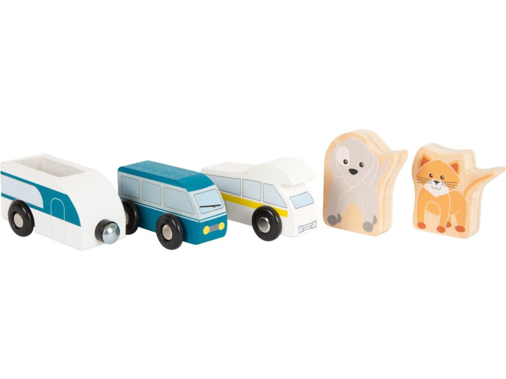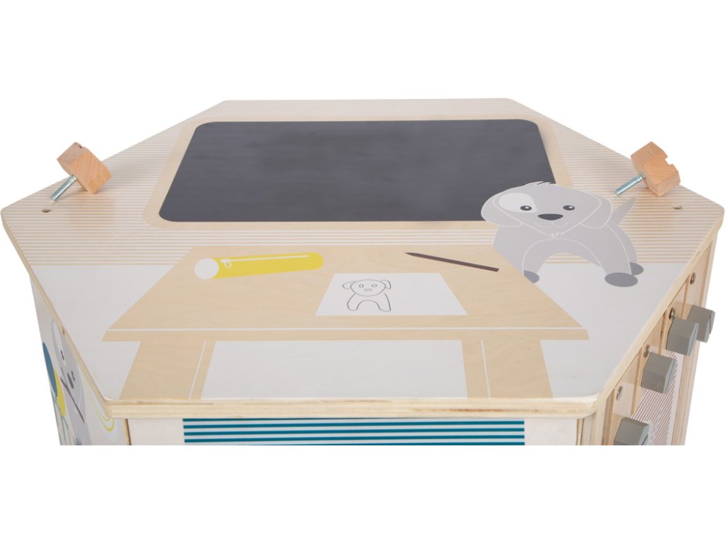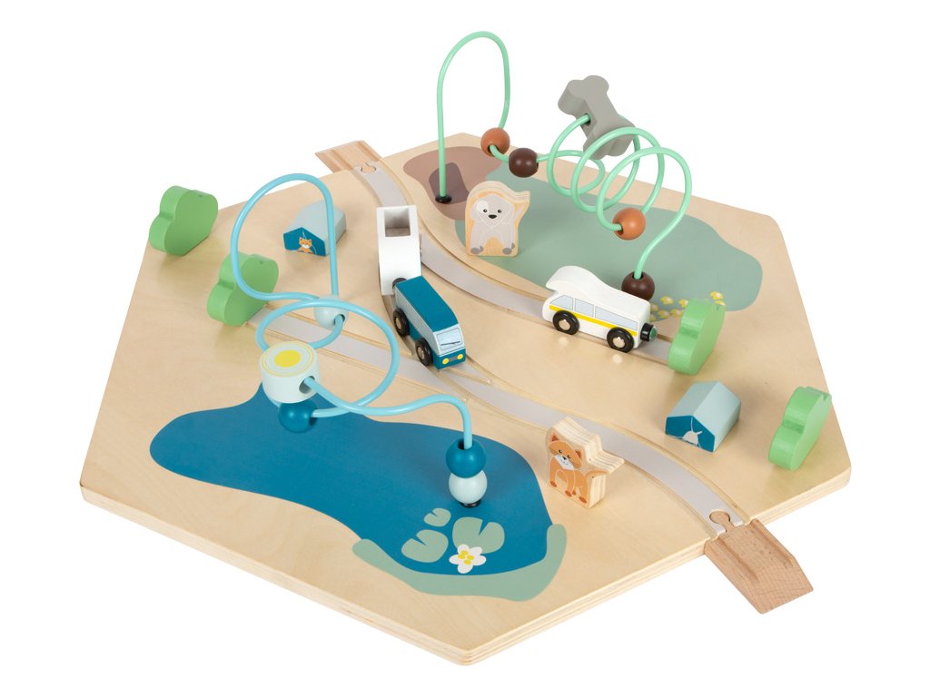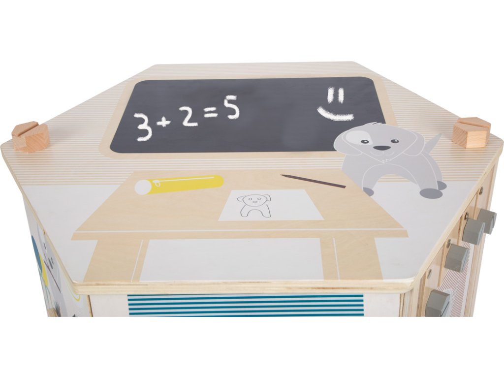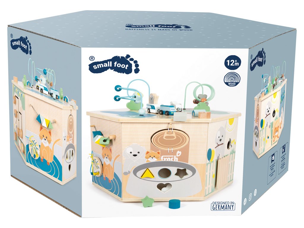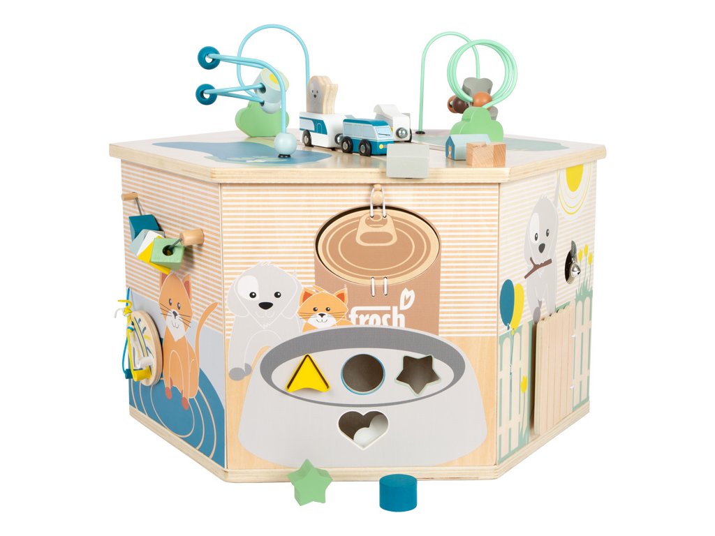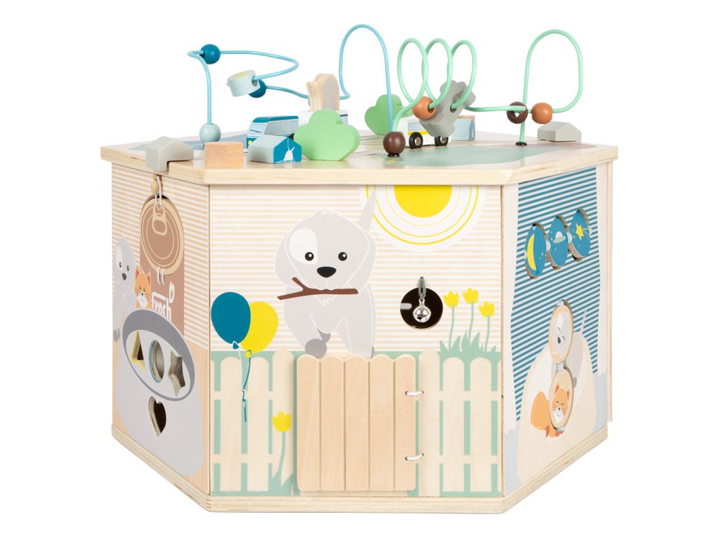 XXL motorická interaktivní kostka ve tvaru hexagonu je vyrobená z pevného dřeva a má různé aktivity na 8 stranách. Najdete zde například korálkový labyrint, vkládačku, otočné destičky, provlékačku/třídení barev a skládačku. Rolnička stimuluje sluch a trénuje sluchové vnímání. Detailní ilustrace dětem odhalí každodenní život zvířat. Oddělitelné a oboustranné víko můžete připevnit bez pomocí nářadí, na jedné straně korálkový labyrint a vláčkodráha, na druhé straně křídová tabule a ilustrace kempování. Víko také můžete použít jako podložku pro kreslení nebo při hře na zemi. Motorická kostka nabízí mnoho úložného prostoru pro vlastní doplňky - navlékací prvky, kosti pro psy, které slouží jako nářadí; velké dřevěné šrouby, vkládací prvky, dřevěné stavební kostky a figurky (křoví, psi, kočky, silniční zátarasy, rampy). V balení 3 vozidla: minibus, karavan a přívěs. Kostka má pogumované nohy, chrání tak podlahy. Jemné barvy, jasně viditelné dřevo, bude se hodit do každého interiéru. Hlavní vlastnosti: Osm stran plných aktivitTrénuje jemnou motoriku, sluch, hmatV balení 3 autíčka
