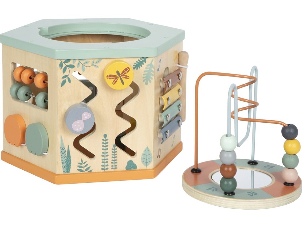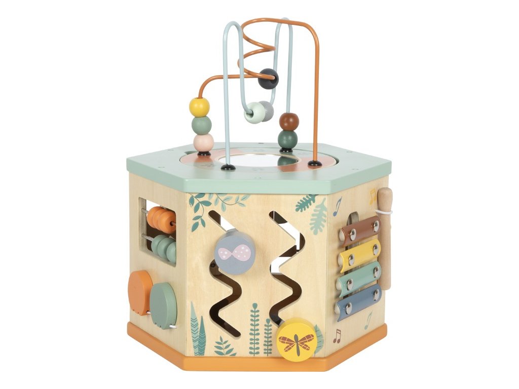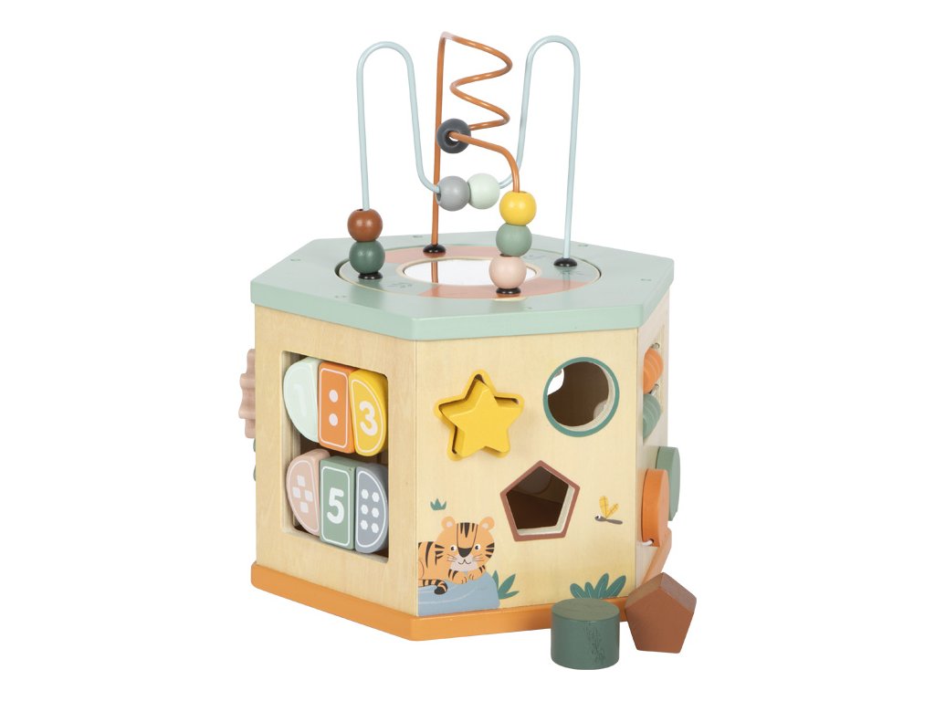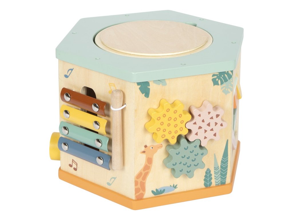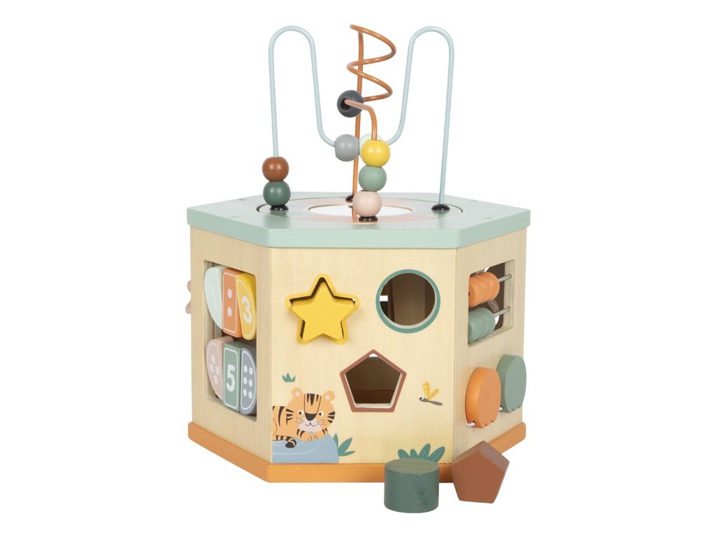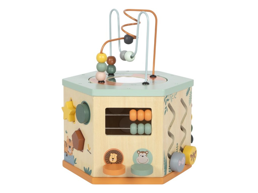 Tato motorická kostka z robustního dřeva s motivem safari nabízí spoustu činností a zábavy na sedmi různorodých plochách. Zaujme kombinací obrázků zvířátek v příjemných barvách se vzhledem přírodního dřeva. Nabízí nepřeberné množství aktivit, které stejnou měrou podporují jemnou i hrubou motoriku, jako je labyrint s barevnými korálky, posuvné labyrinty, zrcátko, vkládací kostky různých tvarů, malé korálkové počítadlo, xylofon, ozubená kolečka a další. Díky praktickému úložnému prostoru uvnitř kostky se vkládací tvary neztratí a odnímatelné víko lze otočit korálkovým labyrintem dovnitř, aby se ušetřilo místo. Palička na xylofon je ke kostce připevněna gumovým poutkem. Tuto všestrannou kostku motorických dovedností lze doplnit dalšími dřevěnými hračkami z řady Safari. Hlavní vlastnosti: atraktivní motiv safarivelké množství aktivit na 7 stěnách praktický úložný prostor na vkládací tvaryvíko s labyrintem je možné otočit dovnitřrozvíjí jemnou i hrubou motoriku ideální doplněk k dalším hračkám řady Safari