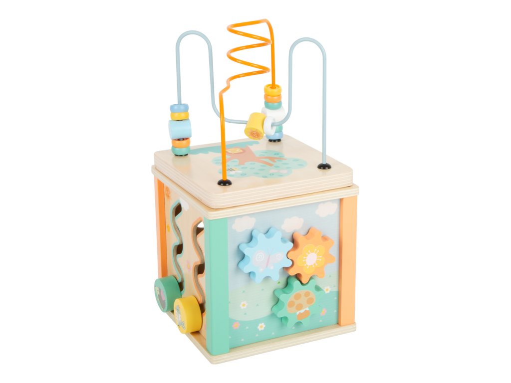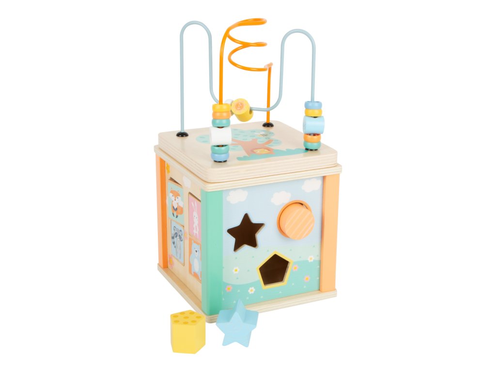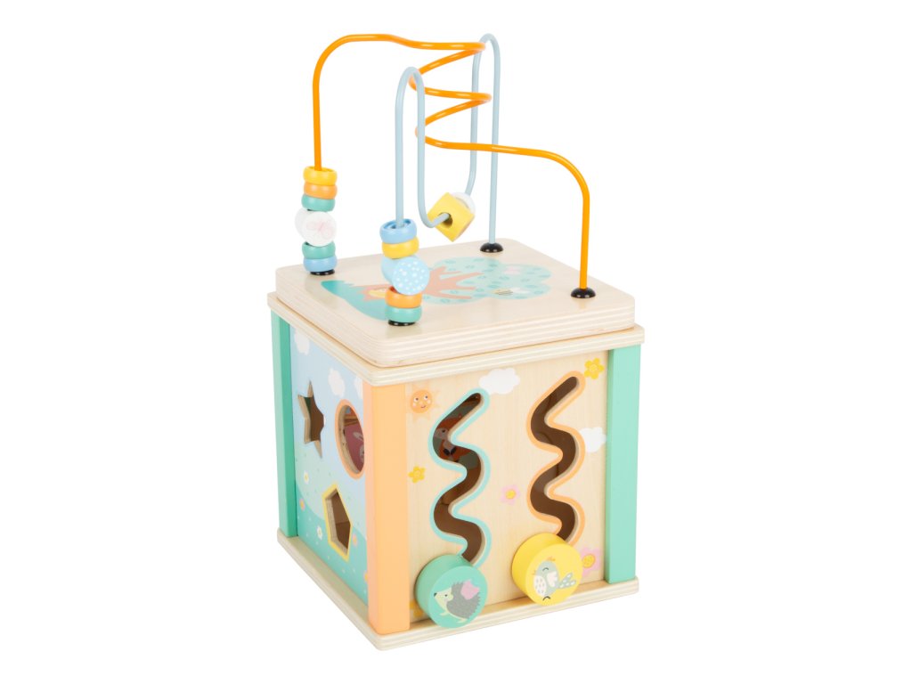 Skládejte, strkejte, klapejte, otáčejte! Můžete si hrát ze všech pěti stran! Dřevěná motoriká kostka nabídne zábavu i nejmenším dětem. Perličkové bludiště, otáčející se obrázky, otvory s kostkami pro vkládání, ozubená kolečka – všechny tyto prvky děti naučí rozevnávat barvy a tvary a také procvičí jejich jemnou motoriku. Trendy pastelové barvy, roztomilé zvířecí motivy, hravé detaily, tato kostka bude pravým poutačem v každém dětském pokojíku. Vrchní víko můžete sundat a uložit do kostky vzhůru nohama, ušetří vám tak kousek místa. Krásná motorická kostka je součástí produktové řady „Pastel“ a zaujme vysokým viditelným podílem dřeva a moderním zabarvením v pastelových barvách. Hlavní vlastnosti: ilustrováno, jemné pastelové barvykompaktní, skladné provedení