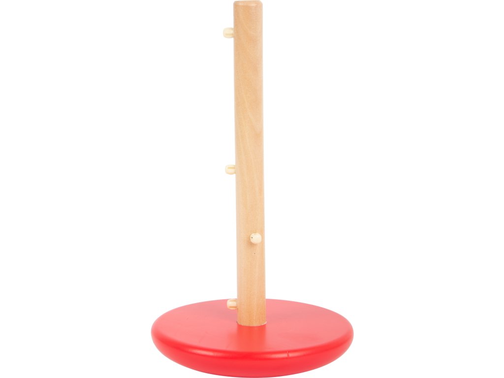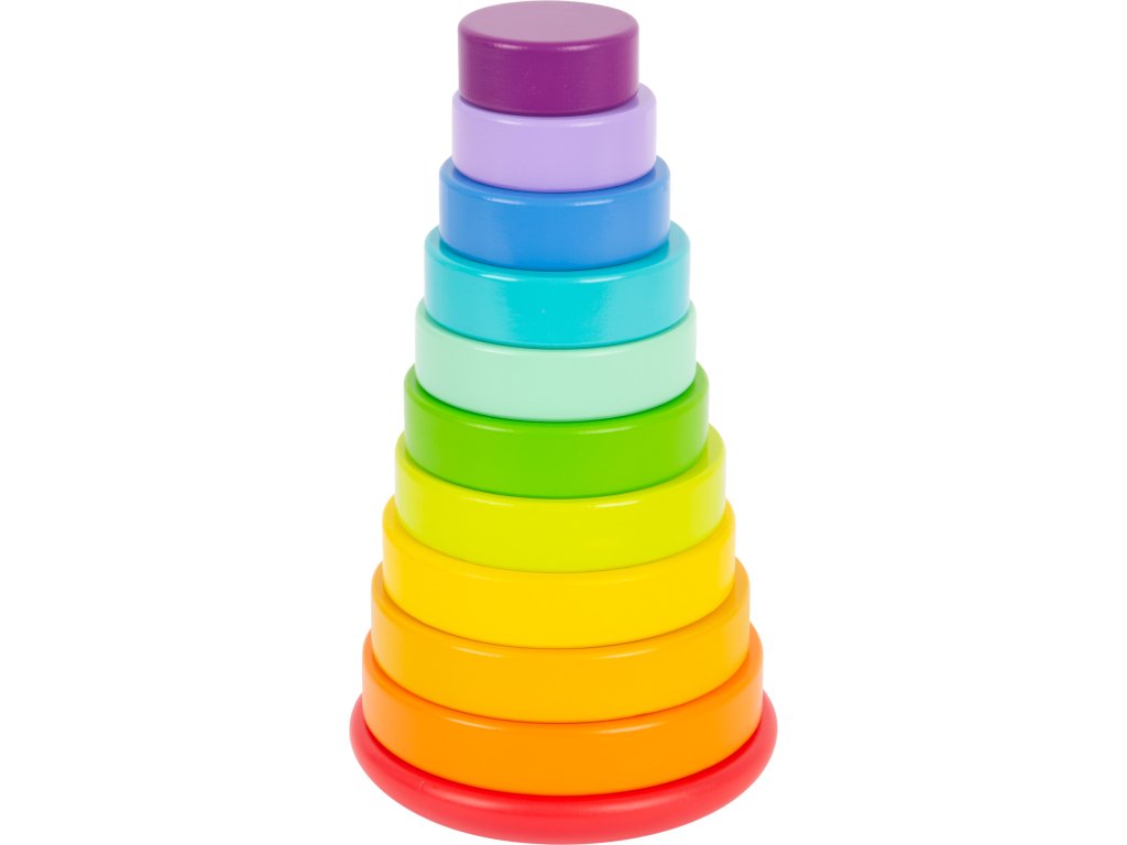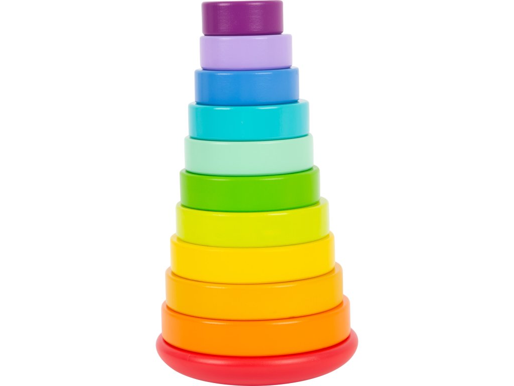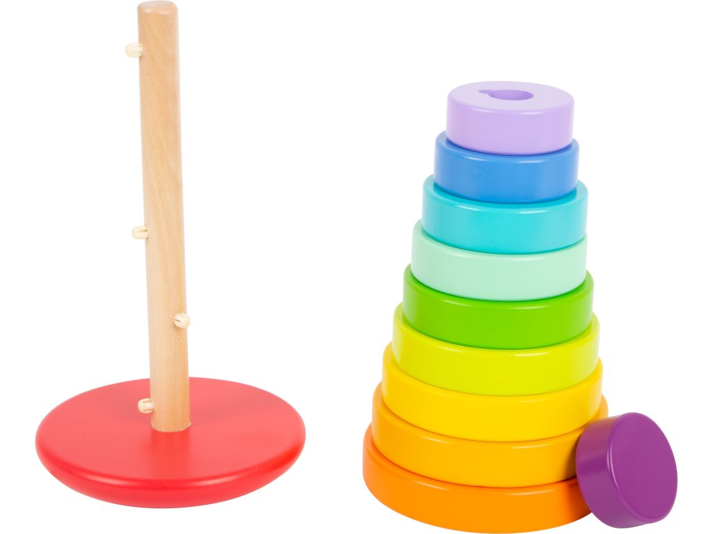 Zábavné skládání! Tato velká dřevěná nasazovací věž v barvách duhy děti jistě nadchne. Dřevěné kotouče různých velikostí musí děti naskládat na základnu s tyčí. Při nasazovaní ale musejí disky otáčet! Tyč má totiž malé výstupky. Hra dobře potrénuje jemnou motoriku dětí a také jejich logické myšlení. Díky zaoblené základně se věž při skládání houpe sem a tam. Dlouhotrvající zábava, při které se děti naučí rozeznávat barvy a tvary, také velikosti. Hlavní vlastnosti: 10 pestrobarevných disků a tyč se zaoblenou základnounáročnější verze klasické stohovací věžeprocvičuje motoriku a logické myšlení