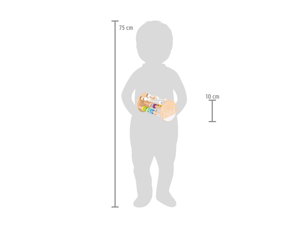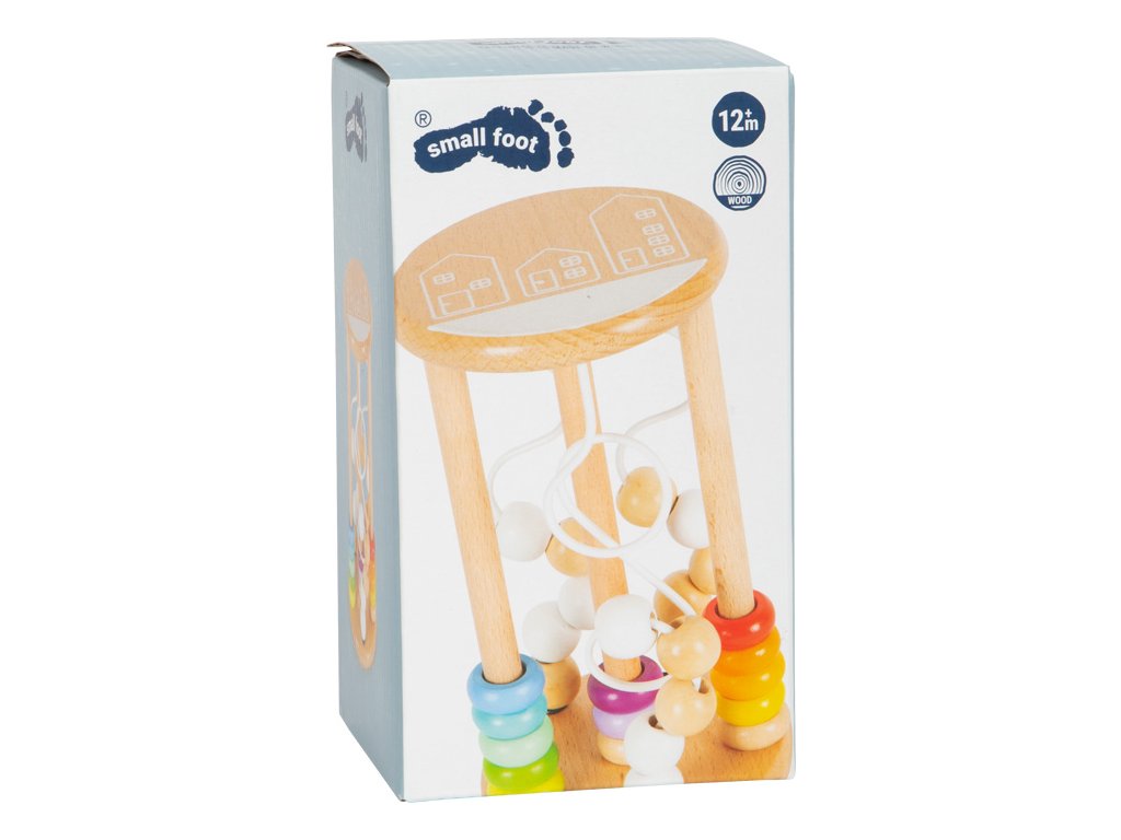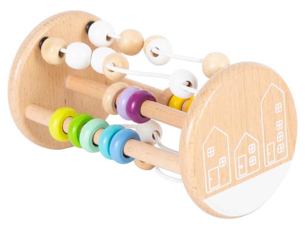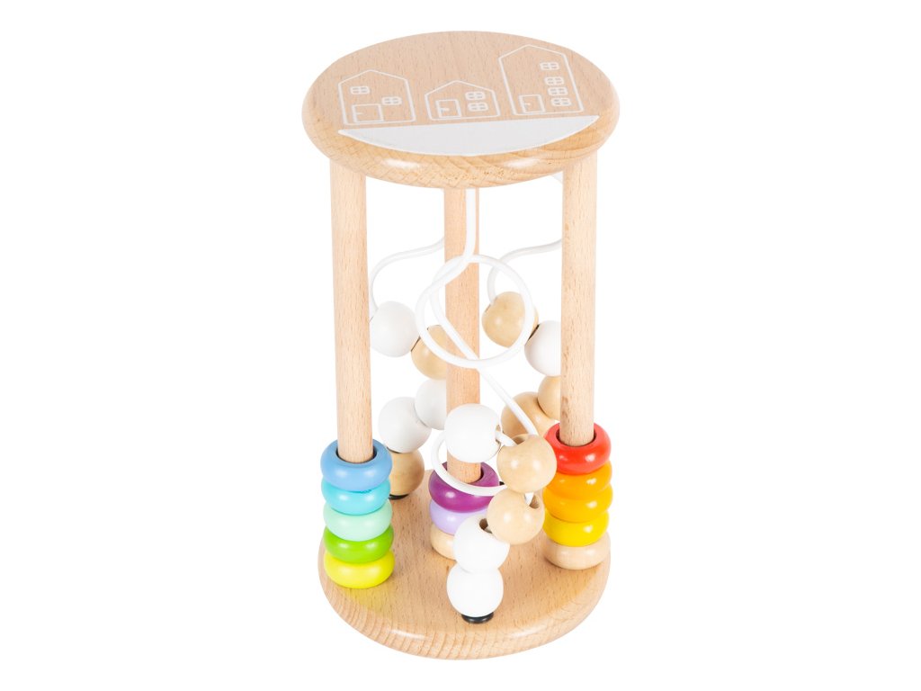 Klasická motorická hračka v duhových barvách. Dřevěné korálky se prohánějí po propletených drahách. Při zatřesení se navlečené prvky pohybují do rytmu a vydávají chrastivé zvuky. Hlavní vlastnosti: tři klikaté a tři rovné dráhy pro barevné korálkykvalitní dřevěné provedeníduhové barvy