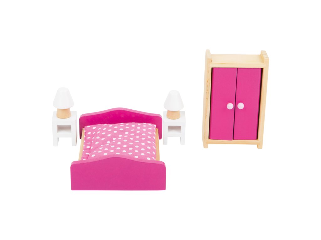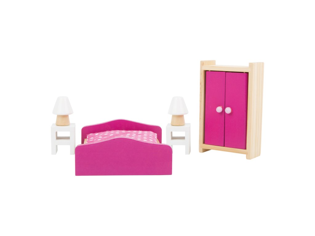 Tato 6dílná sada do ložnice má velikost pro ohýbací panenky do 12 cm. Je vyrobena z masivního dřeva pro dlouhou životnost. Hlavní vlastnosti: při hře tato sada probouzí fantazii a procvičuje jemnou motoriku