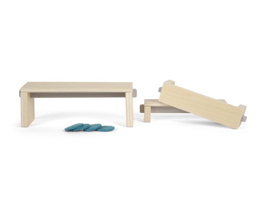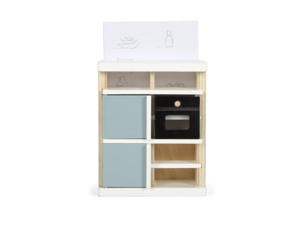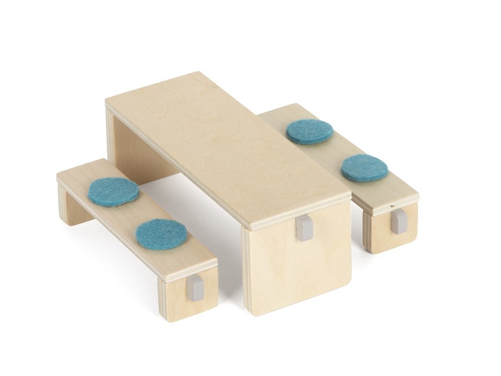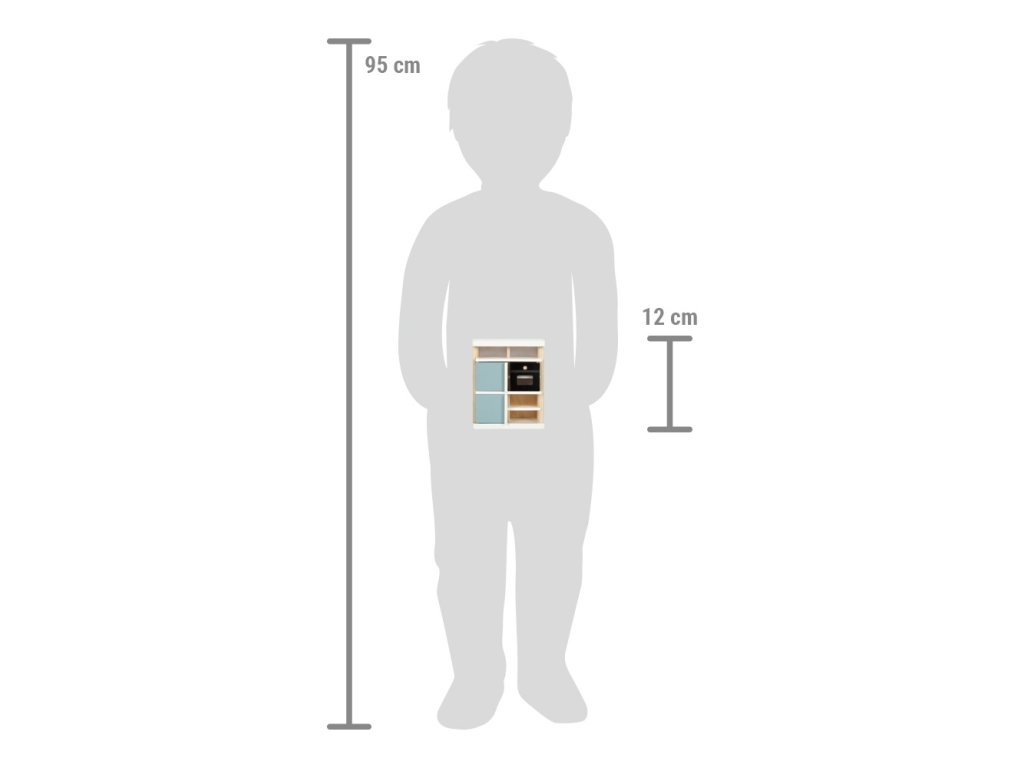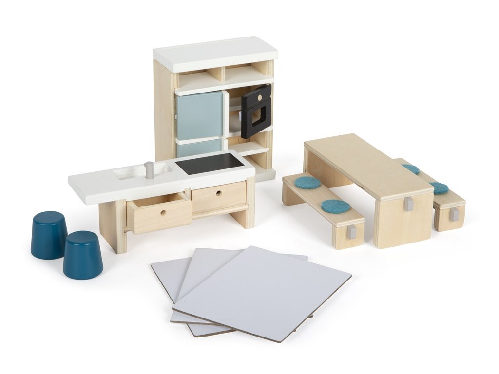 Tato detailně propracovaná kuchyň bude krásným doplňkem každého domečku pro panenky. Skládá se z vysoké kuchyňské skříně, samostatně stojícího kuchyňského ostrůvku, 2 taburetů a stolu se 2 lavicemi se sedáky, které se dají sundat. Součástí kuchyňské skříně je kombinovaná lednice s mrazničkou a trouba s otevíracími dvířky. Kuchyňský ostrůvek má varnou desku a dřez a také dvě vyjímatelné zásuvky. Jako místo k posezení u ostrůvku slouží dva taburety. Děti si mohou nakreslit obsah kuchyňské linky – např. potraviny a vybavení na kartón (3 ks kartónu jsou součástí balení) a ten použít jako zadní stěnu linky. Hlavní vlastnosti: možnost nakreslit si vlastní obsah kuchyňské linkydetailní zpracovánírozvíjí fantazii a kreativní hru