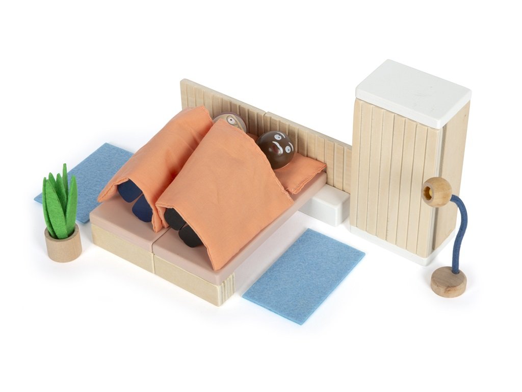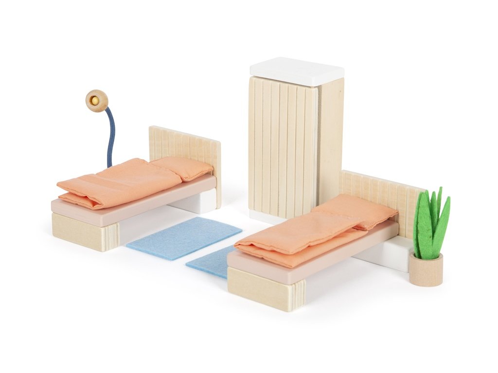 Tato ložnice je nejen krásným doplňkem pro každý domeček pro panenky, ale také motivuje děti ke kreativní hře a rozvíjí jejich představivost. Je vyrobena tak, aby co nejvíce odpovídala skutečnému nábytku. Součástí je manželské dvoulůžko, které je možné použít jako dvě samostatné postele, 2 polštáře a 2 peřiny, šatní skříň se zrcadlem, oblá lampa a 2 koberečky. Hlavní vlastnosti: moderní a elegantní nábytek do ložnicedetailní zpracovánírozvíjí fantazii a motivuje ke kreativní hře