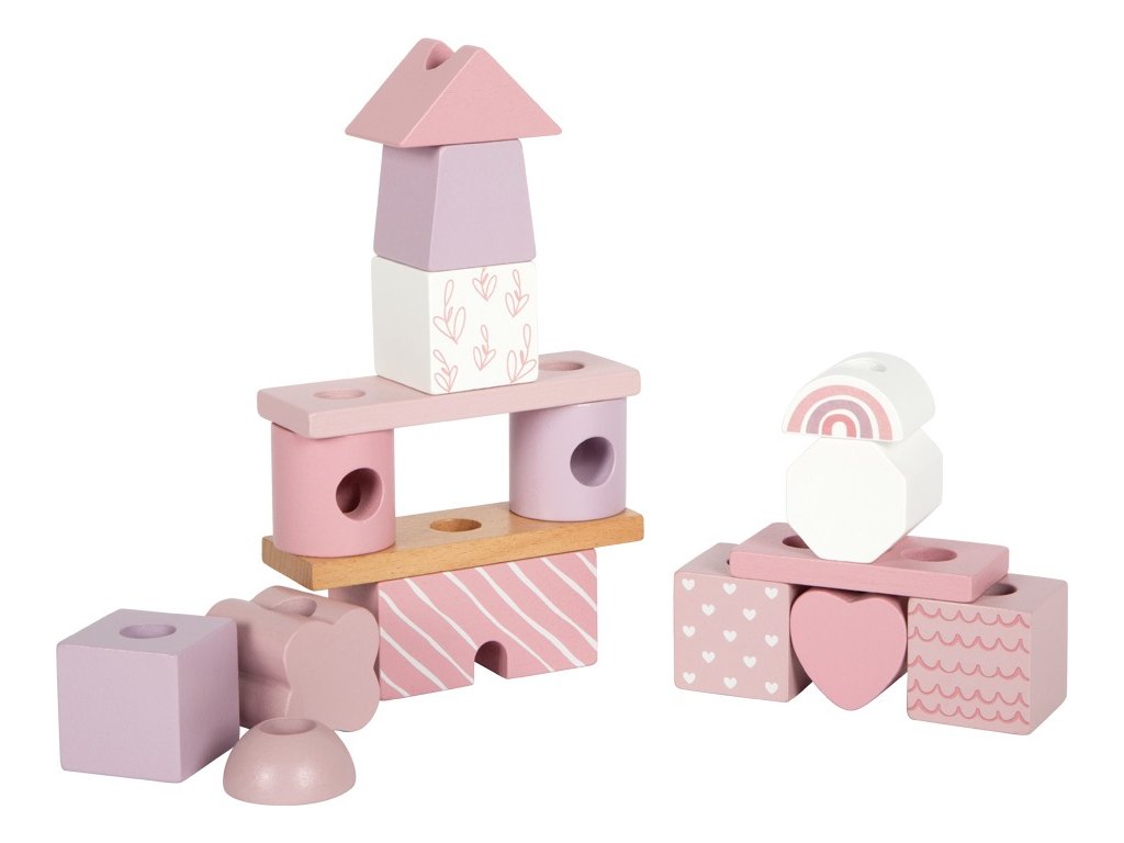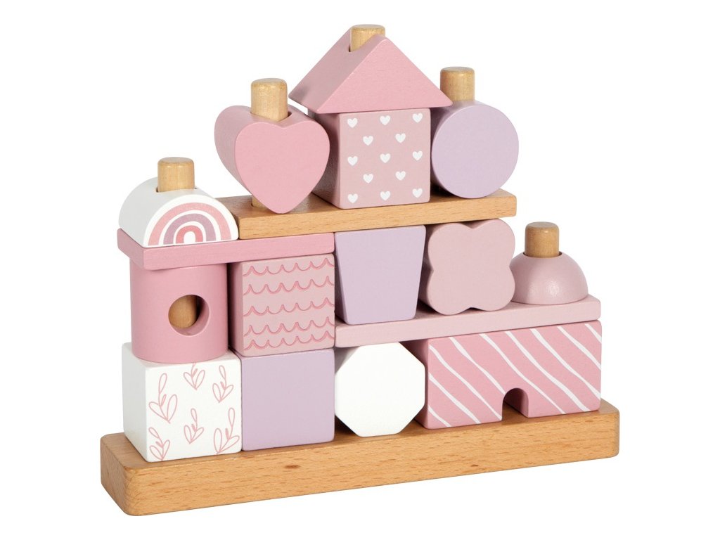 Tento dřevěný stohovací domeček v jemných pastelových odstínech růžové s přírodními prvky okouzlí nejen svým designem, ale i variabilitou. Obsahuje 18 různě tvarovaných a zdobených dílků, které děti inspirují k nasazování na dřevěné tyče a vytváření stále nových variant domečku. Při hraní si tak rozvíjejí jemnou motoriku, koordinaci a kreativitu.Jednotlivé kostičky jsou pečlivě vyrobeny z kvalitního dřeva s bezpečně zaoblenými hranami, a proto jsou ideální i pro malé dětské ručičky. Ideální jako dekorace do dětského pokoje a potěší i jako dárek. Hlavní vlastnosti: 18 dřevěných dílků v různých tvarech a vzorechjemné pastelové barvy v kombinaci s přírodním dřevemrozvíjí jemnou motoriku, koordinaci a kreativitukvalitní a bezpečné zpracování se zaoblenými hranamivhodný jako hračka i jako dekorace do pokojíčkuideální dárek pro nejmenší děti