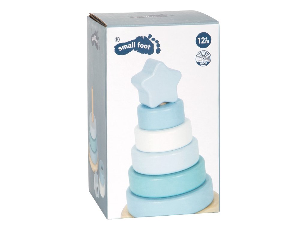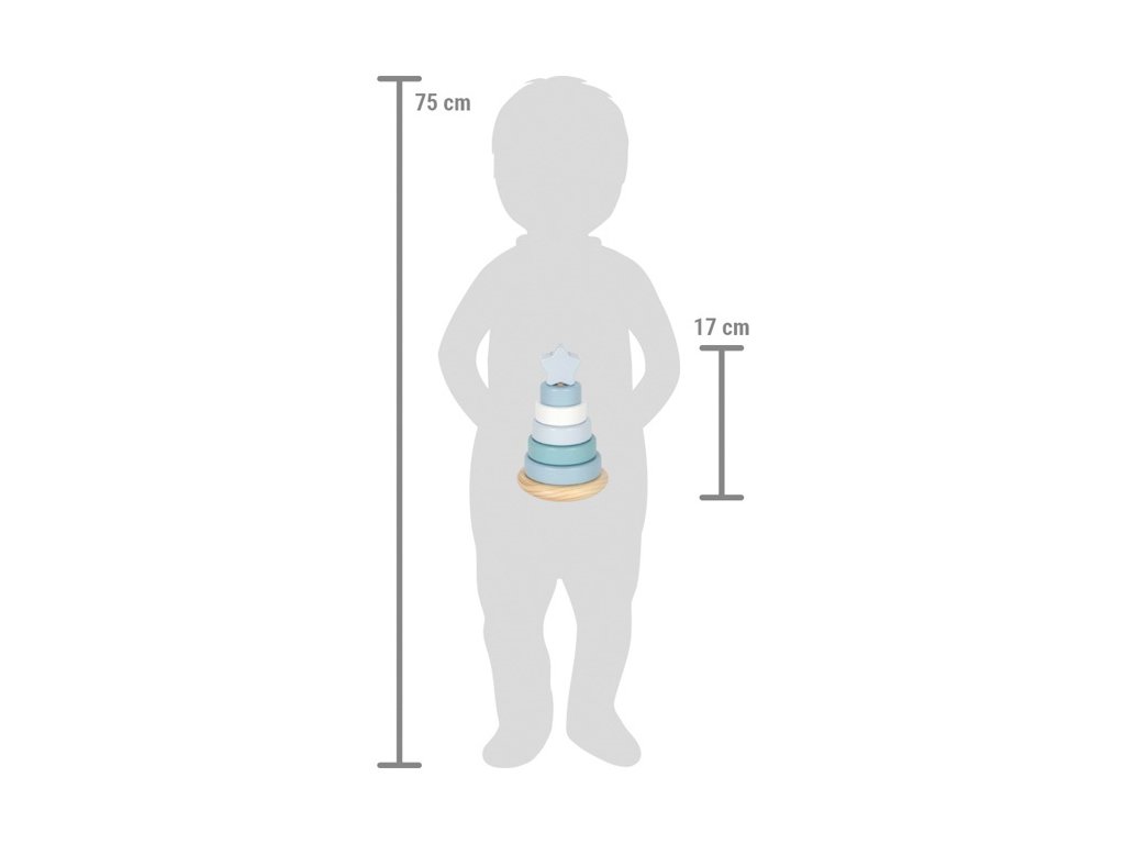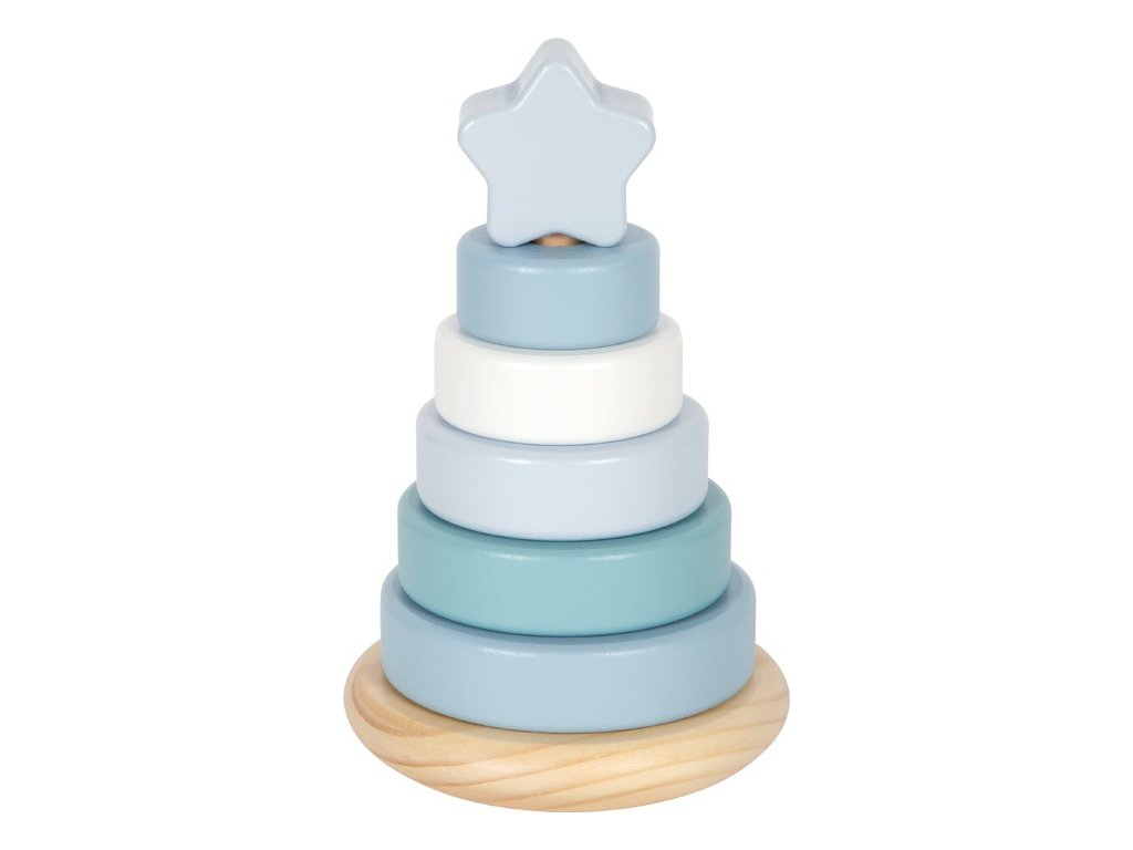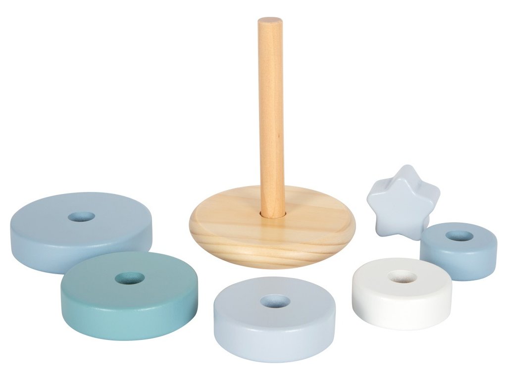 Tato dřevěná stohovací věž v jemných pastelových odstínech modré s přírodními prvky je zakončena hvězdou, které hračce dodává osobité kouzlo. Různě barevné a velikostně odstupňované kroužky pomáhají dětem procvičovat jemnou motoriku, soustředění i vnímání velikostí. Věž má zaoblenou základnu, díky které se může lehce pohupuje – to z ní dělá nejen edukativní, ale i zábavnou hračku. Bezpečná, pohyblivá centrální tyč se při zatlačení ohýbá, což zajišťuje větší bezpečnost při hře i snadnější navlékání kroužků. Hlavní vlastnosti: 7dílná nasazovací věž s hvězdoujemné pastelové odstíny v kombinaci s přírodním dřevempohyblivá centrální tyčrozvíjí motoriku, koncentraci a vnímání velikostíbezpečné zaoblené hrany a odolný materiálvhodná jako hračka i jako dekorace