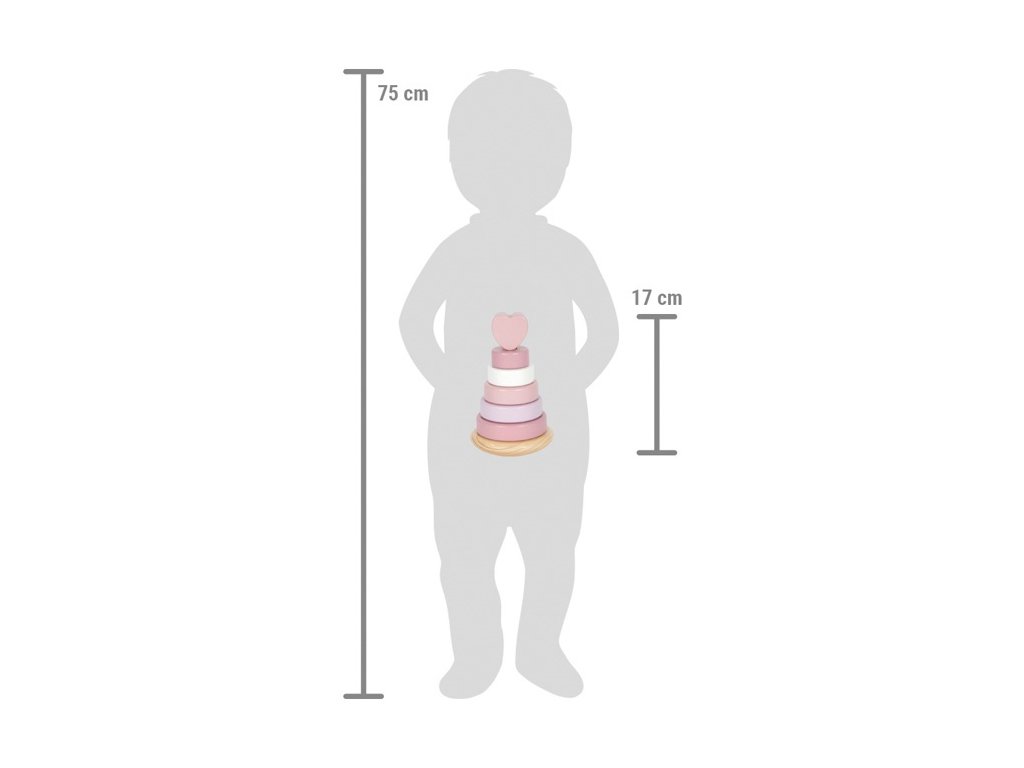 Tato dřevěná stohovací věž v jemných pastelových odstínech růžové s přírodními prvky je zakončena srdcem, které hračce dodává osobité kouzlo. Různě barevné a velikostně odstupňované kroužky pomáhají dětem procvičovat jemnou motoriku, soustředění i vnímání velikostí. Věž má zaoblenou základnu, díky které se může lehce pohupuje – to z ní dělá nejen edukativní, ale i zábavnou hračku. Bezpečná, pohyblivá centrální tyč se při zatlačení ohýbá, což zajišťuje větší bezpečnost při hře i snadnější navlékání kroužků. Hlavní vlastnosti: 7dílná nasazovací věž se srdcemjemné pastelové odstíny v kombinaci s přírodním dřevempohyblivá centrální tyčrozvíjí motoriku, koncentraci a vnímání velikostíbezpečné zaoblené hrany a odolný materiálvhodná jako hračka i jako dekorace