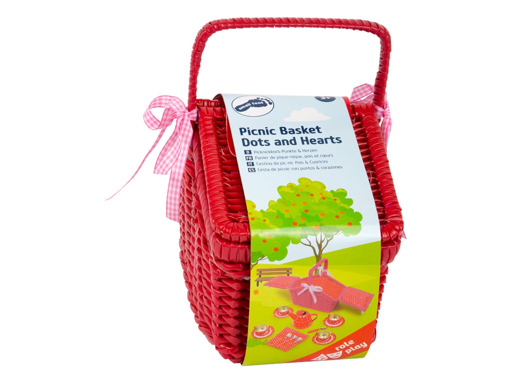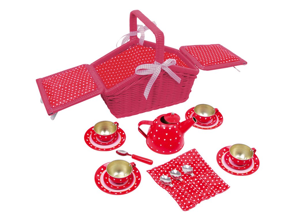 Tento proutěný košík obsahující plechovou čajovou soupravu s motivem srdce si můžete vzít na každý čajový dýchánek! Koš má pásky se suchými zipy, je lemovaný puntíkovanou látkou a zdobený malými stuhami. Sada obsahuje: 1 piknikový koš, 1 podnos na příbory, 1 konvice, 4 velké talíře, 4 malé talíře, 4 šálky, 4 lžíce Hlavní vlastnosti: kompletní čajová sada v košíkuobsahuje 18 dílů