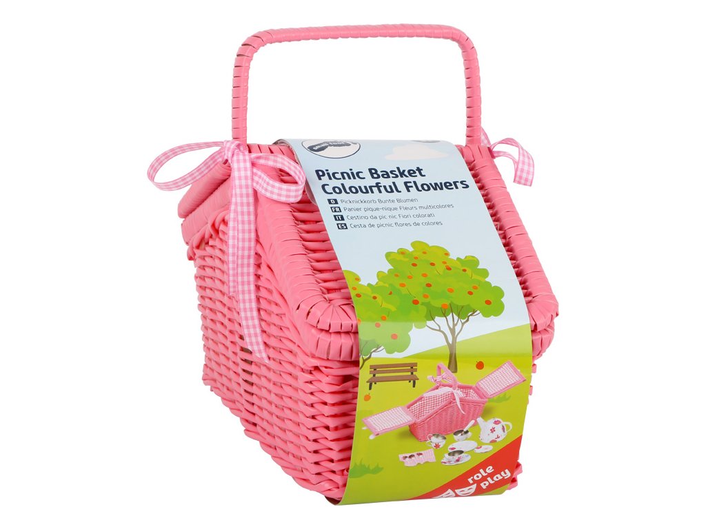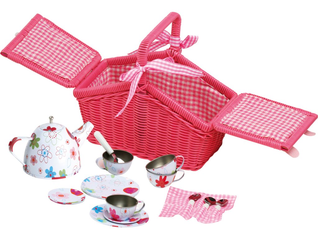 Moderní piknikový koš s designem ve stylu 70. let s kovovým nádobím. Tento koš vyrobený z umělého proutí je dostatečně prostorný pro celou sadu nádobí, ale také i pro malé dobroty, nebo další hračky. Při zalévání šálku čaje nebo kávy do plechového nádobí s květinovými vzory udělá opravdu skvělý dojem. Perfektní společník na výlety s panenkami. Sada má celkem 18 kusů. Hlavní vlastnosti: podporuje rozvoj sociálních dovedností sada 18 kusů