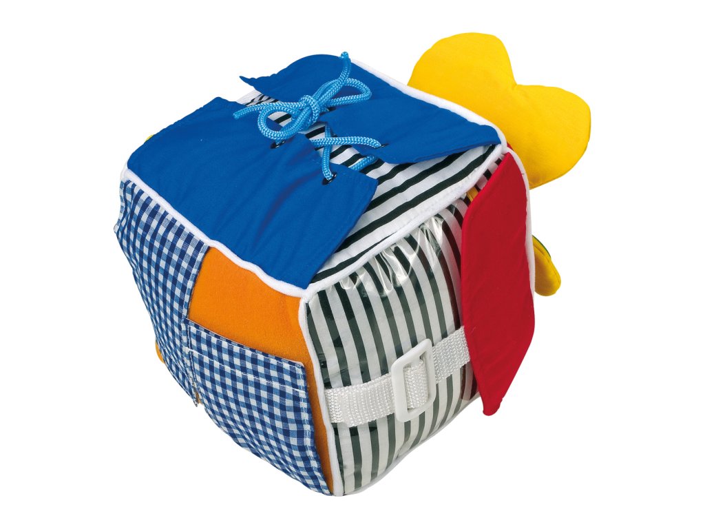 Plyšová kostka s různými zapínáními pro motorická cvičení dětských prstů. Každý typ zapínámí se nachází na jiné straně kostky - šněrování, knoflíky, na zip, na patentky, na suchý zip a pomocí nylonových tkaniček. Hlavní vlastnosti: trénuje motorické dovednosti