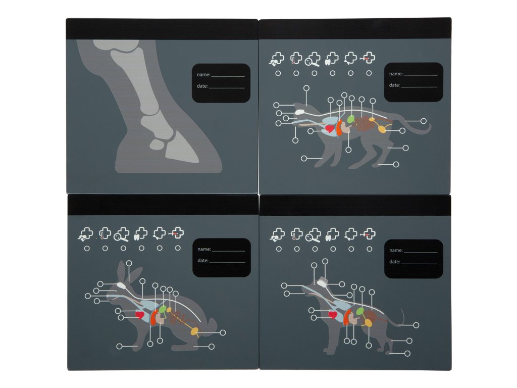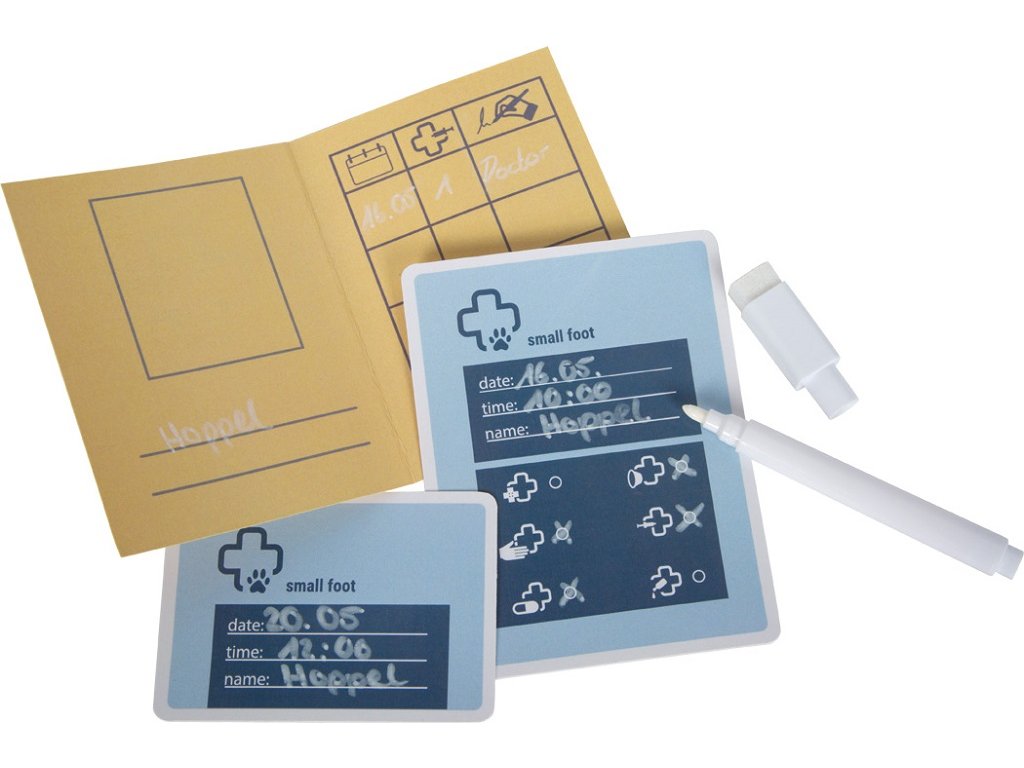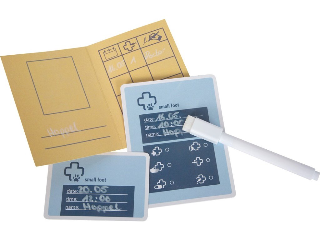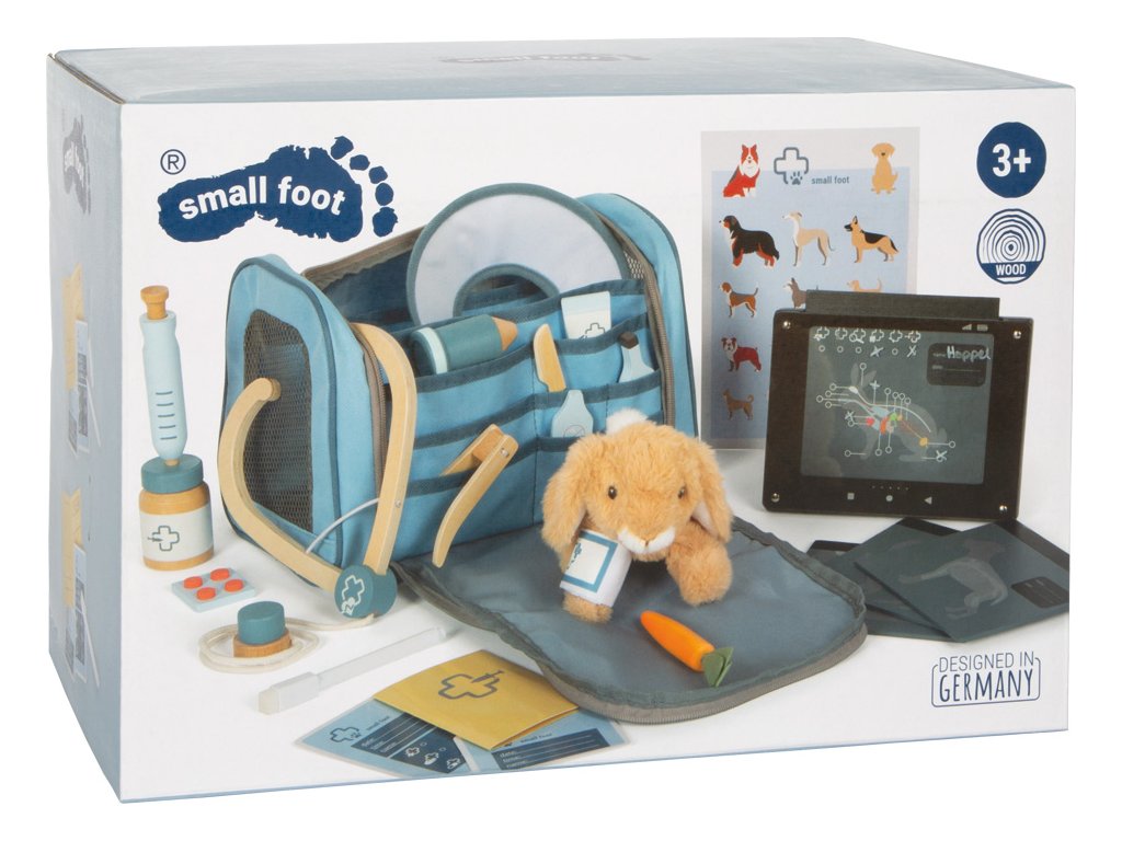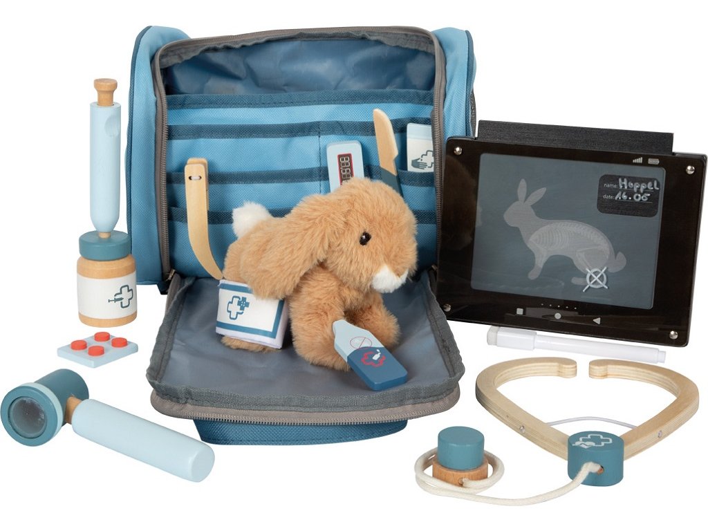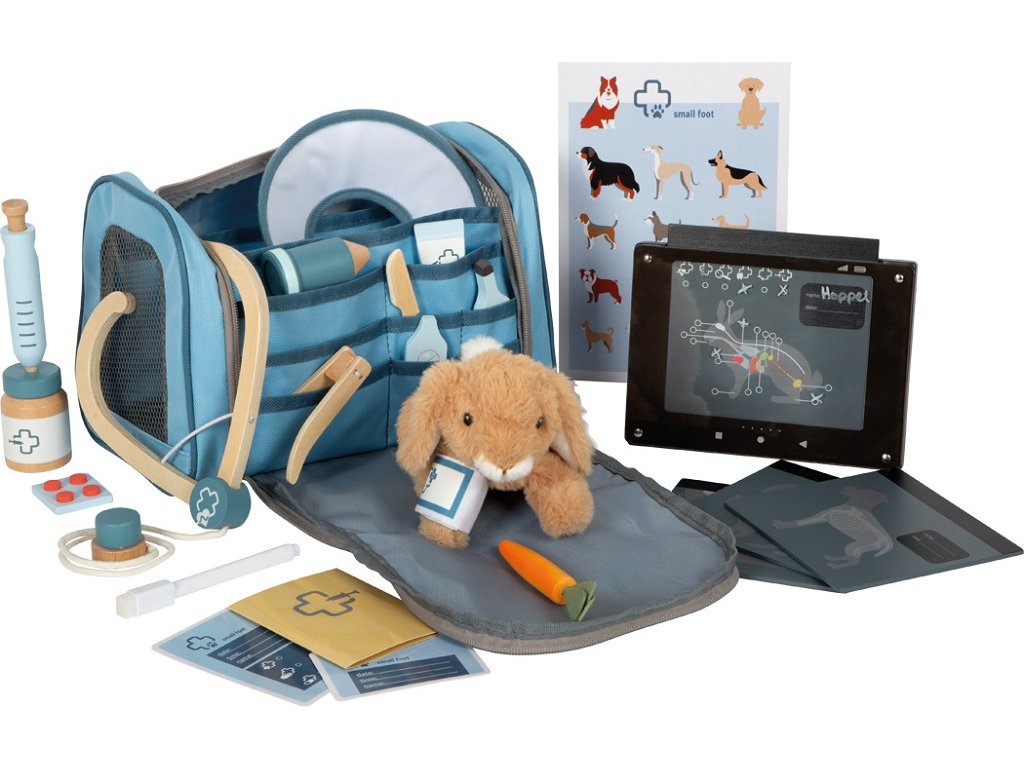 Staň se malým veterinářem a postarej se o svého plyšového králíčka! S touto roztomilou veterinární sadou s plyšovým králíčkem se děti mohou stát malými veterináři a s láskou se starat o své zvířecí pacienty. Od měření teploty a prohlížení rentgenů až po ošetření proti blechám – tato všestranná herní sada promění hru na veterináře v realistický, poučný a hřejivý zážitek.Součástí balení je vše, co malí doktoři zvířátek potřebují: stetoskop, teploměr, otoskop, injekční stříkačka, obvaz, ochranný límec i tablet pro prohlížení rentgenových snímků – nechybí ani čtyři snímky (pes, kočka, králík a kůň). Na zadní straně rentgenových desek je navíc vytištěn kontrolní formulář. Děti mají k dispozici také pinzetu na klíšťata, běžnou pinzetu, léky, očkovací průkaz, objednací kartičku a formulář pro anamnézu. Plakát s obrázky různých psích plemen skvěle doplní každou veterinární ordinaci. Praktická taška poslouží nejen jako přepravní box pro králíčka, ale také jako přehledná lékařská brašna – udržuje pořádek a umožňuje vzít si vybavení kamkoli s sebou. Přiložené pero je ideální pro zapisování údajů o pacientech, což rozvíjí jazykové dovednosti i povědomí o zdraví zvířat.Díky realistickým doplňkům děti rozvíjejí empatii, smysl pro zodpovědnost a jemnou motoriku, zatímco si užívají kreativní a smysluplnou hru. Hlavní vlastnosti: realistická veterinární hrací sada s přepravní taškou a plyšovým králíčkemsada obsahuje: přepravní taška, plyšový králíček, rentgenový přístroj, 4x rentgenový snímek, obvaz, krční límec, otoskop, lékařský teploměr, injekční stříkačka, krabička na léky, blistr s tabletami, přípravek proti blechám, tuba masti, skalpel, pinzeta, stetoskop, mrkev, fóliový popisovač, očkovací průkaz, 2 karty pacienta podporuje kreativní hranítrénuje důležité sociální a emocionální dovednosti