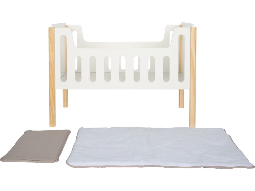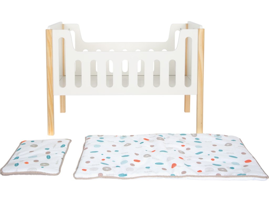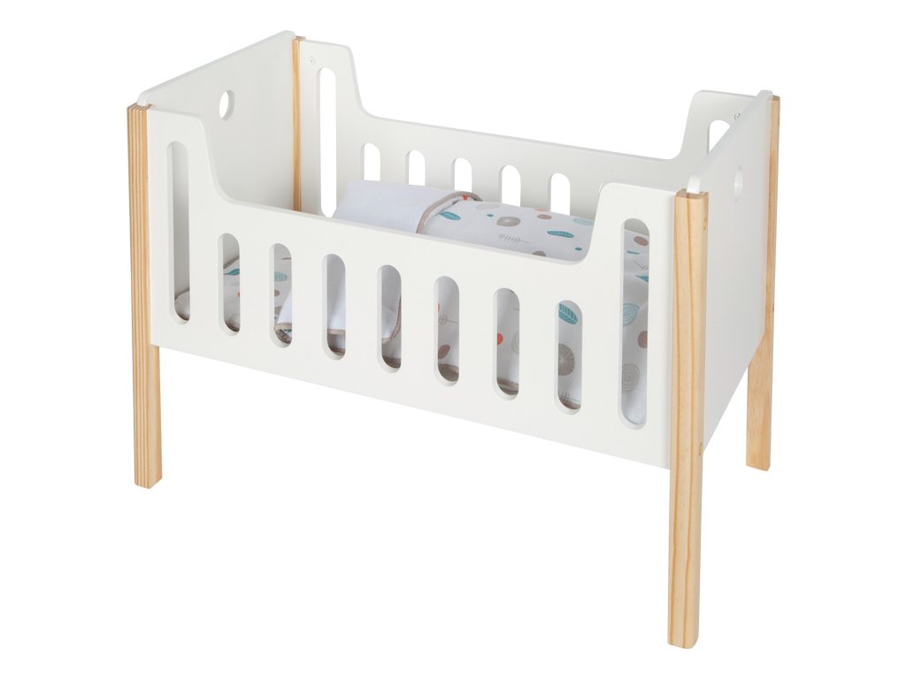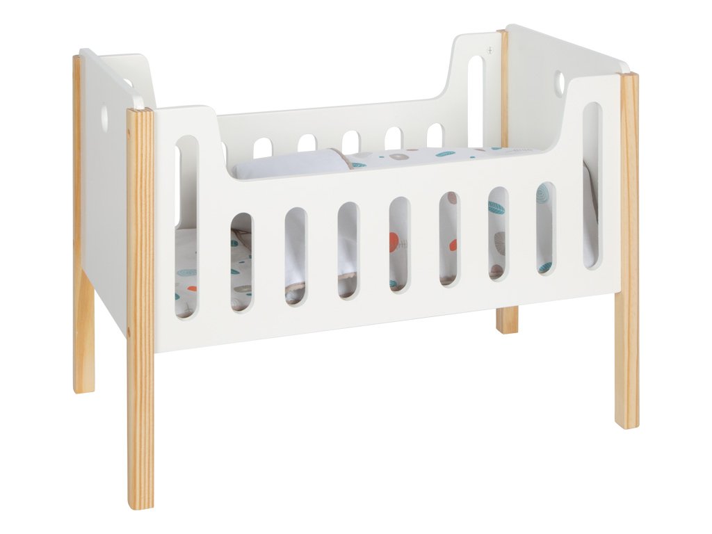 Tato moderní dřevěná postýlka pro panenky ve skandinávském lineárním designu je ideální postýlkou pro uspávání panenek nebo plyšáků. Má vysoce kvalitní zpracování se zaoblenými hranami a viditelnými prvky z masivního dřeva. Součástí je oboustranné povlečení s velkou přikrývkou, které umožňuje pohodlné spaní i větším panenkám nebo plyšovým hračkám do velikosti 46 cm. Zvýšená plocha na ležení pro panenky umožňuje ergonomickou hru. Díky decentnímu designu z neutrální bílé v kombinaci s přírodním dřevem se tato stabilní postýlka skvěle hodí do každého interiéru obývacího pokoje nebo dětského pokoje. Hlavní vlastnosti: série nábytku pro panenky „Little Button“oboustranné ložní povlečenído velikosti panenek 46 cm