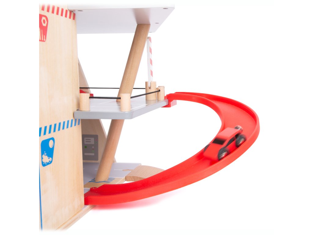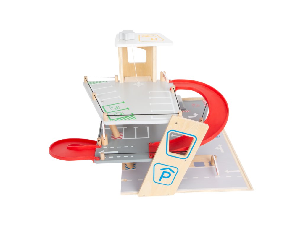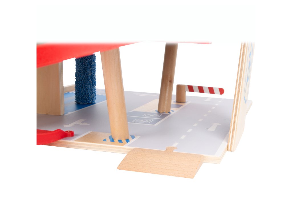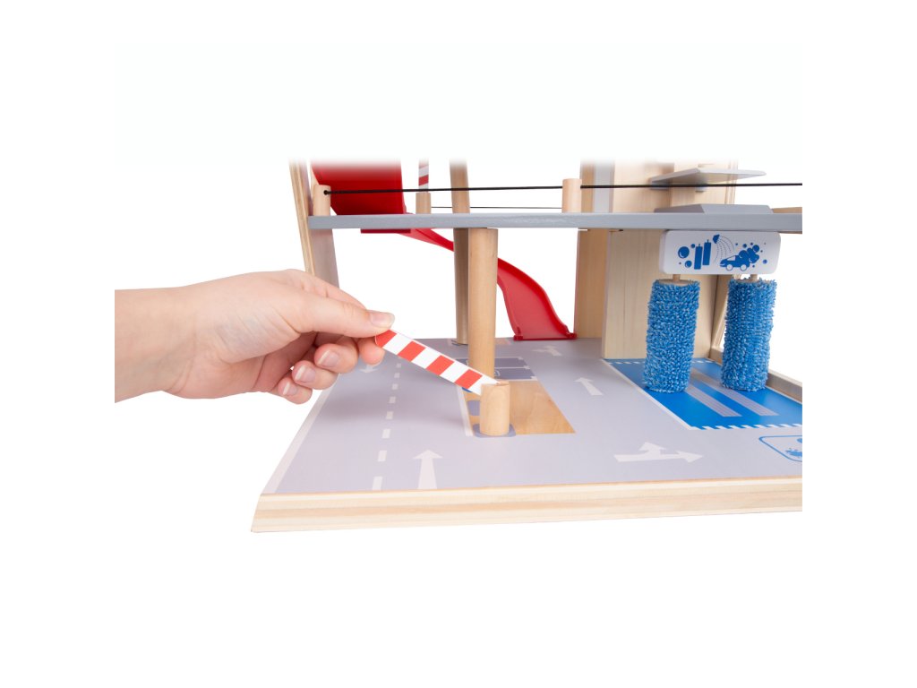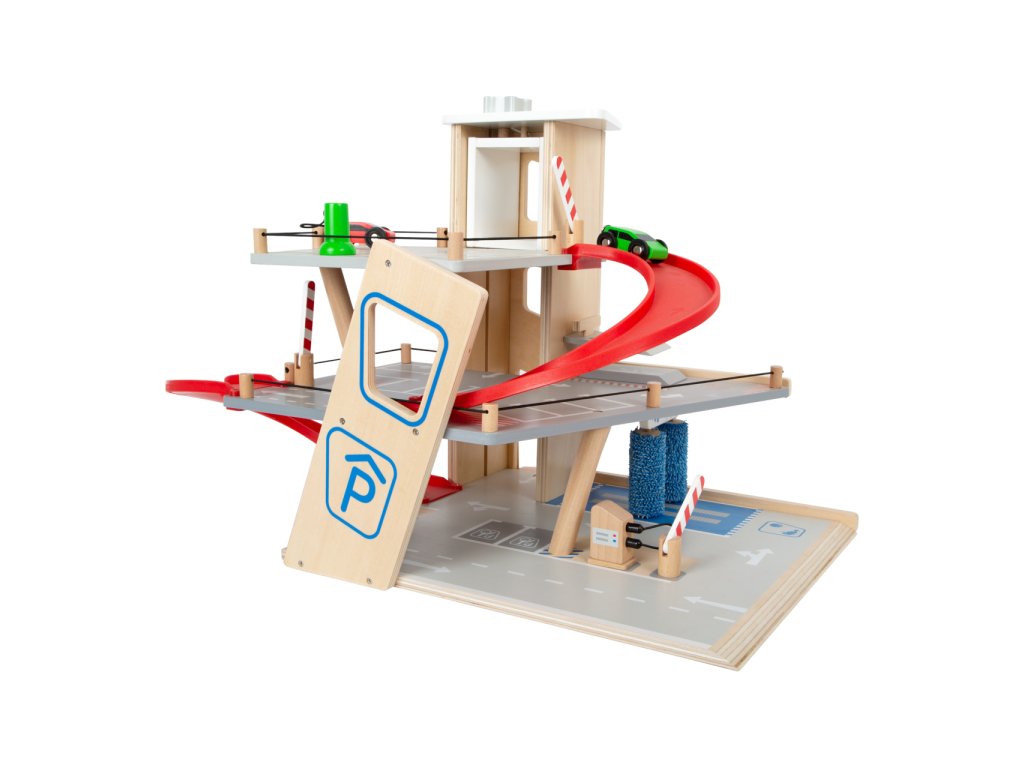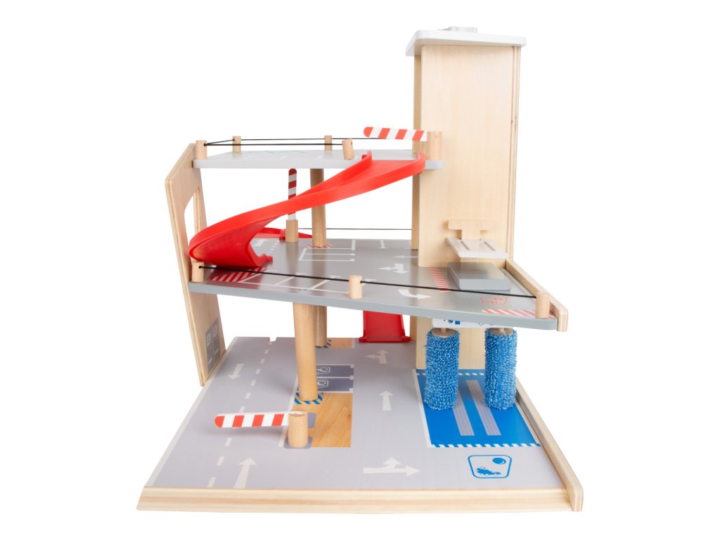 Parkujte, tankujte, myjte nebo opravujte, a to vše s jednou garáží! Nabízí tři bohatě vybavená podlaží propojená atraktivním funkčním výtahem a zábavnými, na sebe plynule navazujícími rampami. Její součástí je dvojice autíček, která mohou při fantastických hrách využít pumpy, nabíjecí stanice, zvedací rampy, nebo myčky s realistickými kartáči. Každá z úrovní je navíc opatřena mechanickou závorou pro dokonale poutavé zážitky. Patra jsou opatřena gumovým hrazením, které dodávají jízdě autíček na dynamice a brání jejich vypadnutí. Garáž je podrobně zdobena mnoha barevnými ikonami a značením, které do her vnese i poučení. Je vyrobena ze silné, pevné a odolné dřevěné překližky s doplňky z masivního dřeva a nezávadného plastu. Výrobek vyžaduje montáž, dodáváno s obrázkovým návodem k sestavení. Hlavní vlastnosti:garáž a 2 autíčka3 podlaží propojená funkčním výtahem a 2 rampamipumpa, nabíjecí stanice, zvedací rampa, myčka a 3 závorykompatibilní s vláčkodráhami a souvisejícím příslušenstvím jiných výrobcůbohatě zdobeno jednoduchými ikonami a značenímpevné a odolné dřevěné provedení