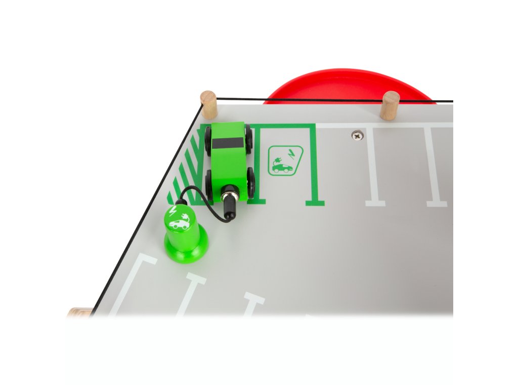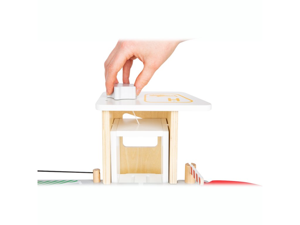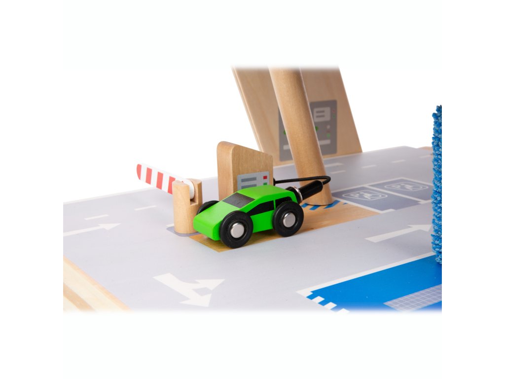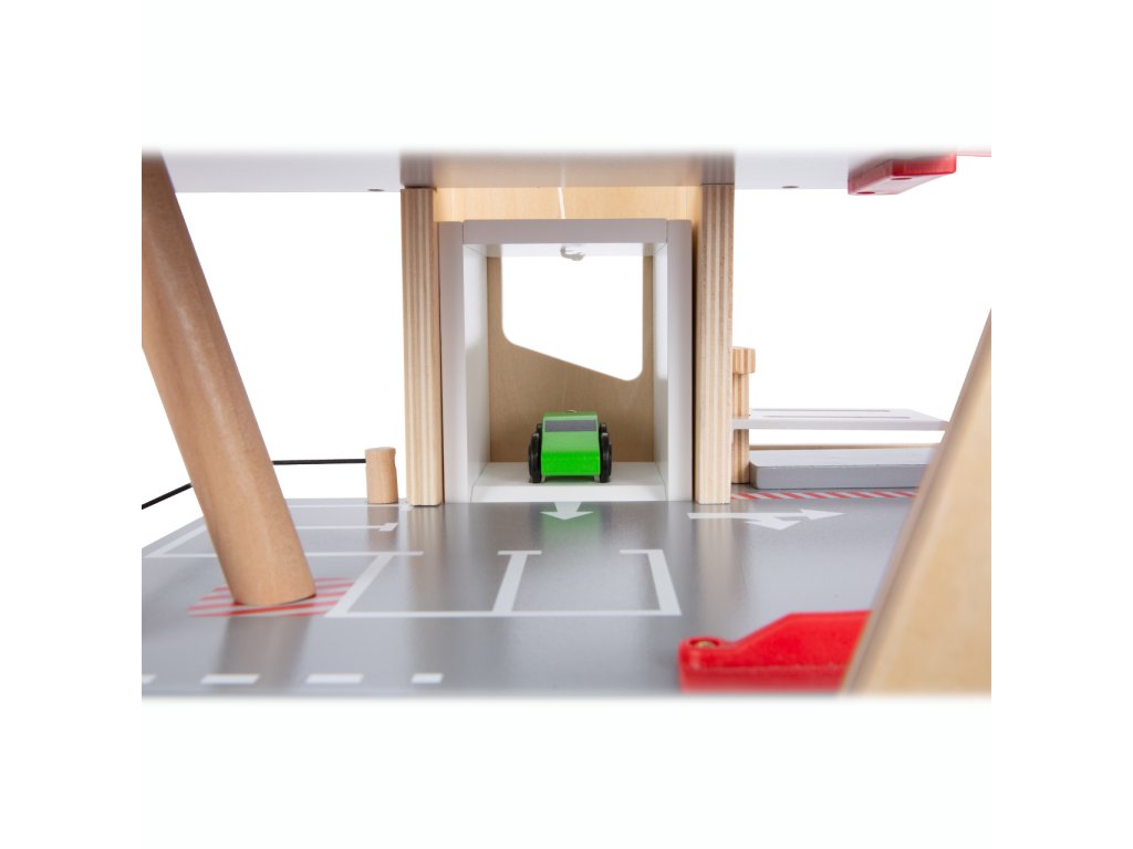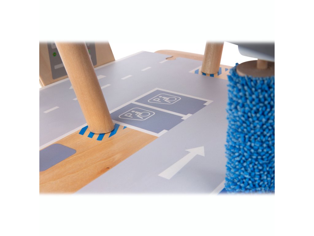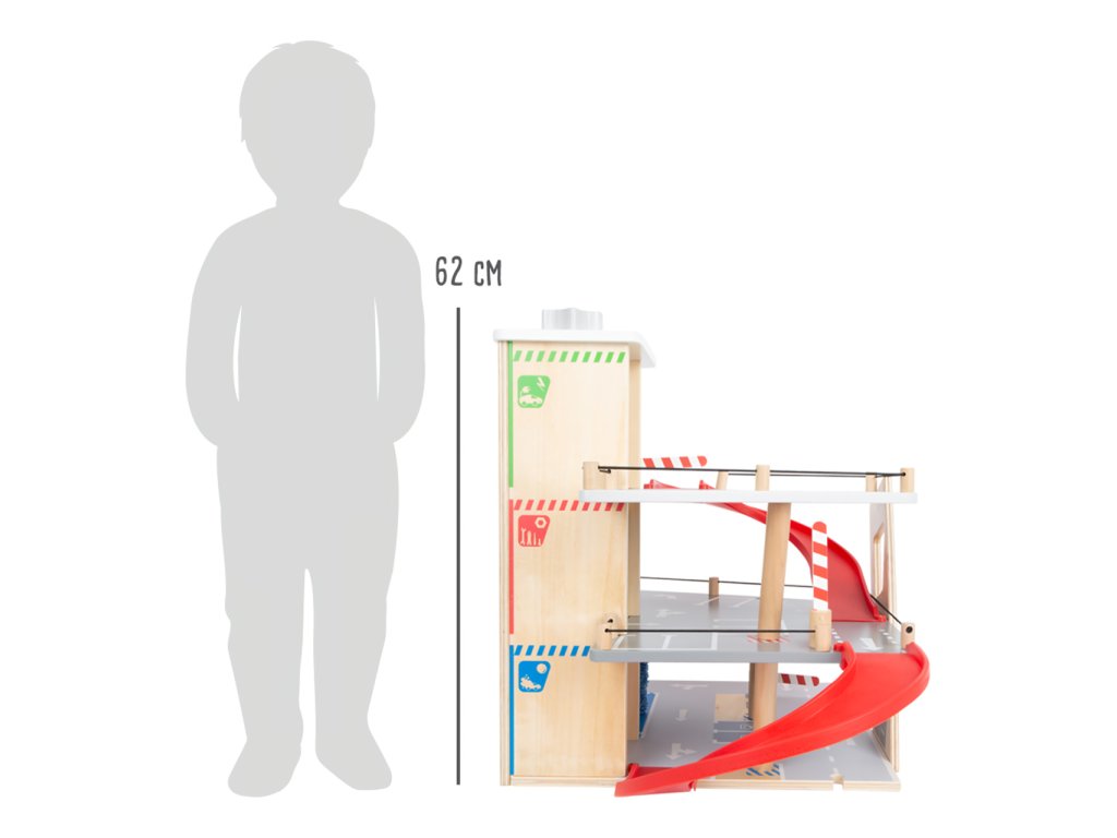 Parkujte, tankujte, myjte nebo opravujte, a to vše s jednou garáží! Nabízí tři bohatě vybavená podlaží propojená atraktivním funkčním výtahem a zábavnými, na sebe plynule navazujícími rampami. Její součástí je dvojice autíček, která mohou při fantastických hrách využít pumpy, nabíjecí stanice, zvedací rampy, nebo myčky s realistickými kartáči. Každá z úrovní je navíc opatřena mechanickou závorou pro dokonale poutavé zážitky. Patra jsou opatřena gumovým hrazením, které dodávají jízdě autíček na dynamice a brání jejich vypadnutí. Garáž je podrobně zdobena mnoha barevnými ikonami a značením, které do her vnese i poučení. Je vyrobena ze silné, pevné a odolné dřevěné překližky s doplňky z masivního dřeva a nezávadného plastu. Výrobek vyžaduje montáž, dodáváno s obrázkovým návodem k sestavení. Hlavní vlastnosti:garáž a 2 autíčka3 podlaží propojená funkčním výtahem a 2 rampamipumpa, nabíjecí stanice, zvedací rampa, myčka a 3 závorykompatibilní s vláčkodráhami a souvisejícím příslušenstvím jiných výrobcůbohatě zdobeno jednoduchými ikonami a značenímpevné a odolné dřevěné provedení
