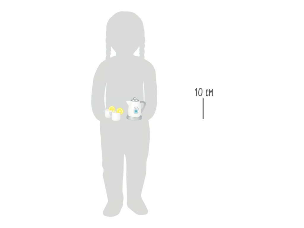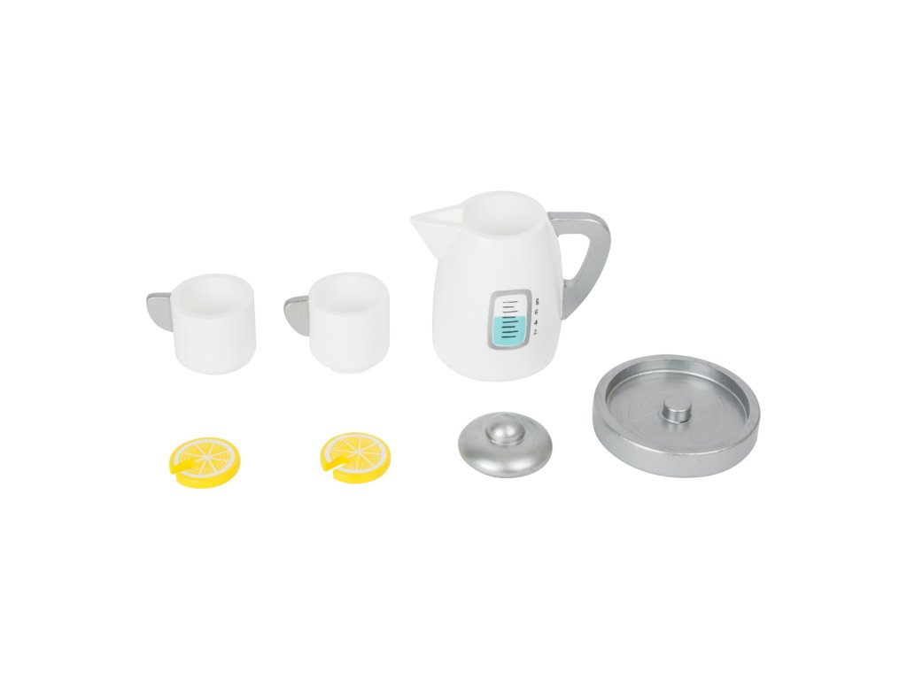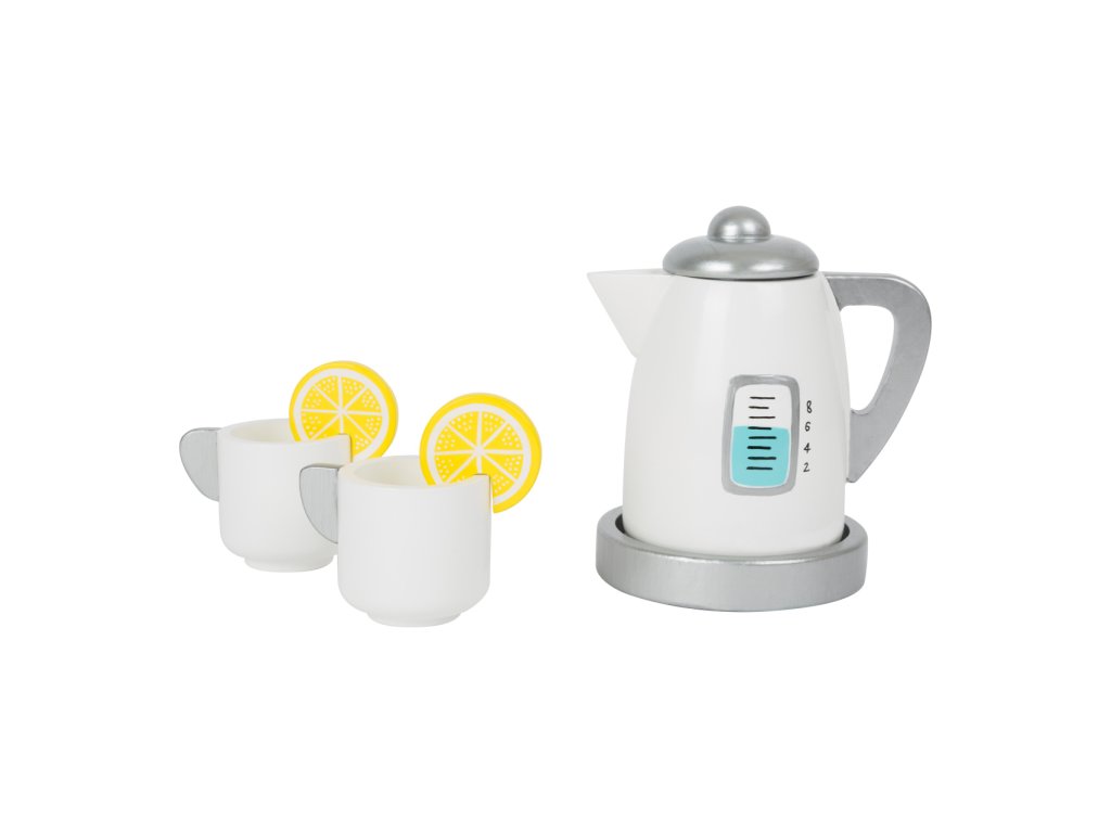 Není nad šálek horkého čaje ozdobený šťavnatým plátkem citrónu! Naučte děti pravidla servisu a společenského chování se soupravou rychlovarné konvice a hrníčků. Skvěle doplní dětské kuchyňky, jiné servisy, snídaňové sady, nebo makety pečiva a zákusků. Součásti jsou vyrobeny z kombinace masivního dřeva a silné překližky, hračka díky tomu může nabídnout vysokou odolnost a životnost. Hlavní vlastnosti:konvice s víčkem a podstavou, 2 šálky a 2 citrónyrobustní a odolné dřevěné provedení