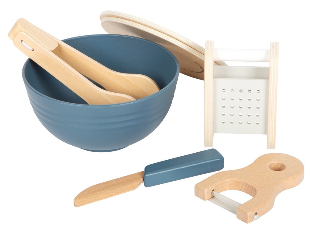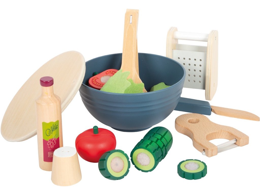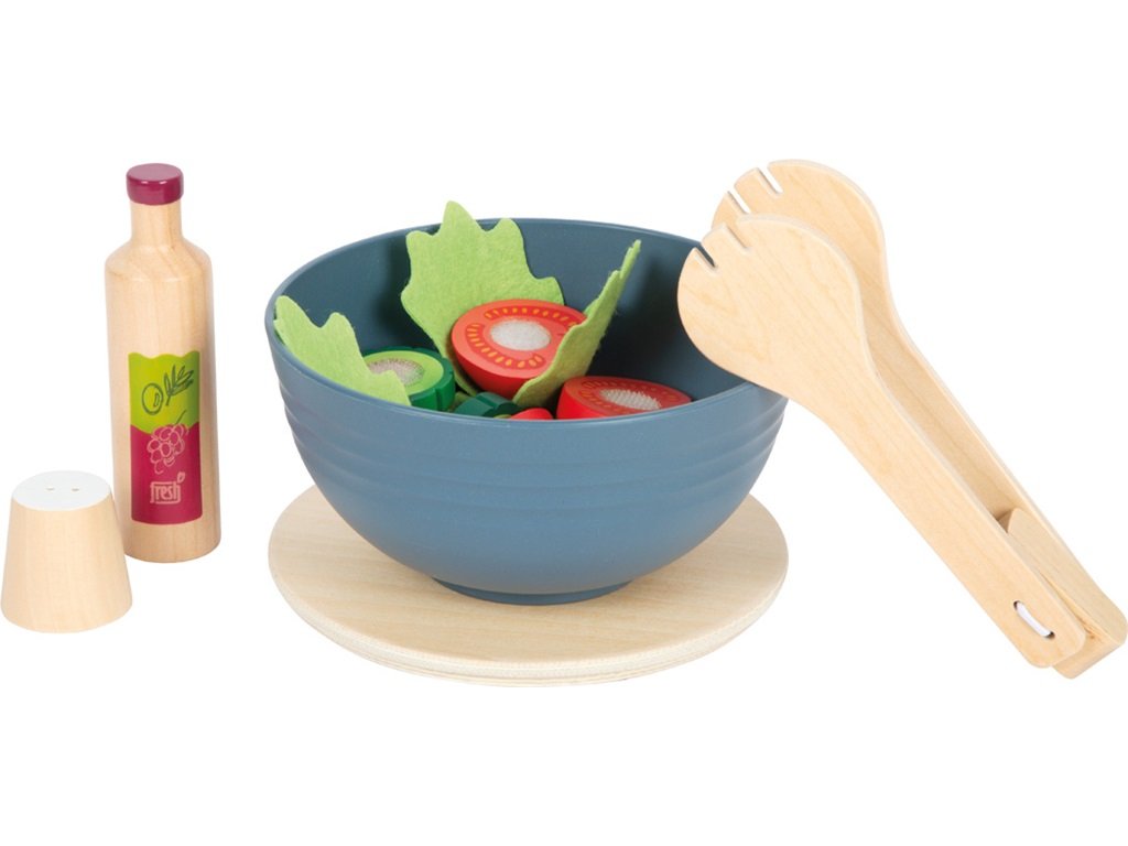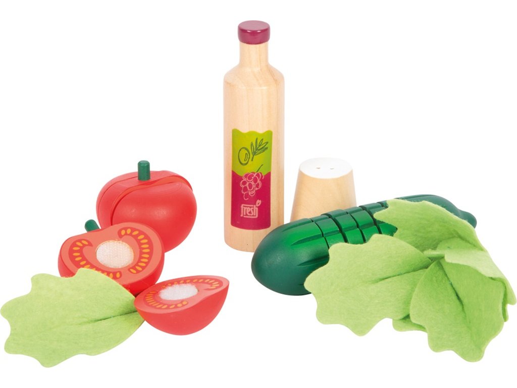 Tato moderní sada se vším potřebným pro přípravu salátu je vyrobena z vysoce kvalitního dřeva v realistickým barvách v kombinaci se vzhledem přírodního dřeva. Rozsáhlá sada se skládá z dřevěné salátové mísy, jejíž víko v přírodní barvě slouží také jako prkénko, okurky, rajčete, hlávky salátu, struhadla, kleští na salát, lahvičky se zálivkou, slánky, nože a škrabky na zeleninu. Části okurky a rajčete jsou dohromady spojeny suchým zipem a děti je mohou snadno „rozkrojit“ pomocí přiloženého nože. Hlávka salátu je vyrobena z plsti a má odnímatelné vnitřní listy. Díky realistickému zpracování si budou děti připadat jako skuteční kuchaři a příprava lahodného salátu je přenese do světa dospělých. Sada podporuje nejen motorické dovednosti, ale také kreativitu, sociální interakci dětí a hru na role. Touto cestou se také děti seznamují se zdravou výživou a přípravou čerstvých potravin. Salátová sada je perfektním doplňkem do každé dětské kuchyňky! Sada obsahuje: dřevěnou salátovou mísu s víkem, okurku, 2 rajčata, hlávku salátu, struhadlo, kleště na salát, lahvičku se zálivkou, slánku, nůž a škrabku. Hlavní vlastnosti: krájecí okurka a rajčehlávka salátu s odnímatelnými vnitřními listypodporuje rozvoj kuchyňských dovedností hravou formouseznamuje děti se zdravým stravováním a přípravou čerstvých jídelrozvíjí motorické dovednosti, kreativitu, sociální interakci dětí a hru na roleskvělý doplněk k dalším produktům řady Fresh