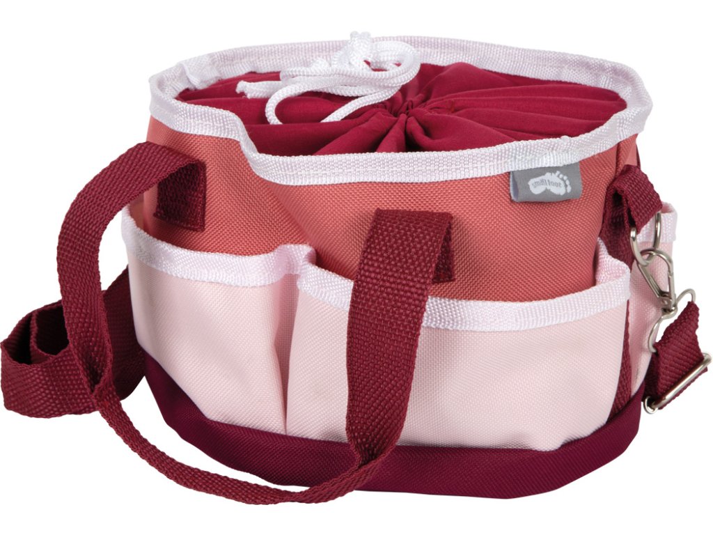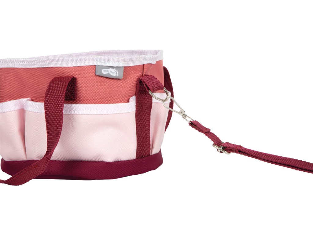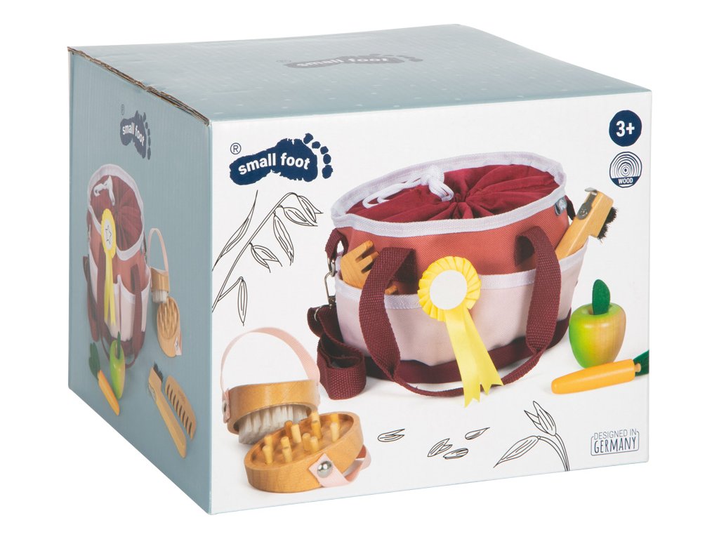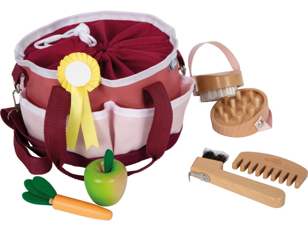 Taška s příslušenstvím na čištění a péči o koně. Je vhodná pro všechny děti, které mají rády koníky. Taška je odolná, praktická a dostatečně prostorná, aby pojala veškeré vybavení. Péče o koně je součástí každodenní rutiny každého fanouška koní a koníci kartáčování milují. Taška s doplňky je vyrobená z vysoce kvalitních materiálů a máte vše, co potřebujete, hned po ruce, i když jste na cestách. Mezi doplňky patří kartáč, hřeben, škrabka na kopyta a hřeben na hřívu, to vše se vejde do prostorného vnitřku tašky a do malé boční kapsy. A samozřejmě nechybí dřevěné jablko a mrkev. Sada se dodává s turnajovou stuhou, kterou si děti mohou připevnit na obojek hlavy svého koníka nebo na vlastní oblečení. Pomůcky na čištění koní jsou dokonale přizpůsobeny potřebám mladých fanoušků koní, takže mladí jezdci mohou při hře popustit uzdu své fantazii. Pohodlná stahovací šňůrka umožňuje tašku doširoka otevřít, ale také úplně zavřít. Tuto tašku pro děti lze nosit za obě uši nebo nastavitelný ramenní popruh. S touto sadou péče se mohou děti starat o svého oblíbeného koně stejně jako profesionálové. Hlavní vlastnosti: nezbytné příslušenství v tašce pro každého fanouška konínastavitelný ramenní popruhkomplexní sada