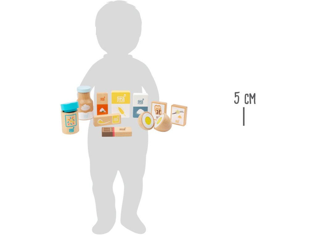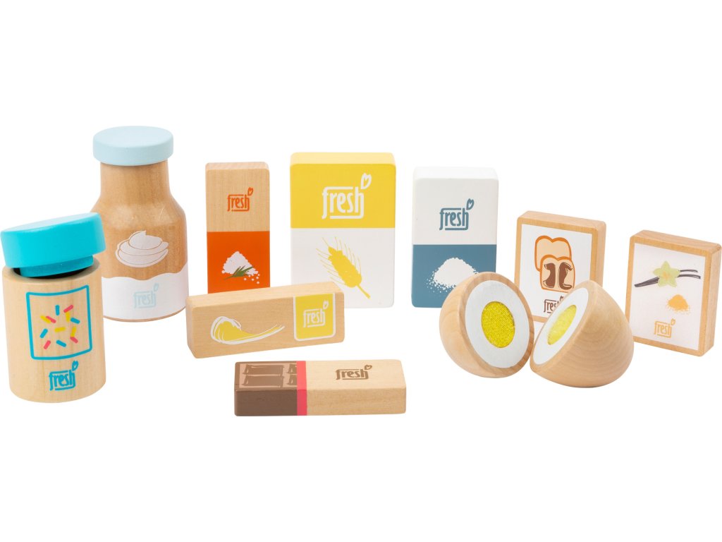Pozor, všichni pekaři a cukráři! Tato 10dílná sada dřevěných ingrediencí k pečení nabízí vše, co si srdce mladých pekařů žádá. Kromě mouky zde naleznete cukr, smetanu, sůl a prášek do pečiva, také balení vanilkového cukru a rozložitelné vajíčko. To je to nejdůležitější na pečení v domácí kuchyňce. Hotový produkt posypeme čokoládou a zdobením a můžeme podávat! Hlavní vlastnosti: obsahuje 10 ingrediencí podporuje hraní rolí a učí o jídle v domácnostirozvíjí motoriku dětí