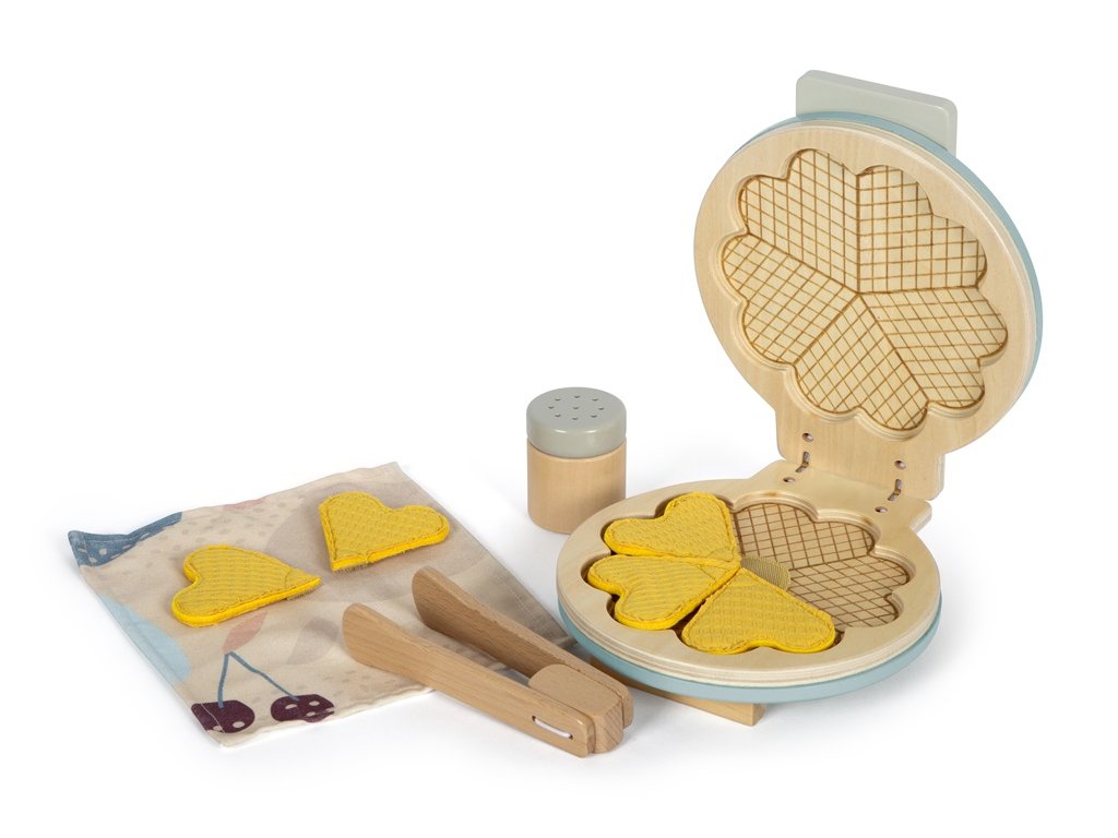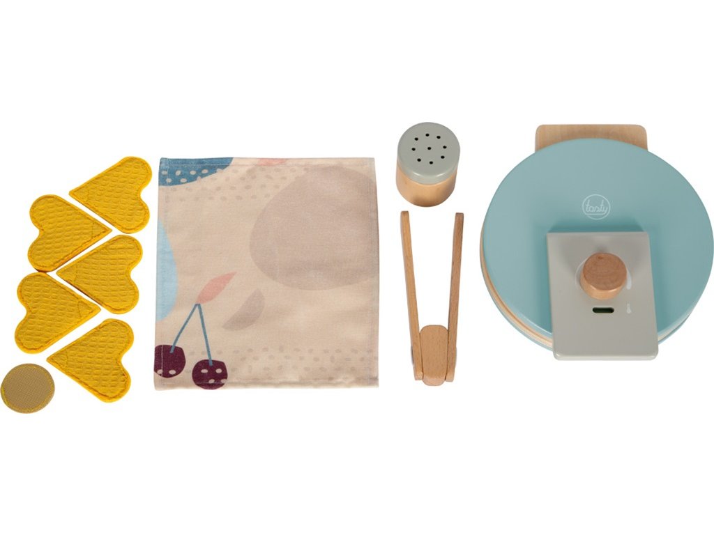 Dali byste si vafle? Se sadou na přípravu vaflí s bohatým příslušenstívm to nebude žádný problém. Váš malý kuchař nebo kuchařka mohou připravit najednou až pět vaflí ve tvaru srdce. Jsou vyrobeny z látky, uprostřed spojeny suchým zipem a vypadají jako opravdové. Při otáčení knoflíku na vaflovači se barva kontrolky mění z červené na zelenou a kuchař tak pozná, jestli už jsou vafle správně propečené. Součástí sady je látkový ubrousek, kleště a cukřenka na posypání vaflí, která při sypání vydává štěrkavý zvuk. Hlavní vlastnosti: vhodné do dětské kuchyňkypodporuje kreativní a nápadité hraní plné fantazietrénuje sociální dovednostimoderní barvy ve skandinávském stylu