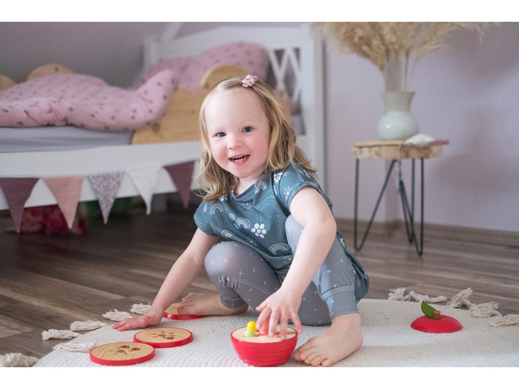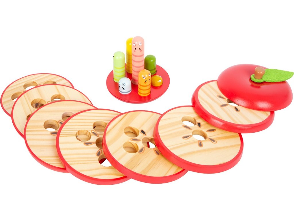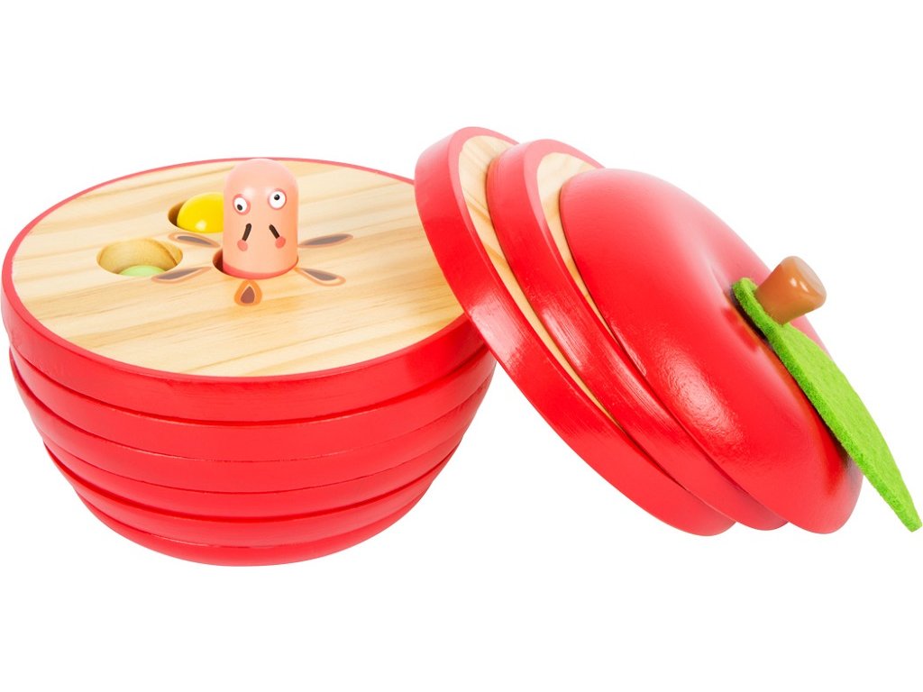 Dřevěná, 9 dílná skládačka jablka zdobeného plstěným lístkem, v jasných barvách. Procvičujte jemnou motoriku, koordinaci zraku a rukou i prostorovou představivost, aniž byste ubírali na zábavě. Každý červík vykukující ze základního dílu má jinou výšku, skládejte jablko po vrstvách tak, aby počet děr ve vrstvě odpovídal počtu právě vykukujících červíků. Sestavené jablko je ozdobou každé police. Hlavní vlastnosti: 9 dílůvhodné i jako dekoracerobustní a odolné provedení