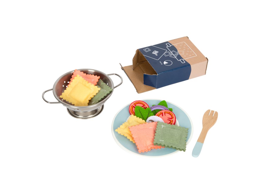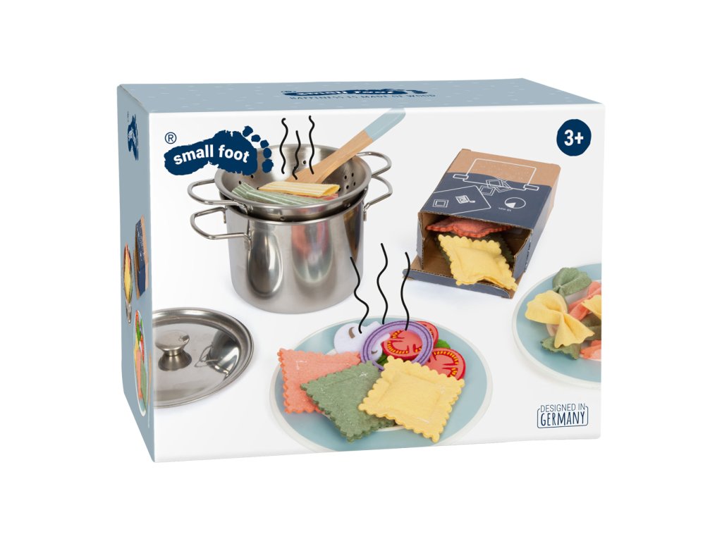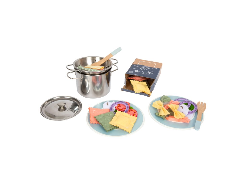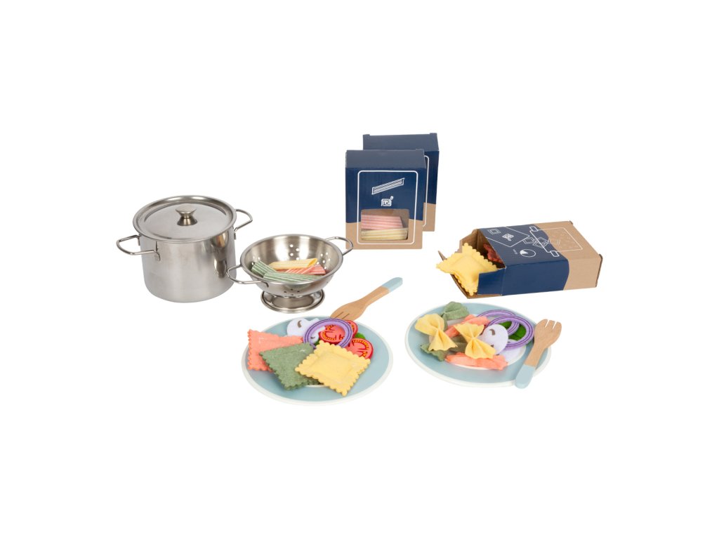 Vždy al dente! Staňte se mistry ve vaření těstovin s bohatou soupravou nádobí a rozmanitého příslušenství. V sadě naleznete atraktivní plstěné makety několika druhů těstovin a dalších přísad. Na krabičkách k ingrediencím je vyobrazen správný postup vaření, děti tak snadno znalostmi přípravy oslní návštěvu. Nádobí je realisticky vyrobené z kovu a skvěle doplní každou dětskou kuchyňku. Nezbytnou součástí je i servis, s jehož pomocí mohou děti rozvíjet sociální dovednosti. Hlavní vlastnosti:hrnec s víkem, cedník, 2 talíře, 2 vidličky, 3 balení těstovin a 12 maket přísadrealistické a odolné provedení