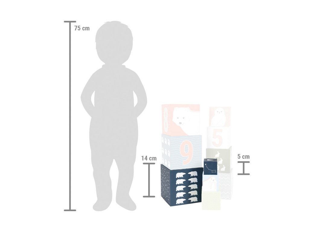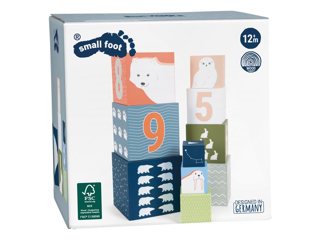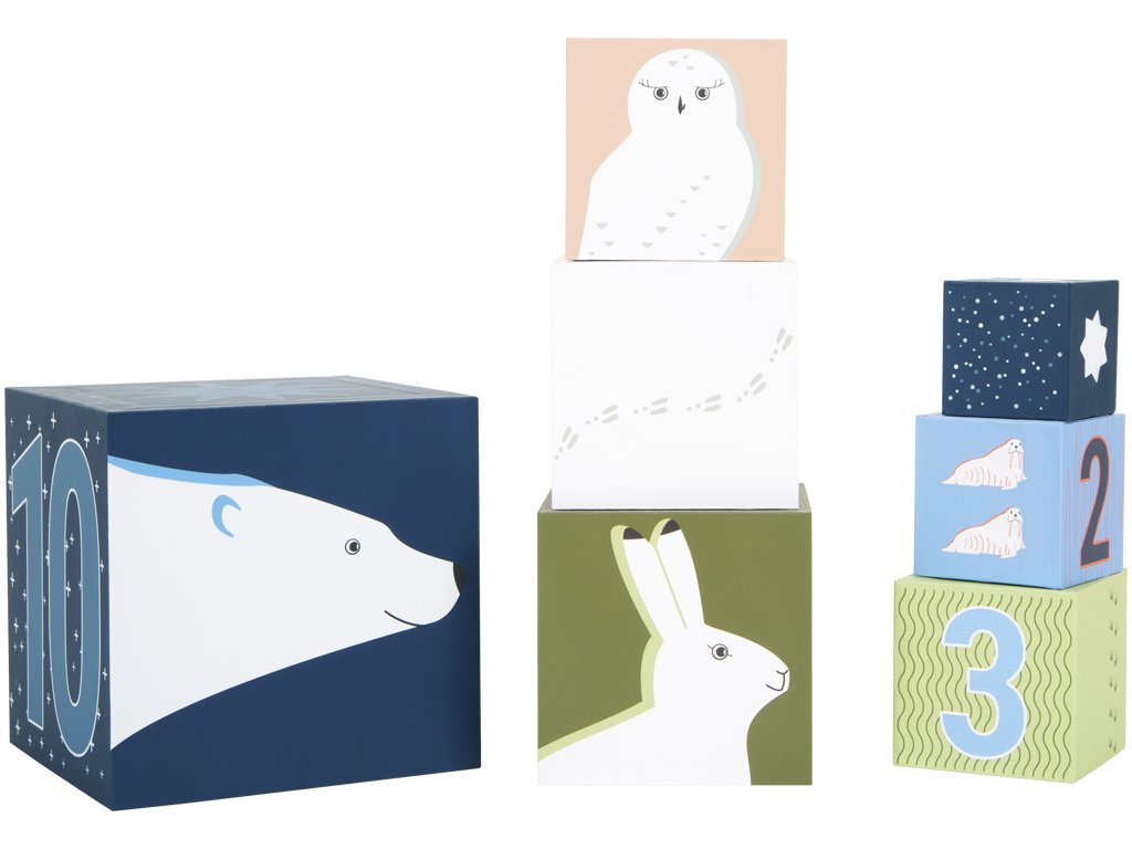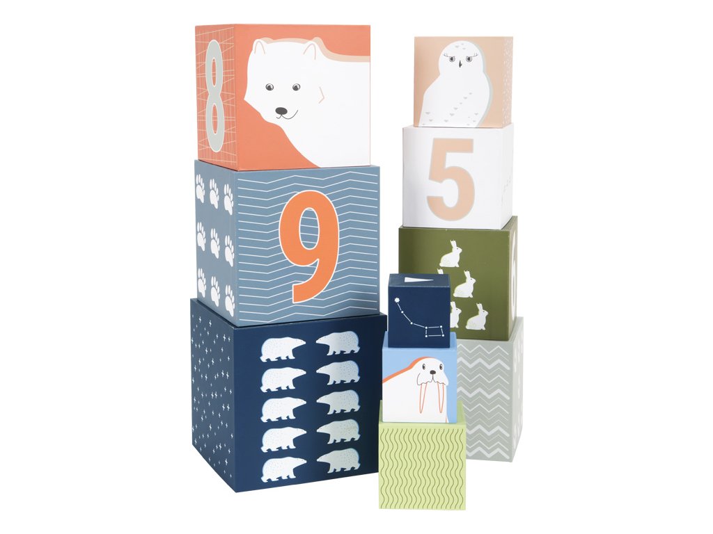 S deseti stohovacími kostkami z odolného kartonu s certifikátem FSC® ve vzhledu arktické krajiny mohou malí stavitelé vyzkoušet své stohovací dovednosti a hravě objevovat zvířata severního polárního kruhu. Každá kostka má na sobě natištěno příslušné pořadové číslo odpovídající počtu spočitatelných motivů. Ty zahrnují roztomilé portréty známých polárních zvířat na jedné straně a stopy, které tato zvířata zanechávají ve sněhu, na straně druhé. Design kostek doplňují abstraktní vzory vycházející z arktického prostředí. Na horní straně každé kostky je umístěna "polární hvězda" s počtem výstupků odpovídajícím příslušné kostce. Svět plný čísel, zvířat a dobrodružství! "Arktické" stohovací kostky mají nejen moderní design, ale nabízejí také hravý a obzvláště názorný způsob, jak si procvičit počítání a rozvíjet porozumění číslům a množství. Díky svému designu přinášejí dobrodružství a učení do každého dětského pokoje. Při třídění a skládání arktických kostek si i ti nejmenší procvičují motoriku, soustředění a zručnost a zároveň rozvíjejí chápání barev a velikostí. Po skončení hraní lze kostky zasunout do sebe a uložit pro úsporu místa. Motorická řada hraček "Arktida" je věnována šesti zvířecím kamarádům a jejich životu v mrazivém prostředí Arktidy: majestátnímu lednímu medvědovi, hravému mroži, zvědavému tuleni, hbitému polárnímu zajíci, moudré sněžné sově a mazané polární lišce. Všichni obyvatelé Arktidy nosí charakteristické bílé zimní oblečení a jsou obzvláště oblíbení jako verze klasických batolecích motivů, jako jsou medvěd, zajíc, liška, sova a tuleň. Hlavní vlastnosti: kostky s certifikací FSC® poskytuje počáteční pochopení zvířat, čísel, barev a velikostíkostky lze zasunout do sebe a uložit pro úsporu místas roztomilými motivy arktické divočinys čísly od 1-10 a portréty zvířat