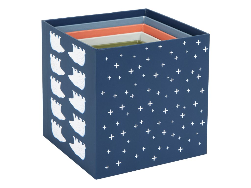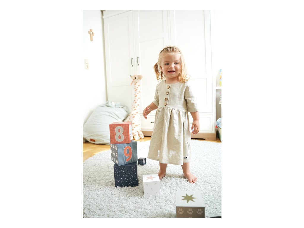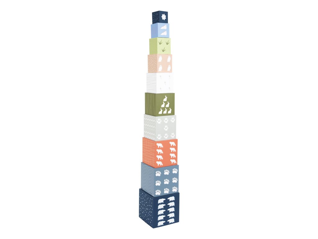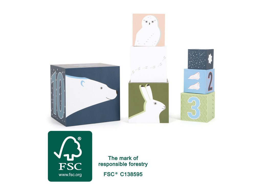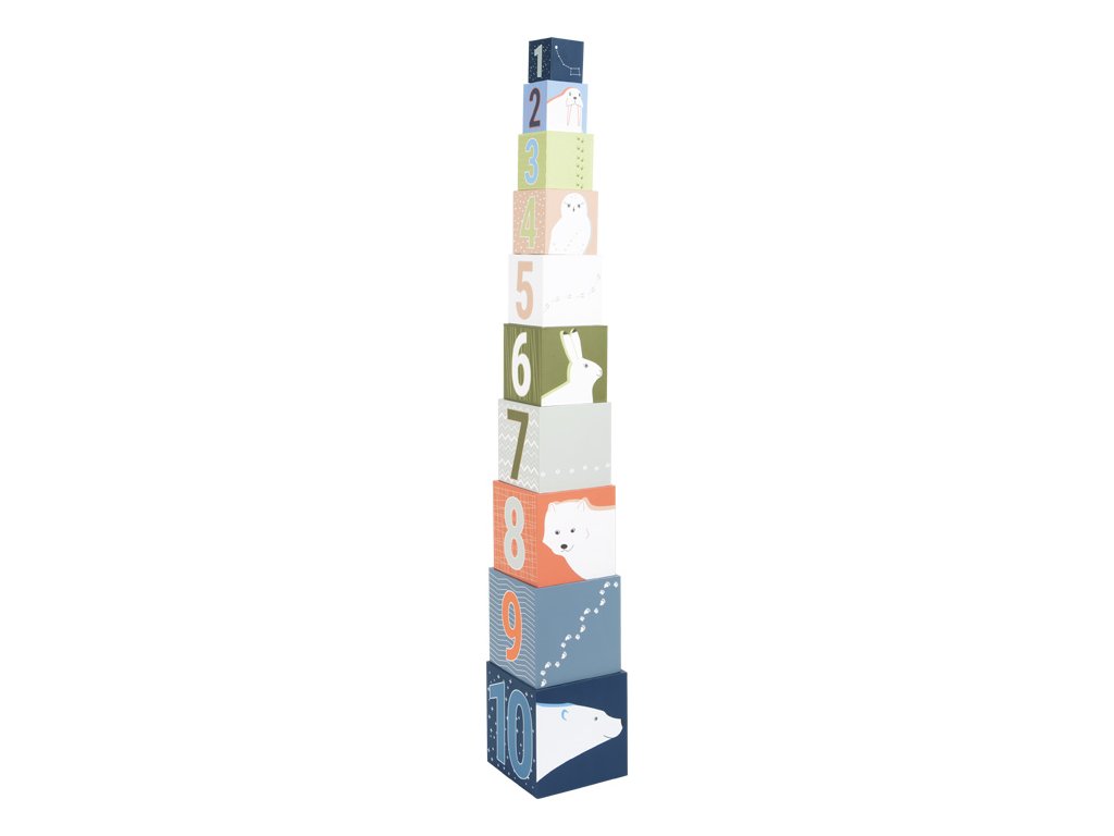 S deseti stohovacími kostkami z odolného kartonu s certifikátem FSC® ve vzhledu arktické krajiny mohou malí stavitelé vyzkoušet své stohovací dovednosti a hravě objevovat zvířata severního polárního kruhu. Každá kostka má na sobě natištěno příslušné pořadové číslo odpovídající počtu spočitatelných motivů. Ty zahrnují roztomilé portréty známých polárních zvířat na jedné straně a stopy, které tato zvířata zanechávají ve sněhu, na straně druhé. Design kostek doplňují abstraktní vzory vycházející z arktického prostředí. Na horní straně každé kostky je umístěna "polární hvězda" s počtem výstupků odpovídajícím příslušné kostce. Svět plný čísel, zvířat a dobrodružství! "Arktické" stohovací kostky mají nejen moderní design, ale nabízejí také hravý a obzvláště názorný způsob, jak si procvičit počítání a rozvíjet porozumění číslům a množství. Díky svému designu přinášejí dobrodružství a učení do každého dětského pokoje. Při třídění a skládání arktických kostek si i ti nejmenší procvičují motoriku, soustředění a zručnost a zároveň rozvíjejí chápání barev a velikostí. Po skončení hraní lze kostky zasunout do sebe a uložit pro úsporu místa. Motorická řada hraček "Arktida" je věnována šesti zvířecím kamarádům a jejich životu v mrazivém prostředí Arktidy: majestátnímu lednímu medvědovi, hravému mroži, zvědavému tuleni, hbitému polárnímu zajíci, moudré sněžné sově a mazané polární lišce. Všichni obyvatelé Arktidy nosí charakteristické bílé zimní oblečení a jsou obzvláště oblíbení jako verze klasických batolecích motivů, jako jsou medvěd, zajíc, liška, sova a tuleň. Hlavní vlastnosti: kostky s certifikací FSC® poskytuje počáteční pochopení zvířat, čísel, barev a velikostíkostky lze zasunout do sebe a uložit pro úsporu místas roztomilými motivy arktické divočinys čísly od 1-10 a portréty zvířat