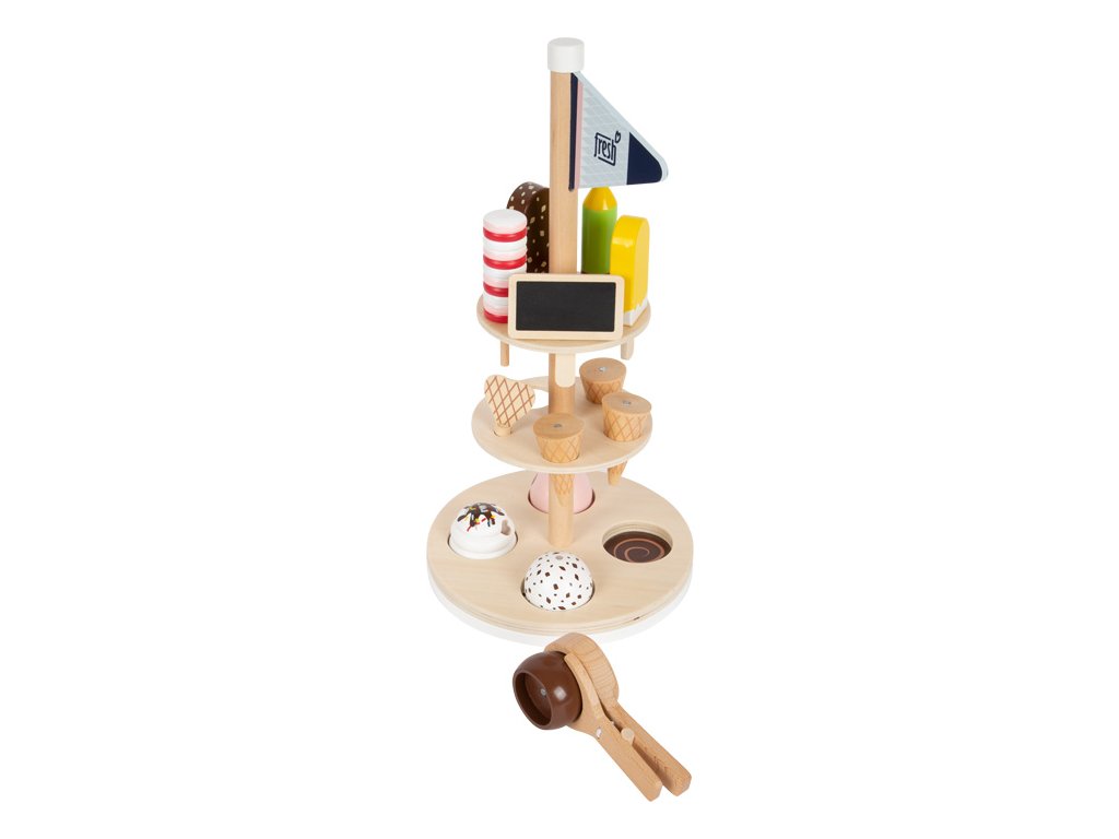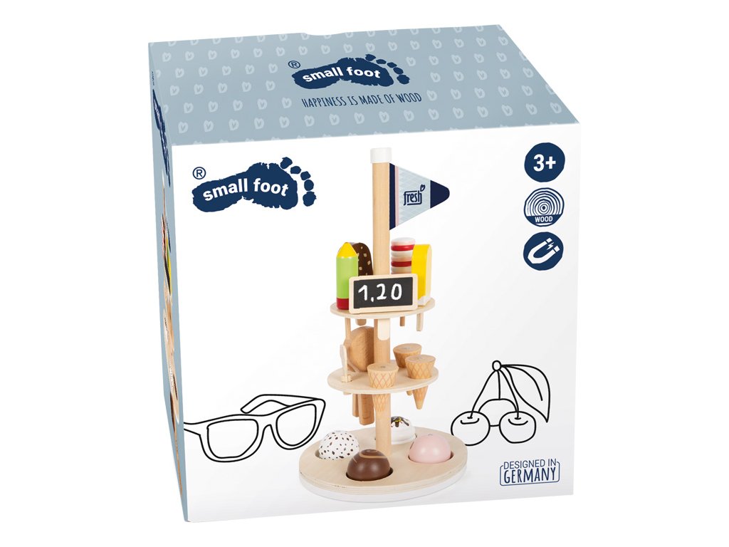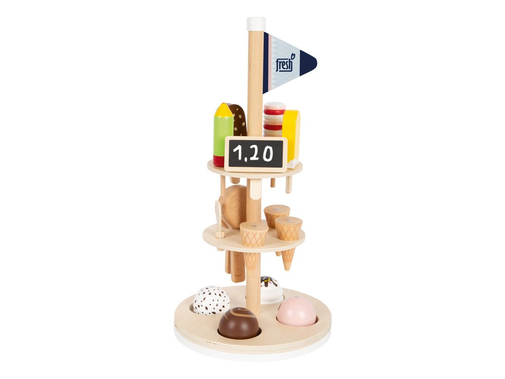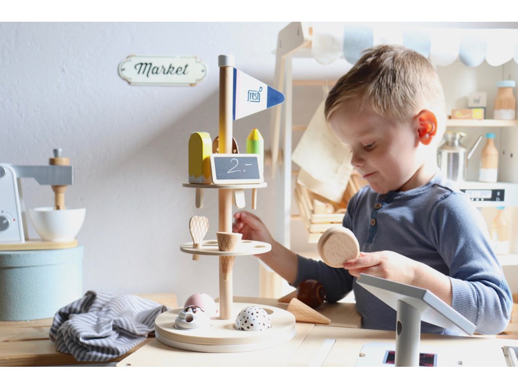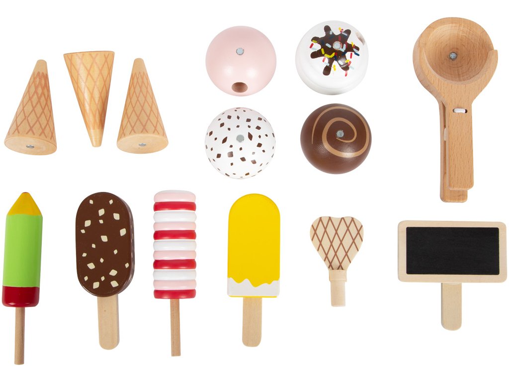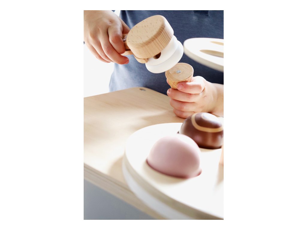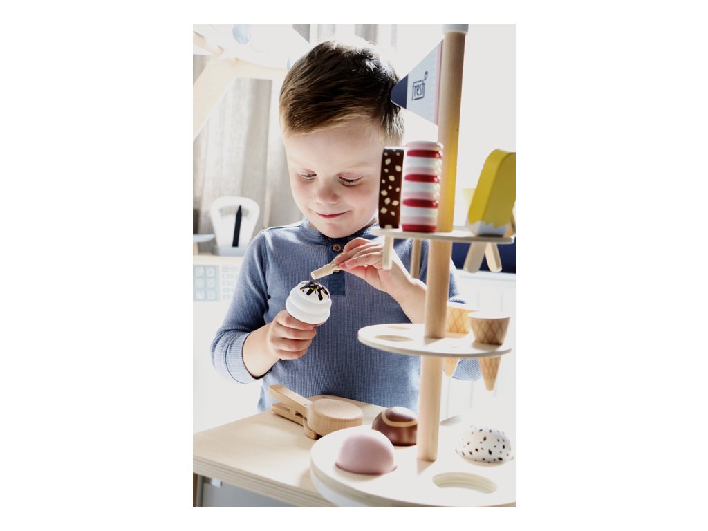 Naběračka zmrzliny s magnetickou funkcí. 8 různých druhů zmrzliny, od nanuků po lahodnou zmrzlinu. Kopečky zmrzliny jsou stohovatelné a vybavené magnety. Vaflová srdíčka a porce šlehačky na ozdobu zmrzlinových výtvorů. Všechny části zmrzlin se vejdou do barevně rozlišených míst na stojanu. Genderově neutrální, neokázalé barevné schéma se spoustou viditelného dřevěného materiálu. Dodává se s křídovou tabulkou na zapisování. Ideální doplněk k multifunkčnímu obchodu a dalším potravinám na hraní z produktové řady Fresh. Hlavní vlastnosti: Díly jsou opatřeny magnetyNa stojanu má vše své místoRozvíjí komunikační a sociální dovednosti dítěte