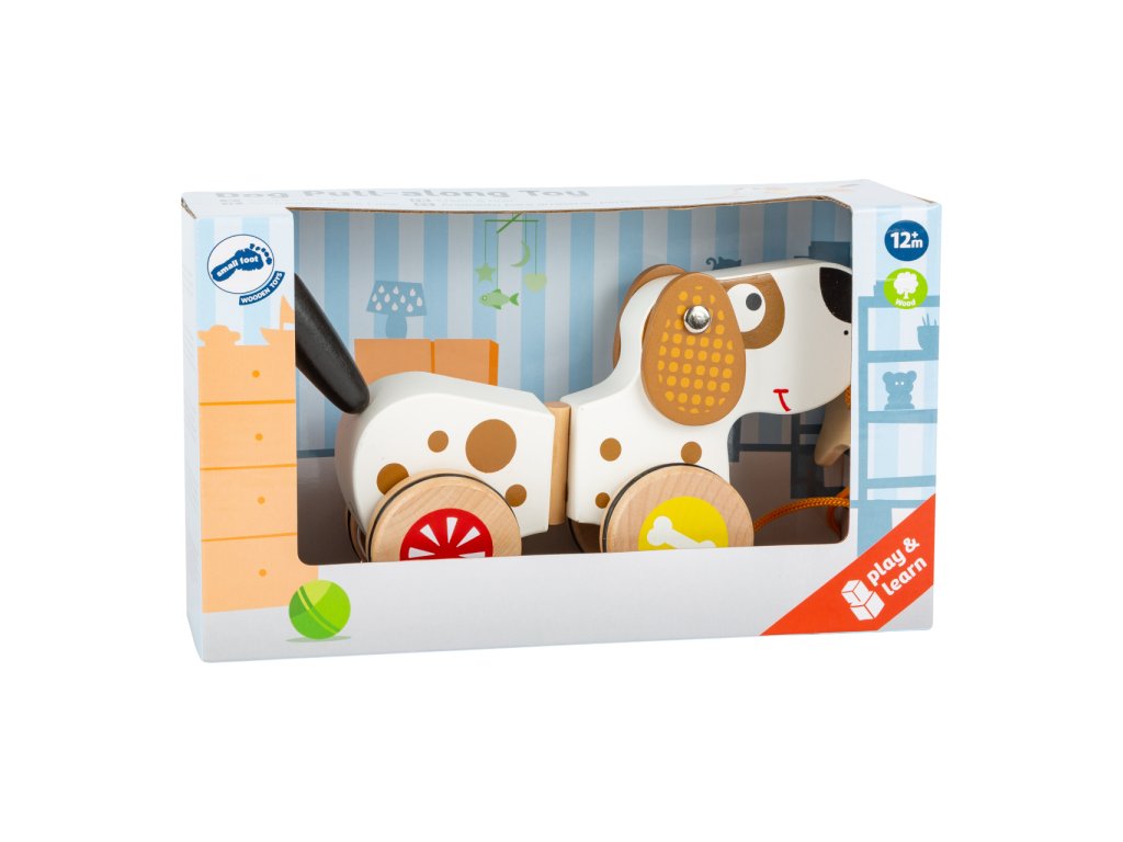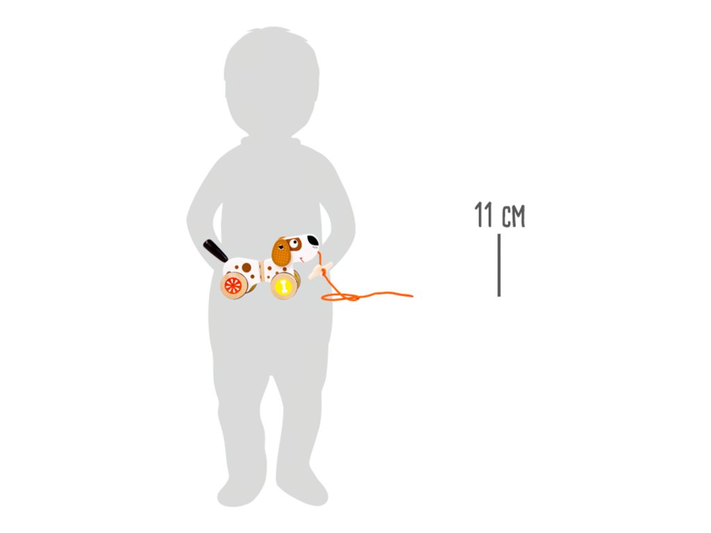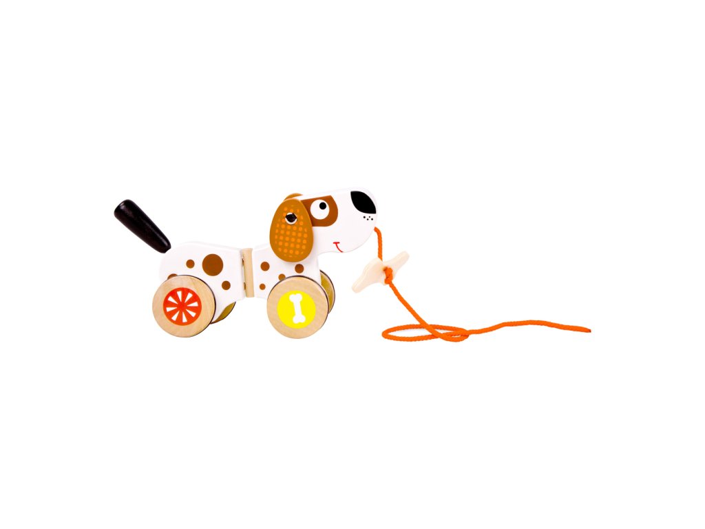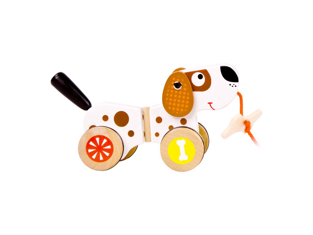 Ti nejmenší mohou tohoto roztomilého pejska táhnout za sebou. Díky gumovým kroužkům na pneumatikách je pejsek velmi tichý. Při jízdě vrtí ocáskem a jako odměna mu slouží kost na provázku. Malé děti mohou tohoto pejska tahat za sebou. Hlavní vlastnosti: na provázkurozvíjí koordinaci pohybů dětís gumovým proužkem pro tichý chod