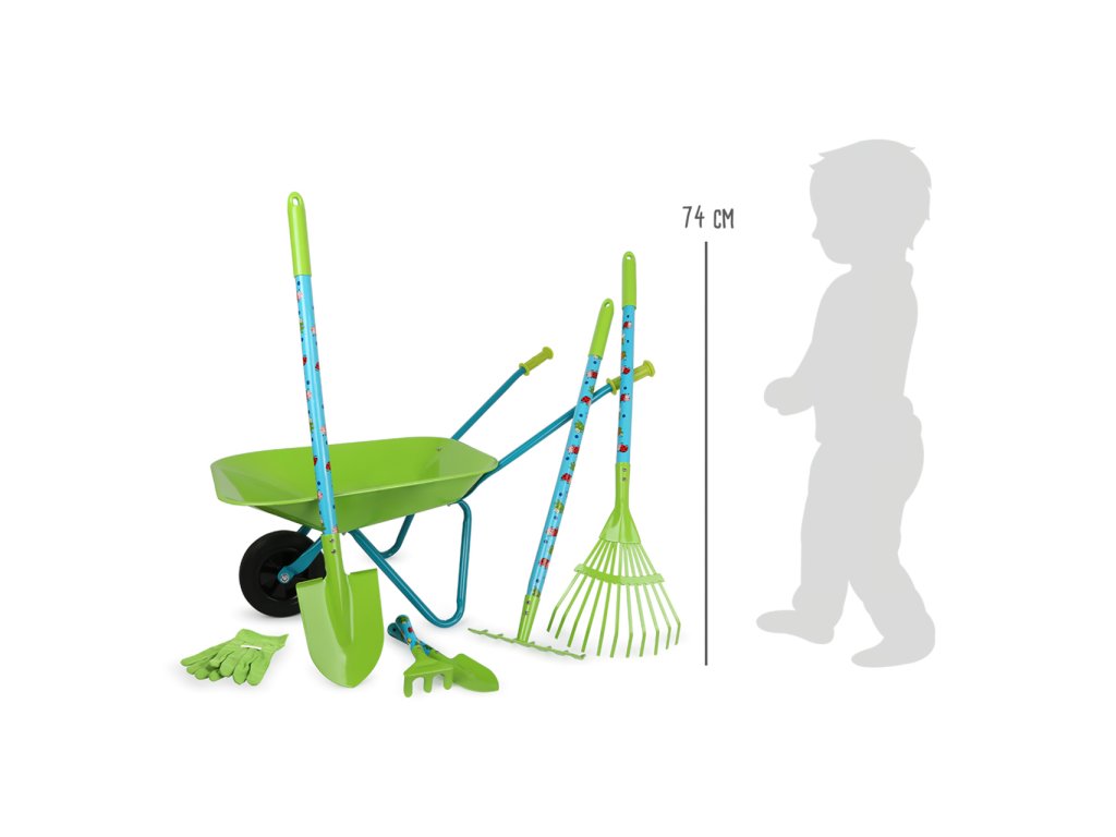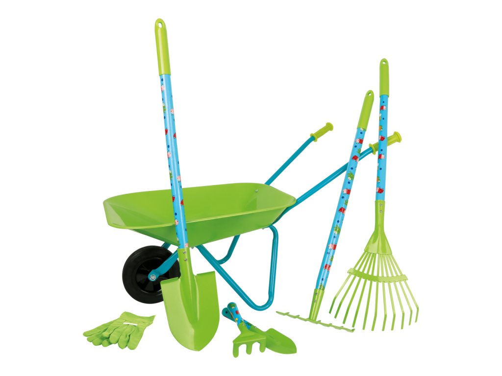 Hurá na zahradu! Mladí zahradkáři Vám rádi pomohou s touto velkou sadou zahradního nářadí. Stačí si nasadit rukavice a mohou začít motykou, hráběmi, rýčem, kolečkem a dalšími nástroji pomáhat a rozvíjet své zahradnické zkušenosti. Všechny díly jsou vyrobeny z vysoce kvalitního, jemně opracovaného kovu a díky svému dětskému designu a jarním barvám potěší každého malého zahrádkáře. Hlavní vlastnosti: součástí balení je vše dle obrázkuideální velikost pro dětirozvíjí motoriku, rovnováhu a vztah k příroděvyrobeno z kvalitních materiálů kovu a dřevakolečko má plastové kolo s pevnou bezvzduchovou gumovou pneumatikou
