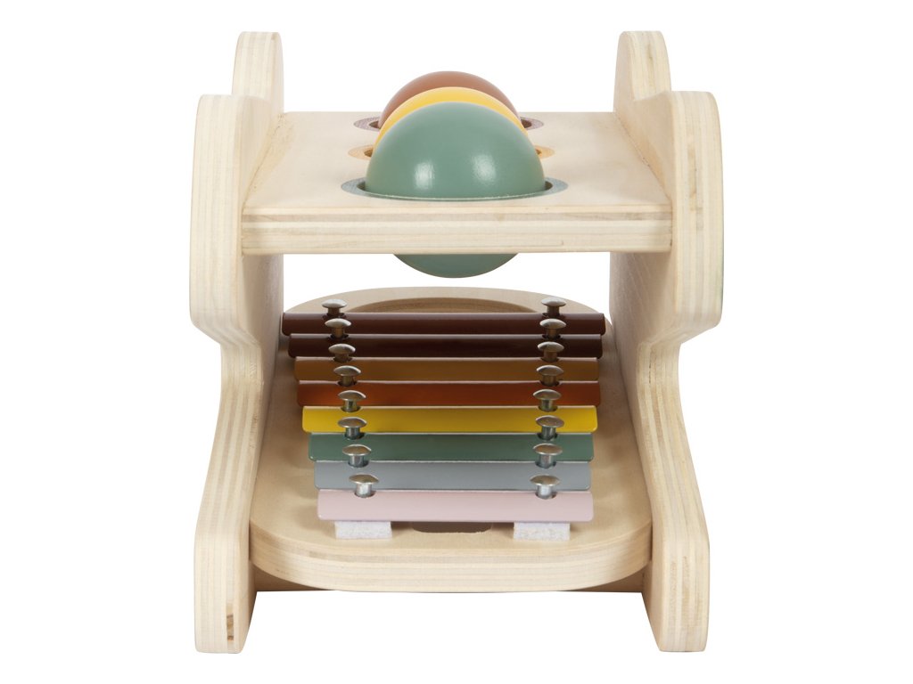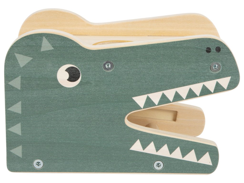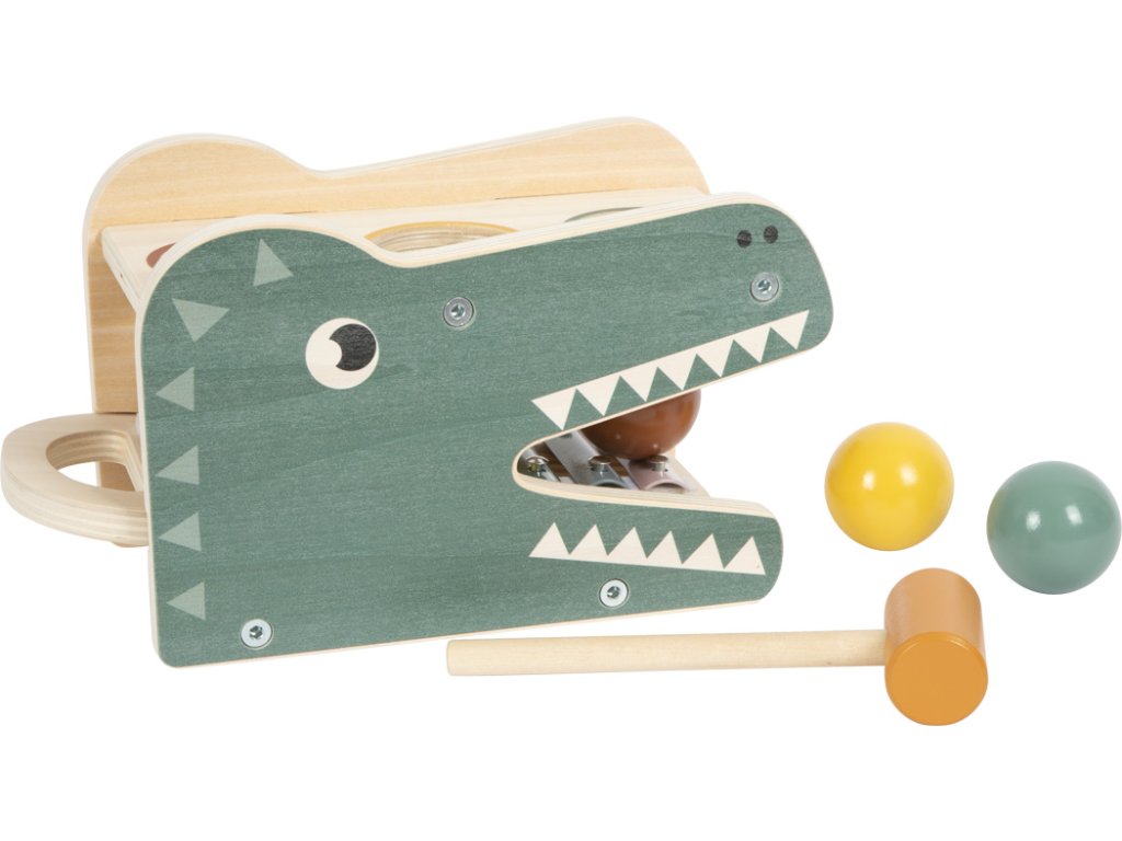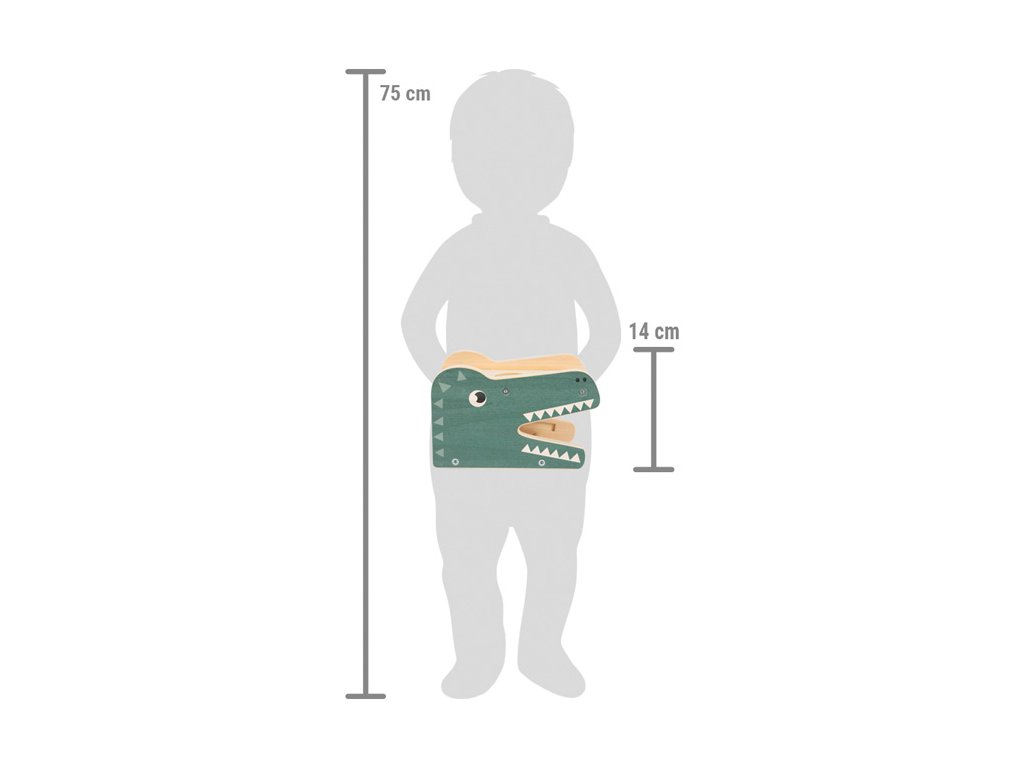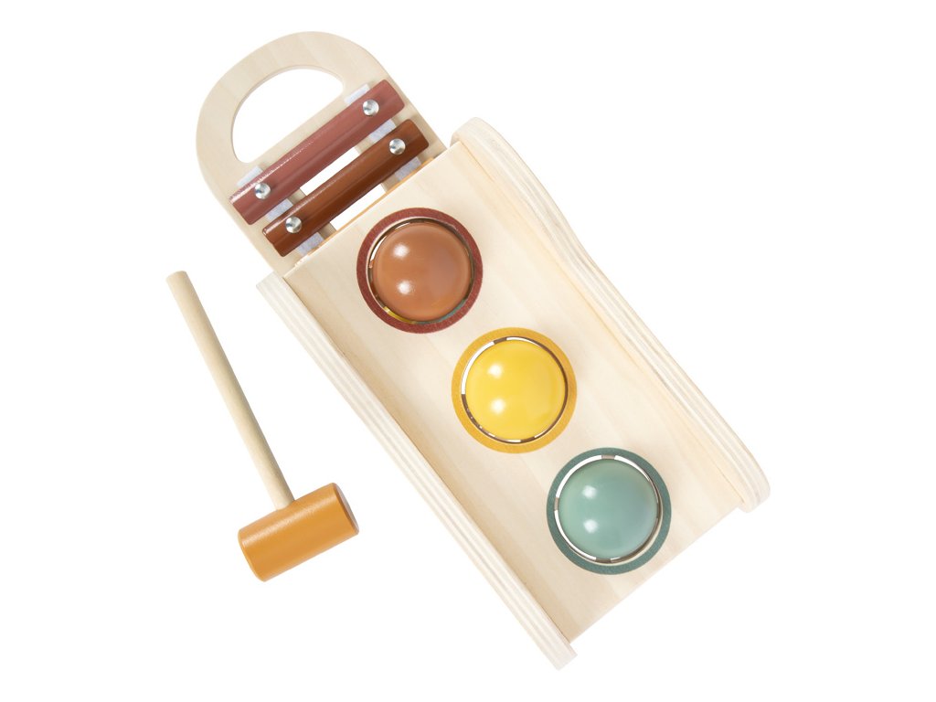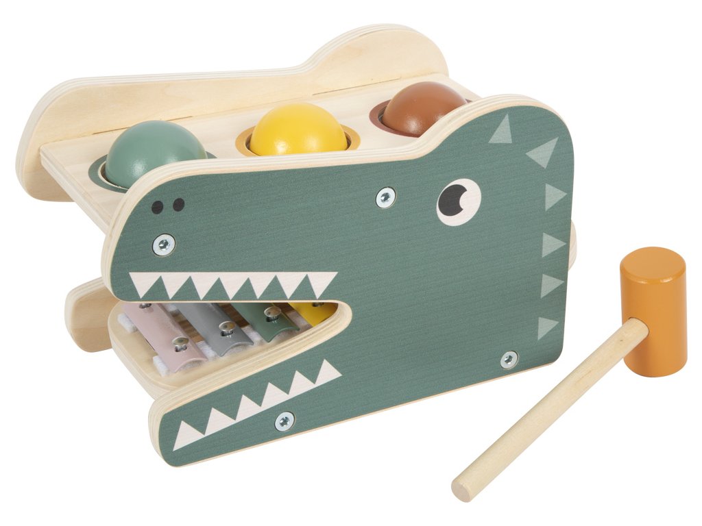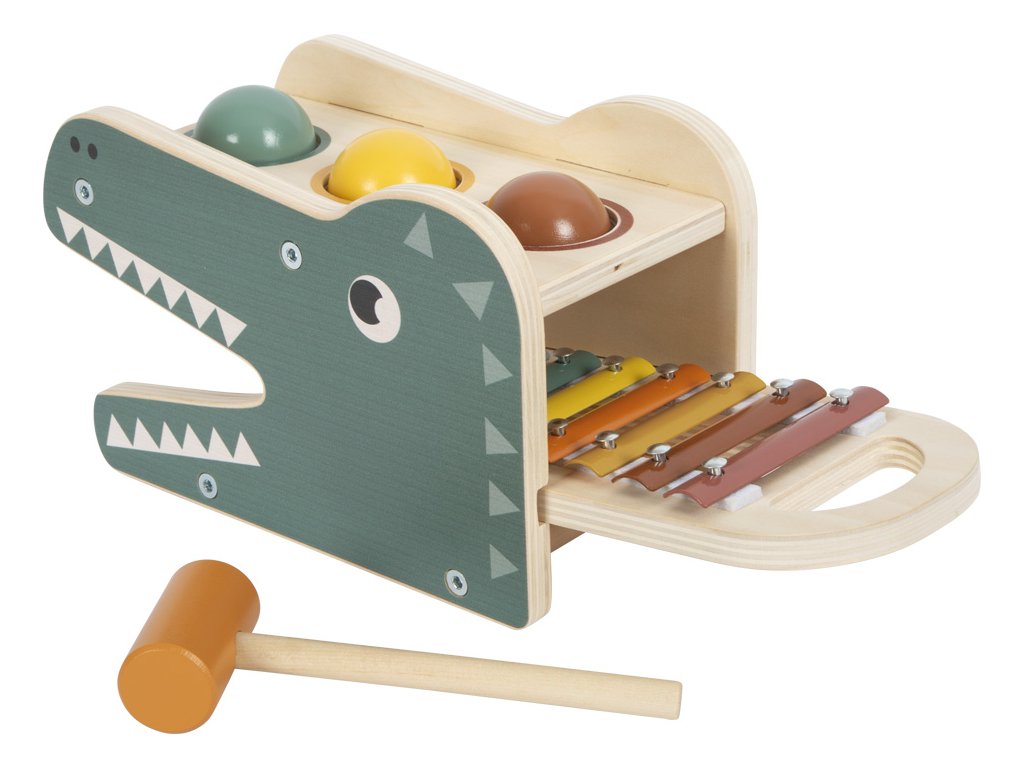 Xylofon a zatloukací hračka 2v1 jsou dvě samostatné, ale propojené hračky, které nabízejí dětem možnost objevovat hudbu a současně rozvíjet motorické dovednosti. Tento roztomilý krokodýl vyrobený z odolného dřeva s integrovaným xylofonem je dvakrát zábavnější. Tři dřevěné koule lze prorazit otvory v horní části pomocí kladiva a vytvářet vzrušující zvuky na xylofonu, když se koule kutálí dolů. Xylofon s barevně odlišenými klávesy lze vyjmout a hrát samostatně. Tato zatloukací lavice a xylofon nabízí ideální úvod do světa zvuků. Při muzicírování trénuje xylofon nejen akustické vnímání, ale i smysl pro rytmus a takt a prvotní porozumění tónům. Zatloukačka trénuje motoriku a hravou formou učí princip příčiny a následku. Hlavní vlastnosti: roztomilá klepací hra ve tvaru krokodýla s integrovaným xylofonemkreativní a multifunkční hračkaxylofon je odnímatelný a lze jej hrát samostatnětrénuje motoriku a koordinaci ruka-okotrénuje smysl pro rytmus a takt a podporuje počáteční porozumění zvukůmideální pro doplnění s dalšími motorickými hračkami z řady „Safari“