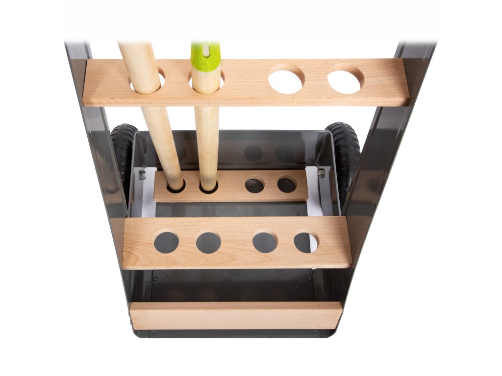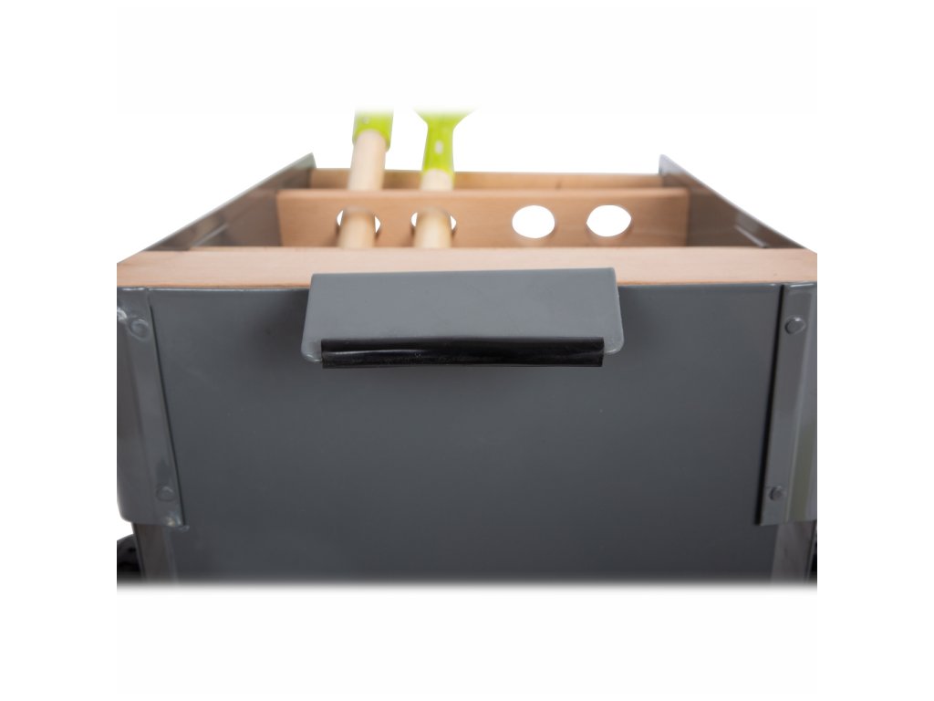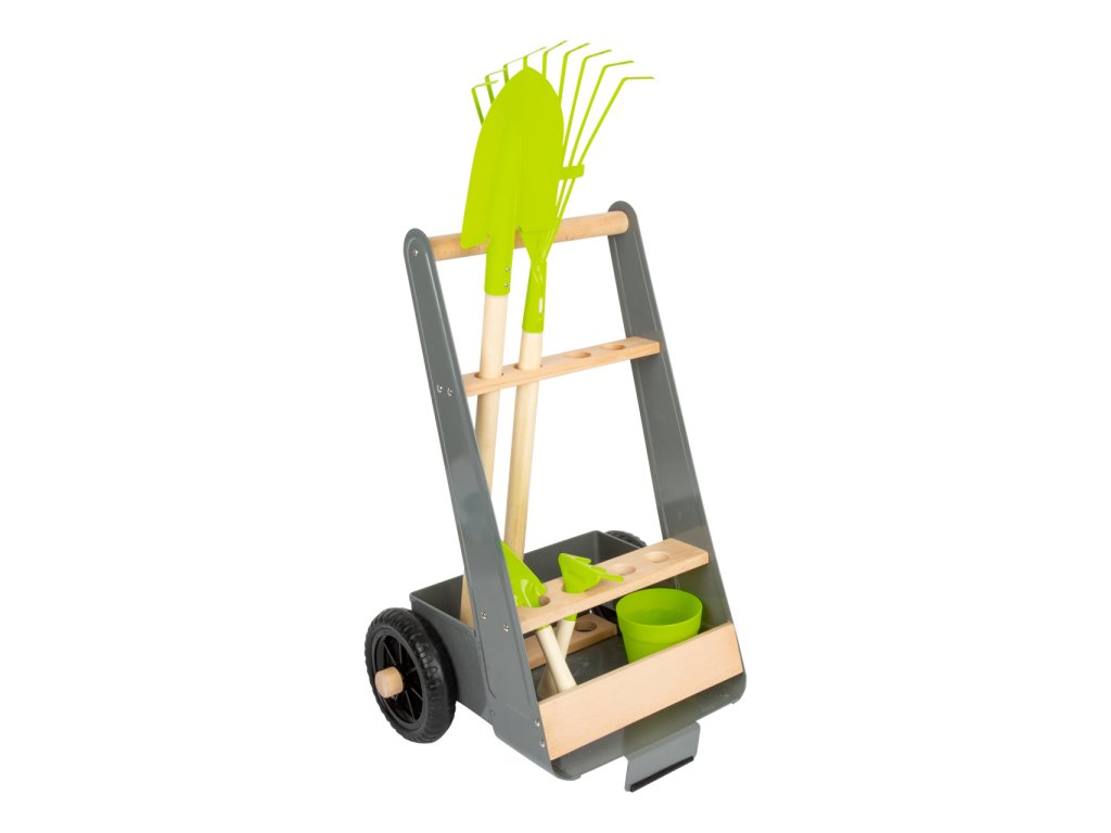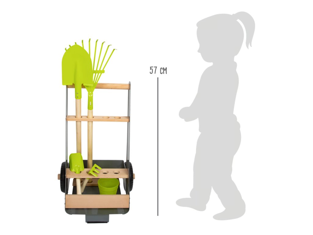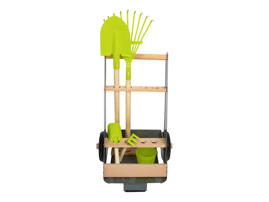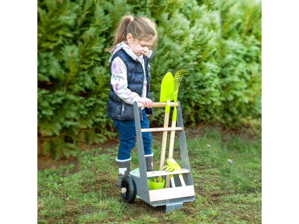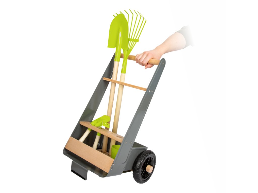 Mladí nadšení zahradníci a zahradnice teď mohou začít pracovat na svém vysněném záhonku. Stabilní vozík vyrobený z bukového dřeva a kovu lze jednoduše tlačit či tahat po zahradě, má k tomu totiž stavěná kola. Dobře promyšlený design myslel na úložný prostor, vzhled i bezpečnost. Hrábě, rýč i lopata mohou být uloženy tak, aby směřovaly pryč od hlavy dítěte. Hlavní vlastnosti: atraktivní a robustní mix materiálů – buku a kovulehký přesun díky pevným a velkým kolůmosm otvorů pro uložení zahradního náčiníjednoduše omyvatelnýkovové nožičky opatřeny gumou pro lepší stabilituk doplňkům vozíku patří rýč, hrábě, plastový květináč, lopatka a hrabky