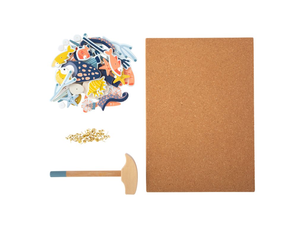 Hra pro všechny, kdo se nebojí sestoupit pod hladinu. Tvořte pomocí kladívka a hřebíčků rozmanité scény života v mořích. Dílky různých tvarů a sytých barev upoutají pozornost a podnítí fantazii dětí. Jejich upevňováním na korkovou desku pomocí kladívka mohou děti rozvíjet svou zručnost, jemnou motoriku i koordinaci rukou a zraku. Pro opakované použití a delší životnost jsou dílky opatřeny vrstvou odolného laminátu. Hřebíčky jsou přizpůsobeny neobratným dětským ručkám a opatřeny velkými hlavičkami, aby bylo snadné je trefit kladívkem, nebo scénu rozebrat. Hlavní vlastnosti:deska, dílky s potiskem, kladívko a hřebíčkyodolné provedení