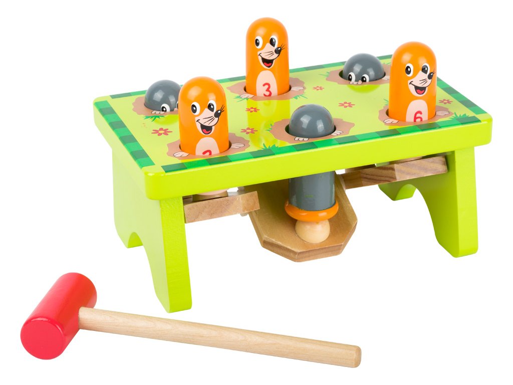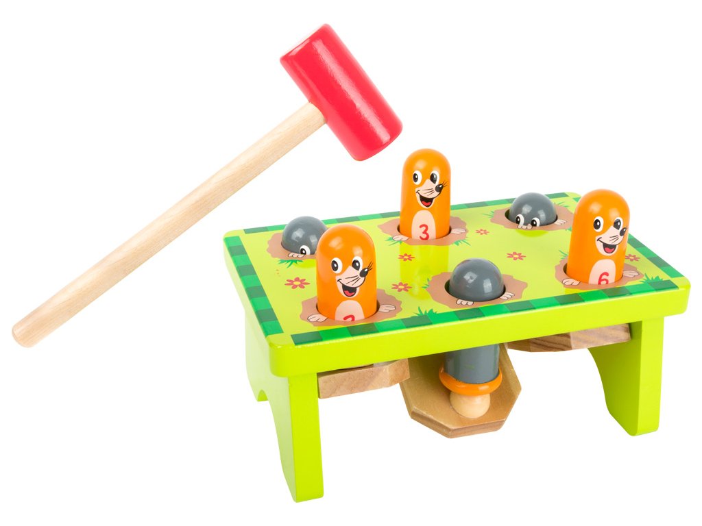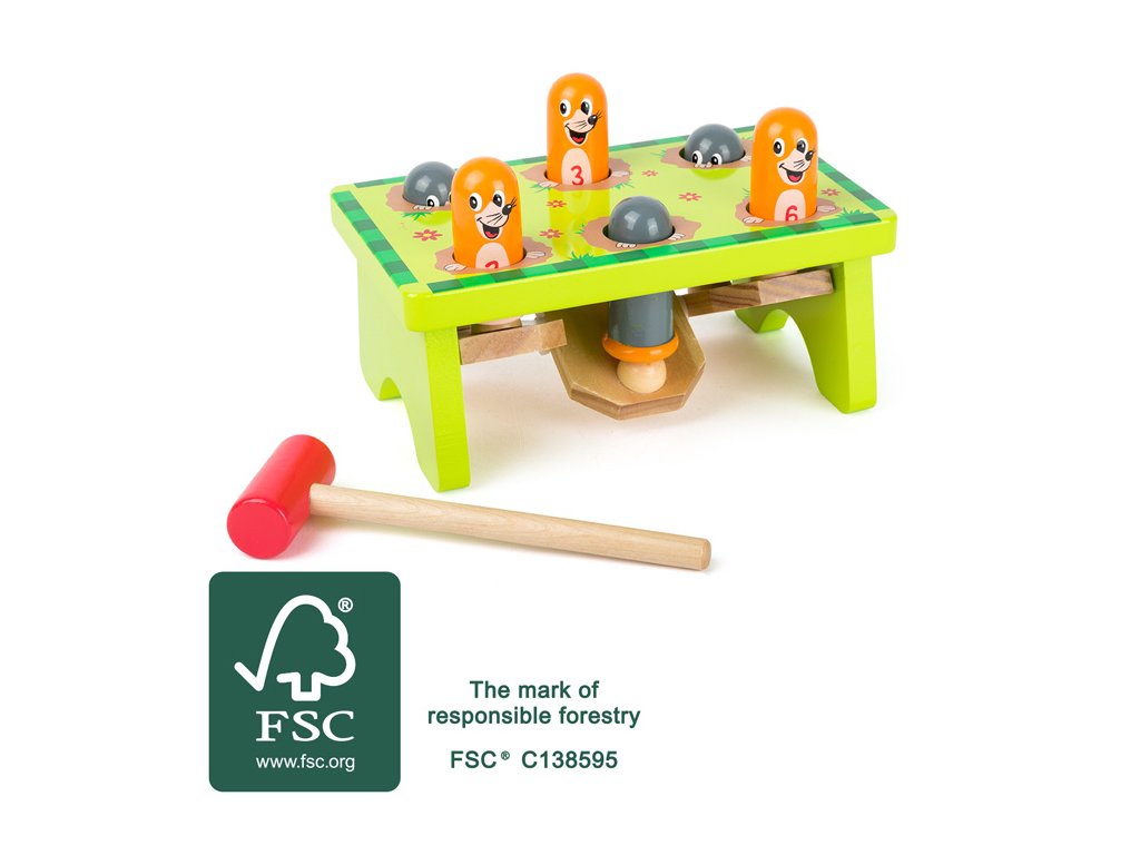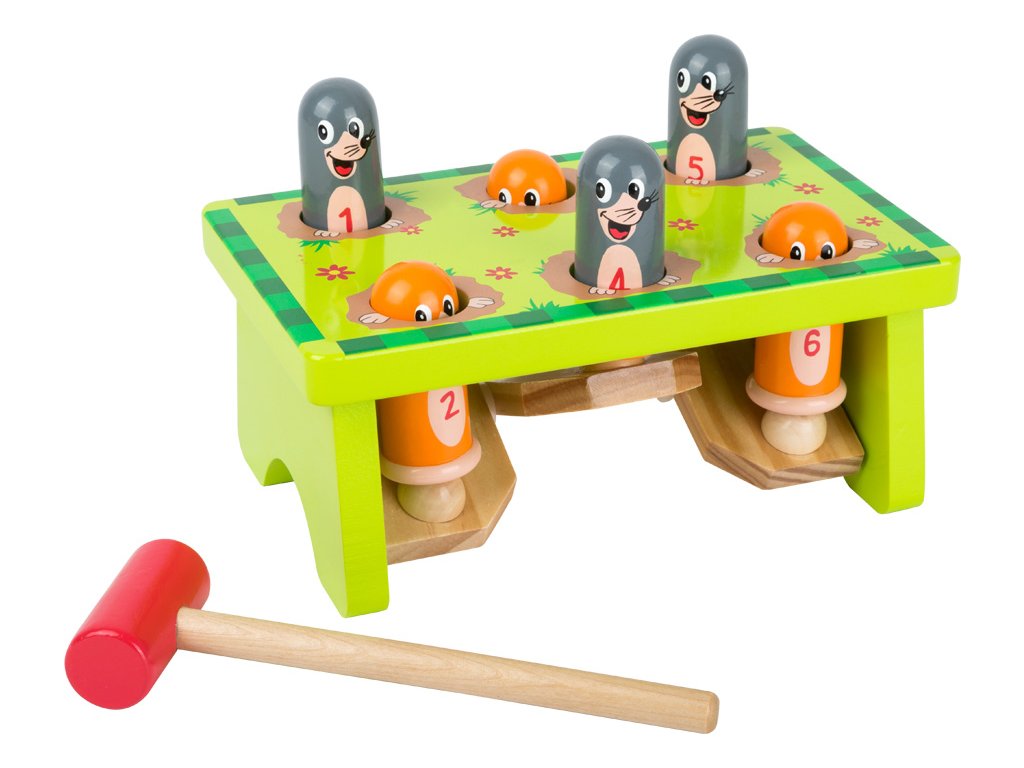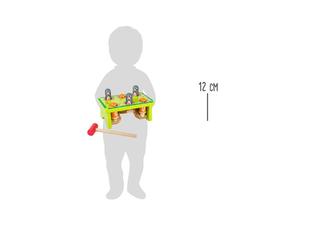 Lov krtků na zahradě začíná! Tato zábavná zatloukací hra vás zaručeně pobaví. S každým úderem kladiva na hlavu krtka vítězoslavně vykoukne další z jiné díry v zemi. S očíslovanými norami lze podpořit rozpoznávání čísel a zatloukání tak trénuje nejen motoriku a koncentraci. Hlavní vlastnosti: Zodpovědnost za kvalitu a bezpečnost, aby si děti mohly bezstarostně hrátTrénuje koordinaci pohybů, jemnou motorikuPodporuje poznávání číselVyrobeno ze 100% FSC dřeva Značka a certifikát FSC® (Forest Stewardship Council) zaručuje, že dřevo, ze kterého byl produkt vyroben, nebylo vytěženo nelegálně a pochází z lesů obhospodařovaných šetrným či přírodě blízkým způsobem, ve kterém jsou dodržovány přísné environmentální a sociální požadavky. Značka FSC® na výrobku znamená, že svým nákupem pomáháte chránit lesy a podporujete šetrné, odpovědné či přírodě blízké hospodaření, díky kterému jsou naše lesy stabilnější, zdravější, mají přirozenou druhovou skladbu a lépe odolávají negativním následkům klimatických změn.