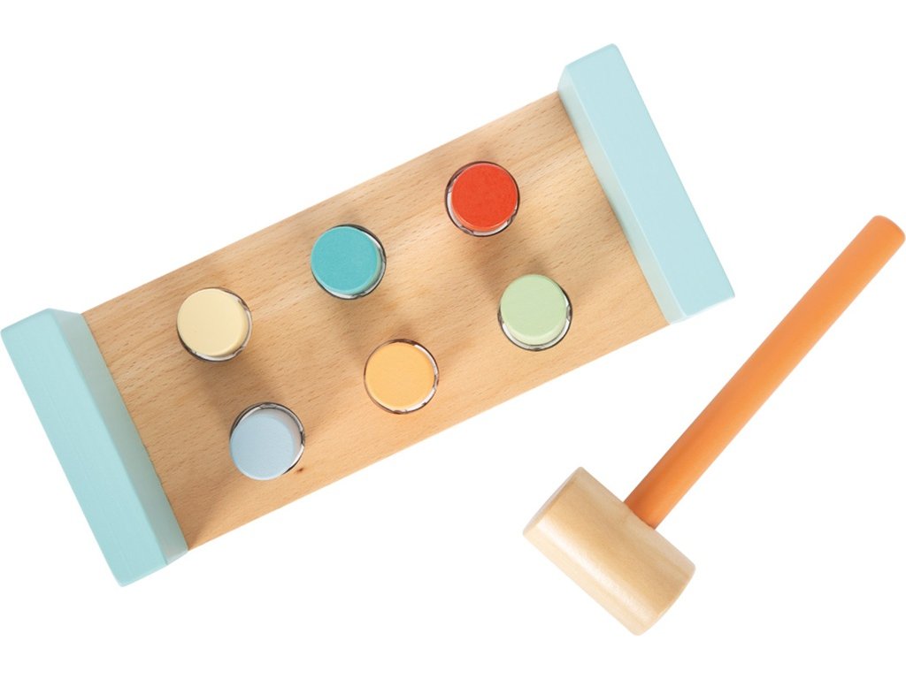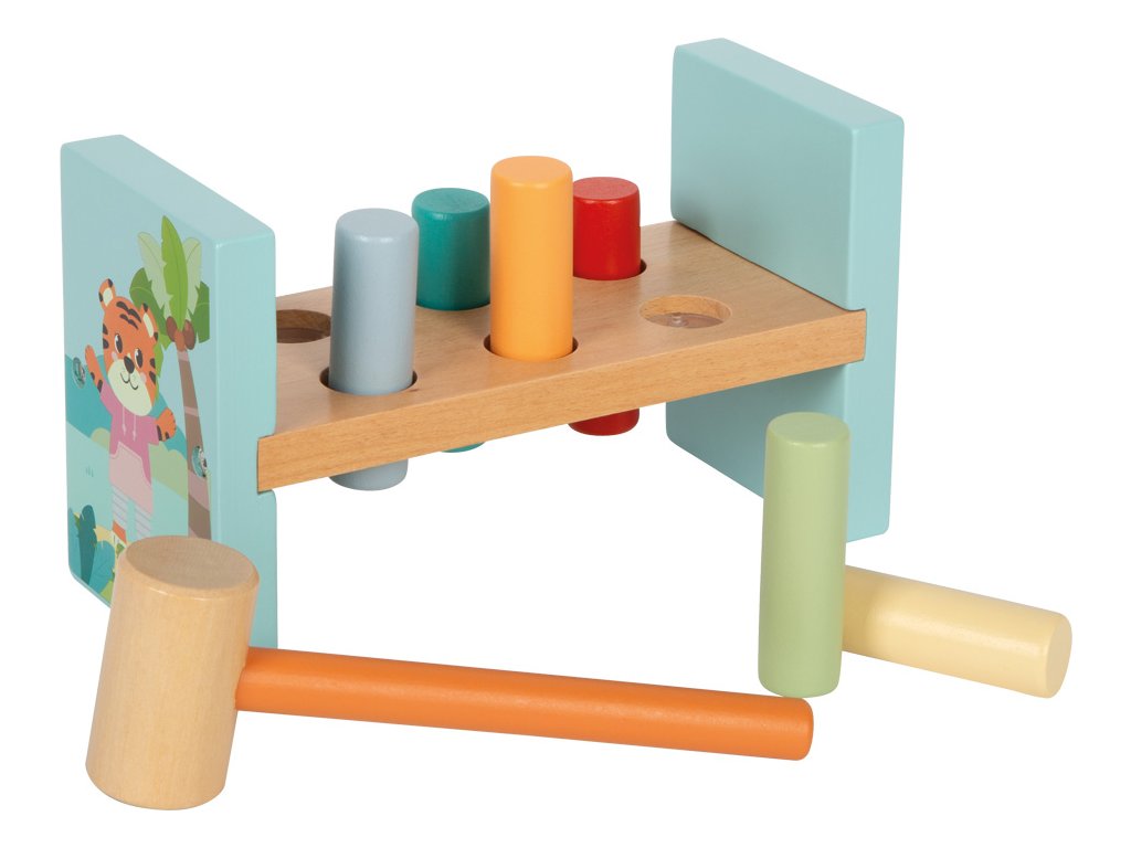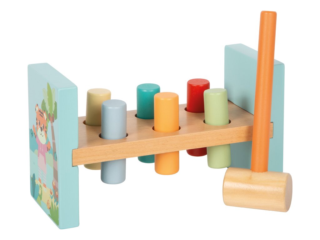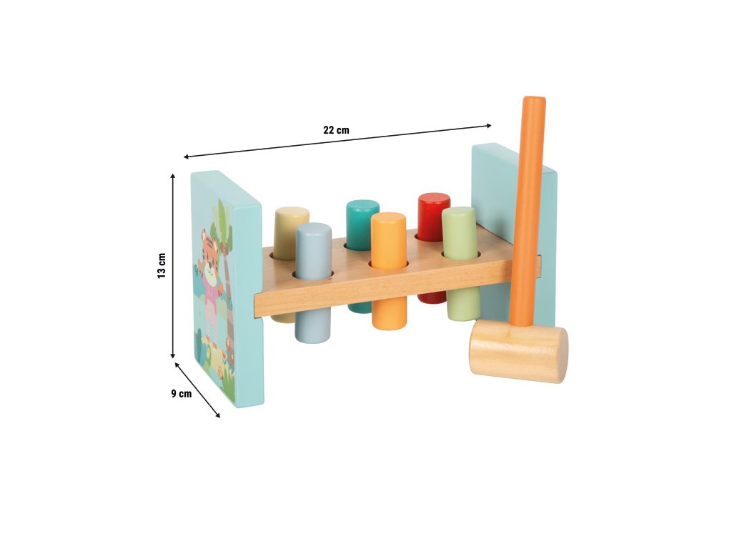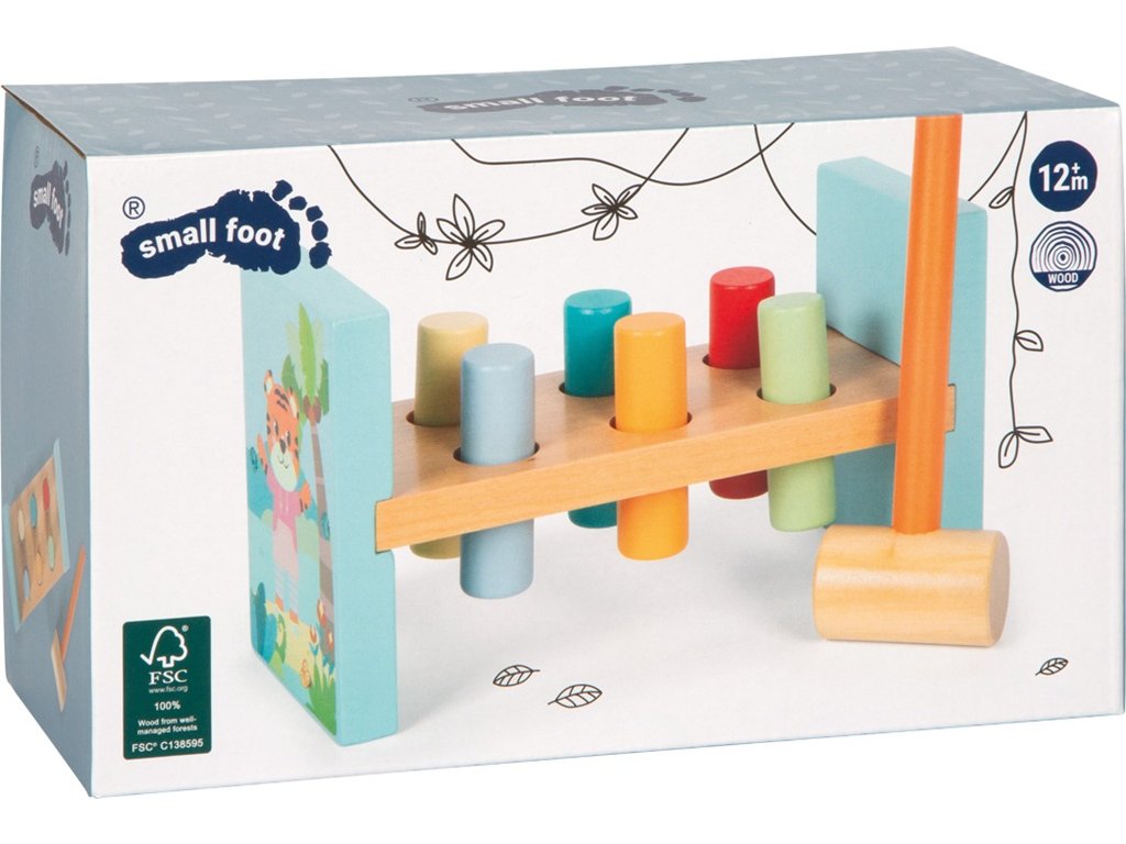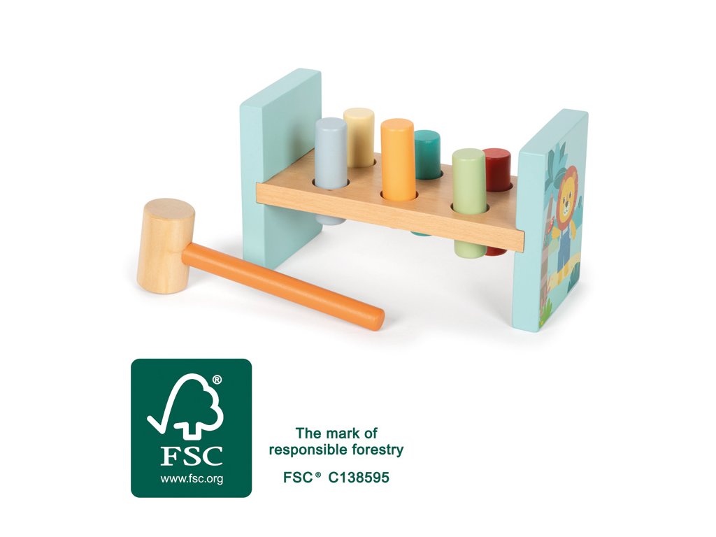 Užijte si zábavu s přáteli z džungle! Tato krásně navržená zatloukačka z 100% FSC® certifikovaného dřeva přináší do dětského pokoje hodiny radosti a hry. Děti pomocí malého kladívka zatloukají barevné dřevěné válečky skrz bezpečné gumové otvory, přičemž hravě rozvíjejí jemnou motoriku, koordinaci ruka-oko a přesné uchopení.Jakmile jsou všechny válečky zatlučené, stačí zatloukačku otočit a zábava začíná znovu! Veselé motivy zvířátek z džungle a barevné provedení podporují dětskou fantazii a zvědavost.Odolné dřevěné zpracování, dětský design a viditelný podíl přírodního dřeva zaručují, že hračka je nejen krásná, ale i robustní, bezpečná a připravená na každé dobrodružství malých objevitelů. Hlavní vlastnosti: vyrobeno ze 100% certifikovaného dřeva FSC®rozvíjí jemnou motoriku a sílu úchopuučí koordinaci pohybu, trpělivost a soustředěnímilé ilustrace zvířatpogumované otvory drží dřevěné válce na místě Značka a certifikát FSC® (Forest Stewardship Council) zaručuje, že dřevo, ze kterého byl produkt vyroben, nebylo vytěženo nelegálně a pochází z lesů obhospodařovaných šetrným či přírodě blízkým způsobem, ve kterém jsou dodržovány přísné environmentální a sociální požadavky. Značka FSC® na výrobku znamená, že svým nákupem pomáháte chránit lesy a podporujete šetrné, odpovědné či přírodě blízké hospodaření, díky kterému jsou naše lesy stabilnější, zdravější, mají přirozenou druhovou skladbu a lépe odolávají negativním následkům klimatických změn.