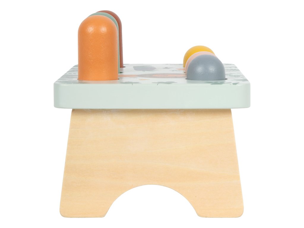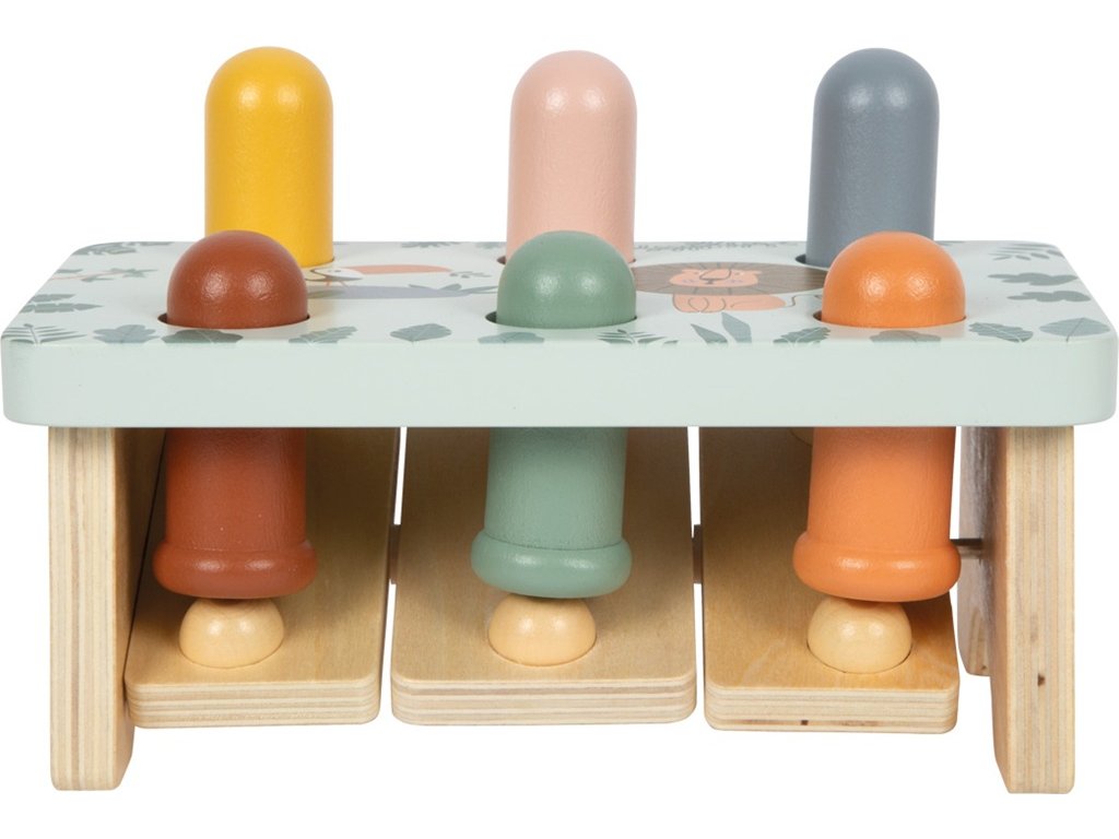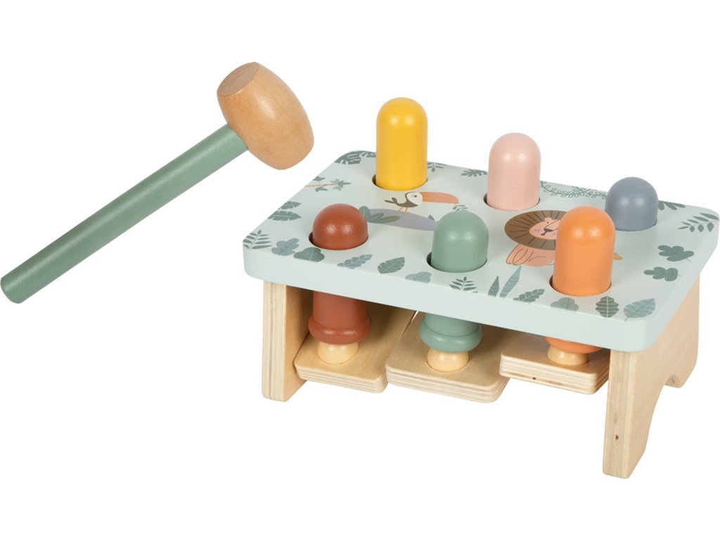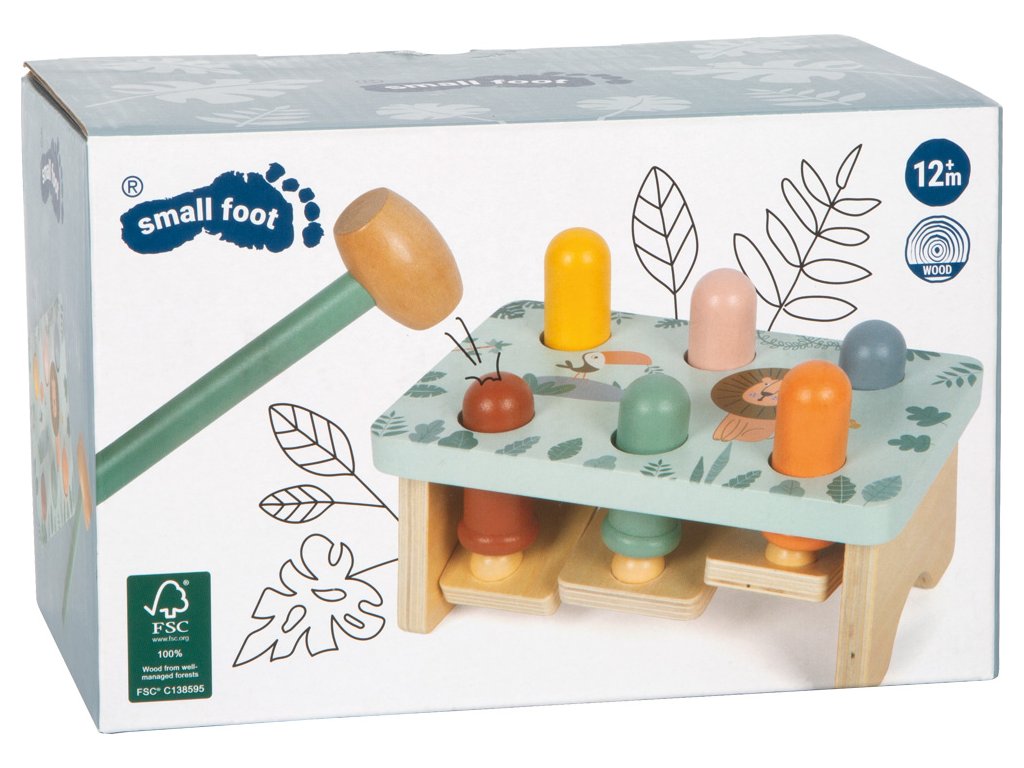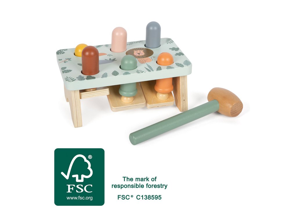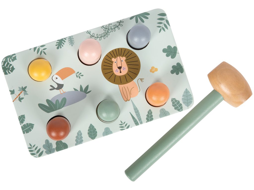 Tato nádherně zpracovaná zatloukací hra v safari stylu je vyrobena ze 100% FSC® certifikovaného dřeva a zve děti ke hraní plnému překvapení! Pomocí kladívka děti zatloukají dřevěné kolíčky do lavičky, a právě tehdy přichází ten správný efekt, když zatlučou jeden kolík, na opačné straně vyskočí druhý! Roztomilé zvířecí motivy a moderní barevné provedení podněcují dětskou fantazii a chuť objevovat. Pohyblivé kolíčky zároveň dětem ukazují princip příčiny a následku, ideální pro hravé učení. Tato hračka je dlouhotrvajícím společníkem, který spojuje radost ze hry s rozvojem důležitých dovedností a navíc skvěle vypadá! Hlavní vlastnosti: vyrobeno ze 100% FSC® certifikovaného dřevapodporuje rychlé reakce, motoriku a koordinaci ruka-okopevné a odolné zpracováníkladívko padne skvěle do dětských ručičekkrásný designstimuluje dětskou fantazii Značka a certifikát FSC® (Forest Stewardship Council) zaručuje, že dřevo, ze kterého byl produkt vyroben, nebylo vytěženo nelegálně a pochází z lesů obhospodařovaných šetrným či přírodě blízkým způsobem, ve kterém jsou dodržovány přísné environmentální a sociální požadavky. Značka FSC® na výrobku znamená, že svým nákupem pomáháte chránit lesy a podporujete šetrné, odpovědné či přírodě blízké hospodaření, díky kterému jsou naše lesy stabilnější, zdravější, mají přirozenou druhovou skladbu a lépe odolávají negativním následkům klimatických změn.